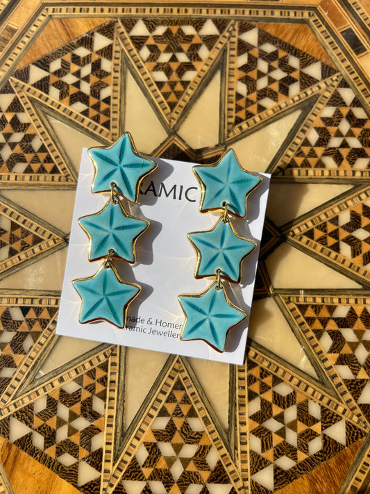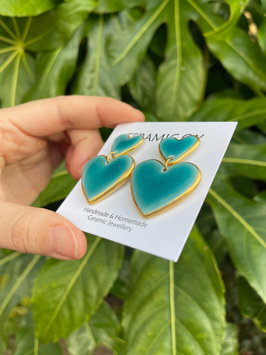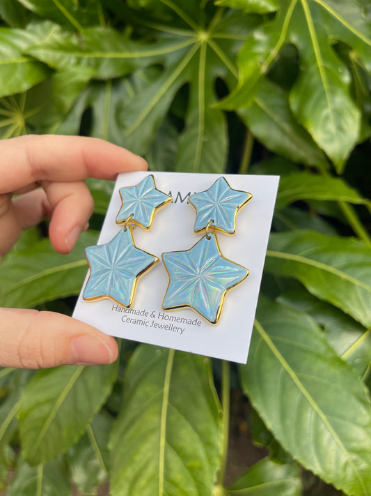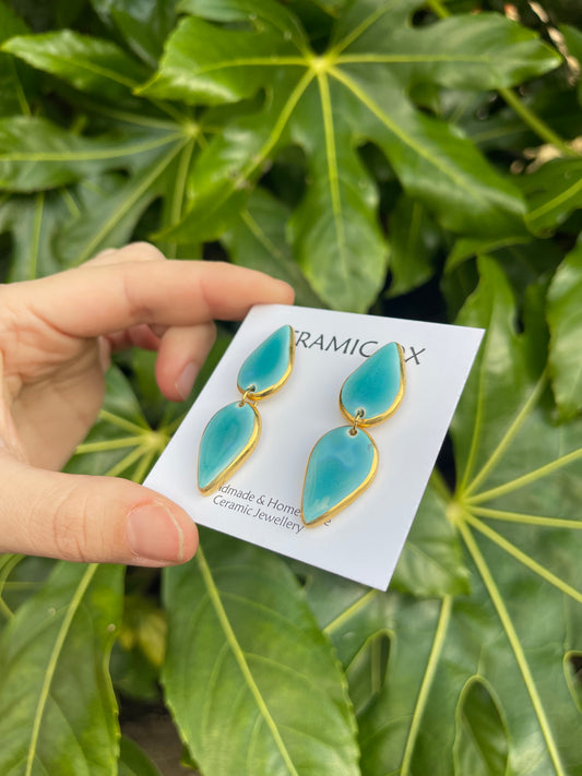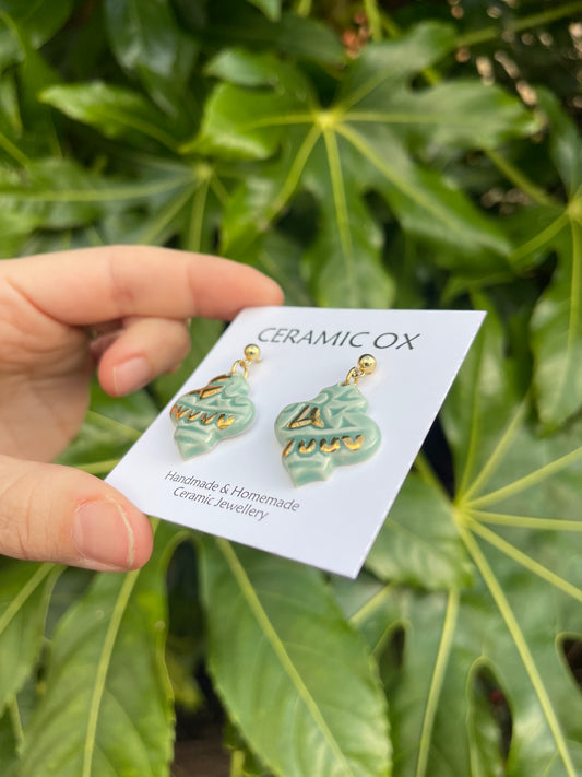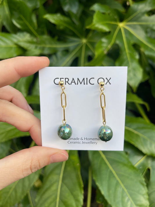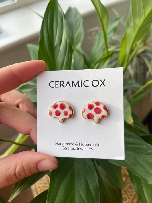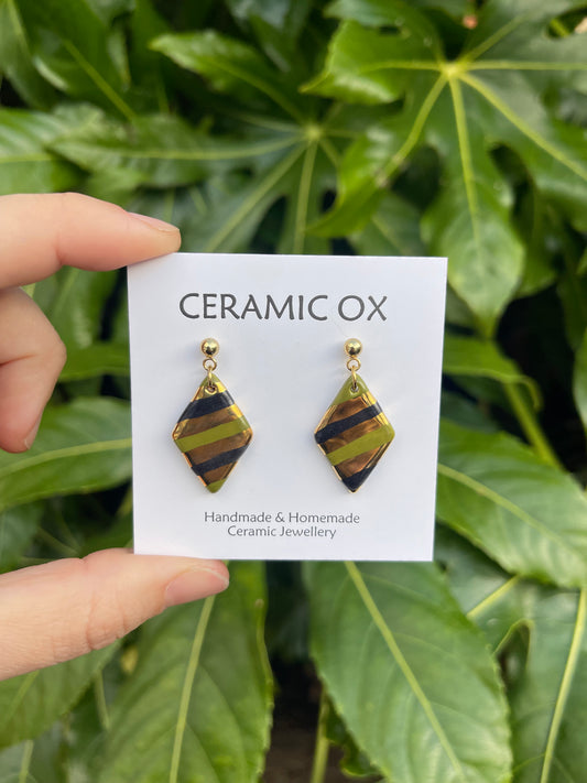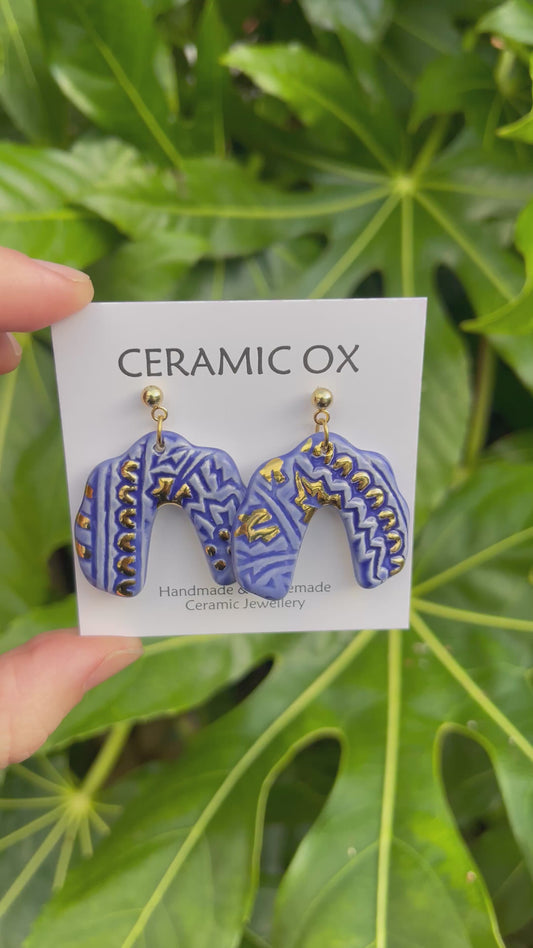 Handmade, homemade, ceramic earrings. Glazed high fire earthenware ceramic earrings fired at over 1050C with 24k gold lustre hand painted design. Stainless steel, hypoallergenic, non oxidising backs or gold plated hardware.