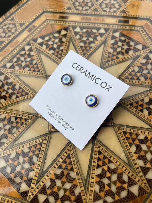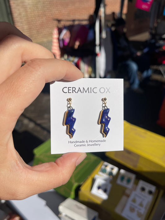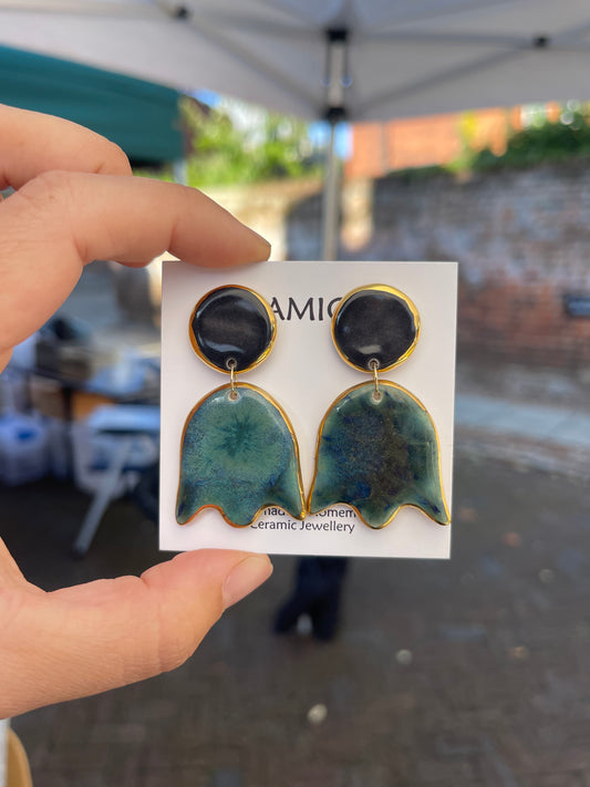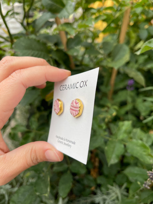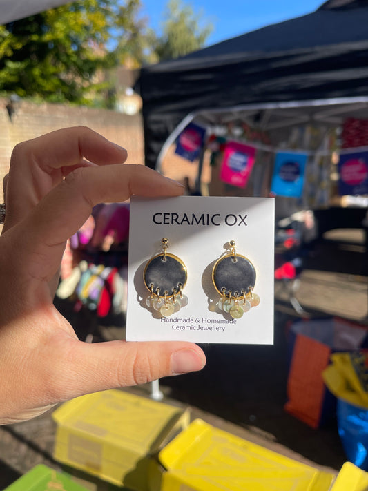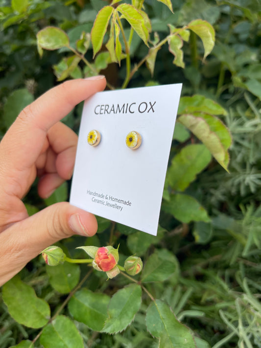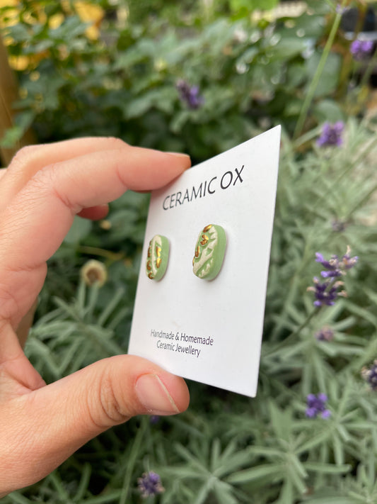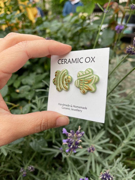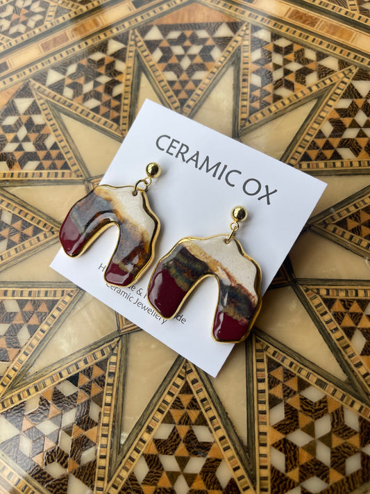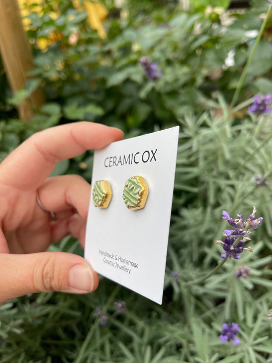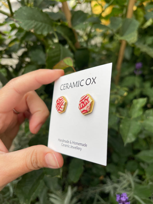Handmade, homemade, ceramic earrings. Glazed high fire earthenware ceramic earrings fired at over 1050C with 24k gold lustre hand painted design. Stainless steel, hypoallergenic, non oxidising backs or gold plated hardware.