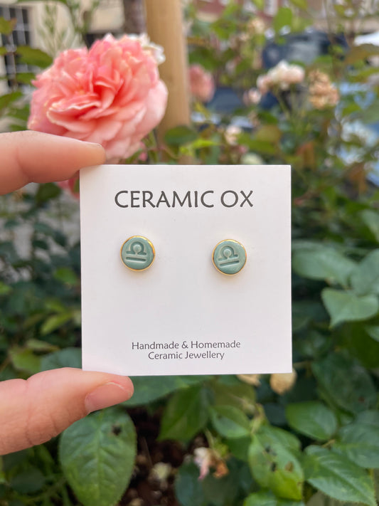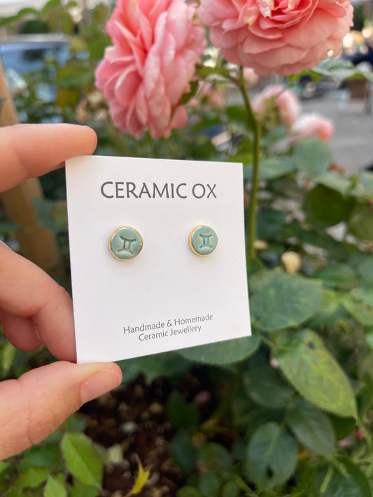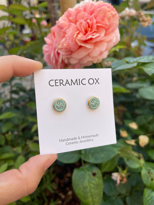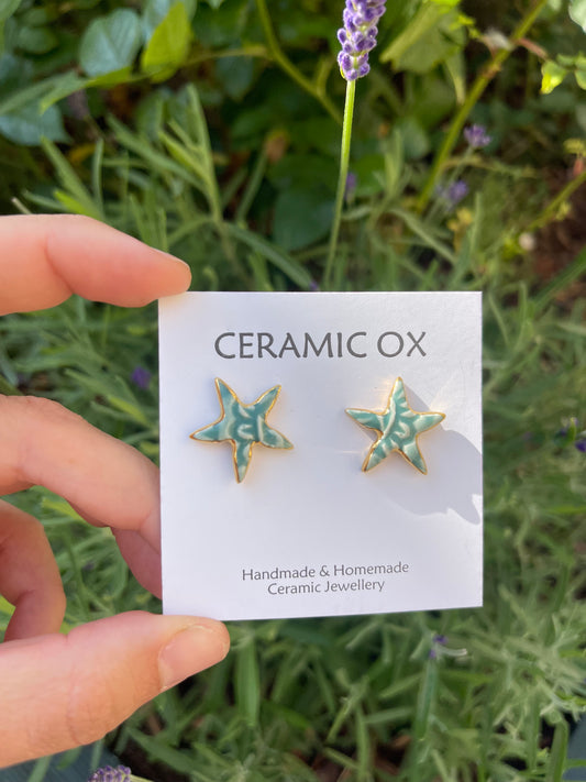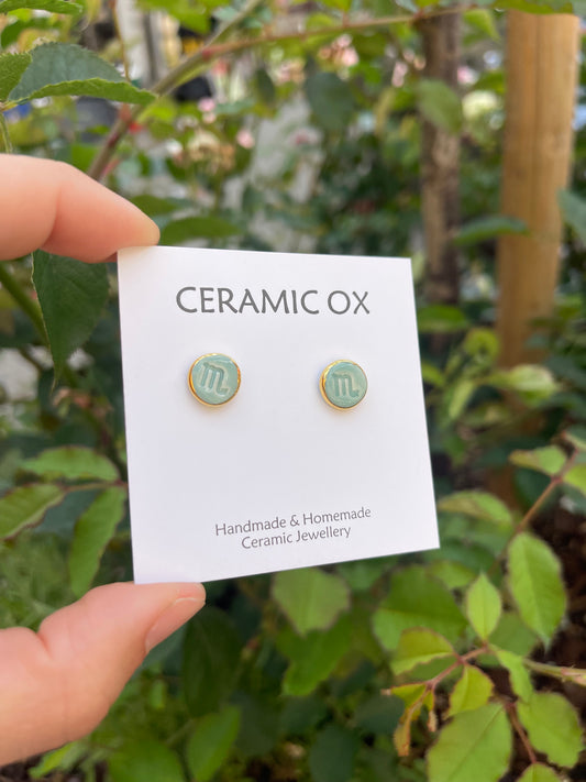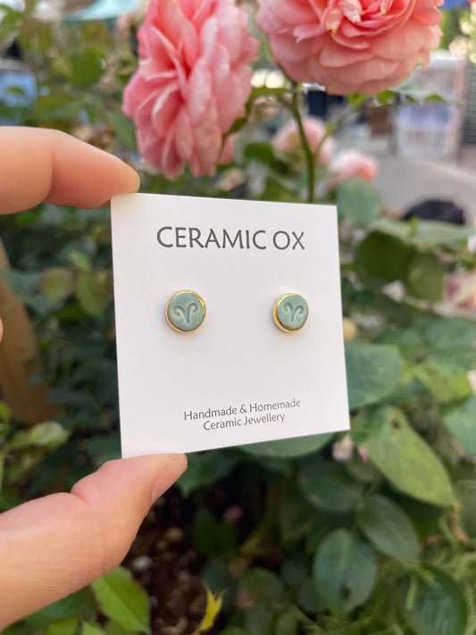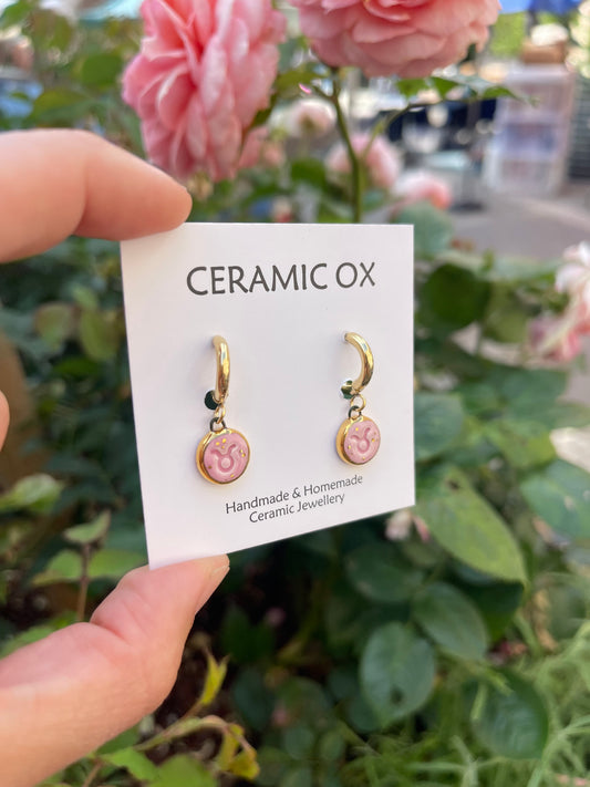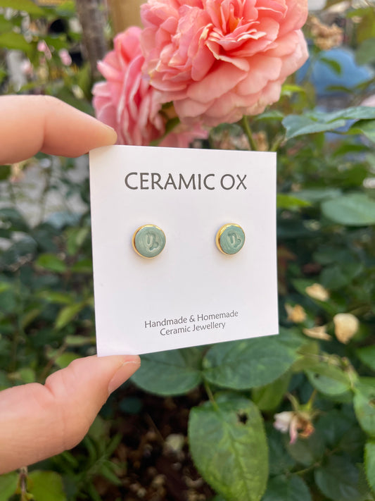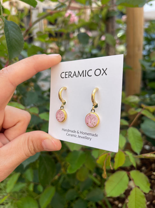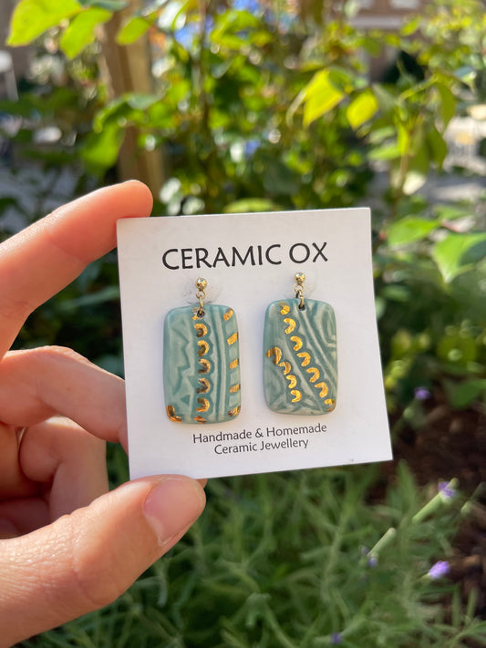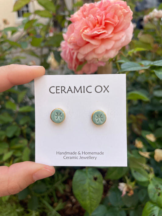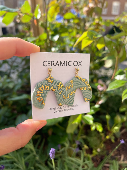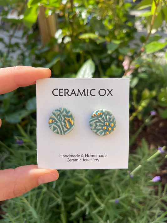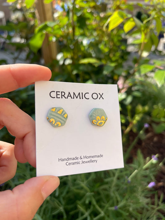 Handmade, homemade, ceramic earrings. Glazed high fire earthenware ceramic earrings fired at over 1050C with 24k gold lustre hand painted design. Stainless steel, hypoallergenic, non oxidising backs or gold plated hardware.