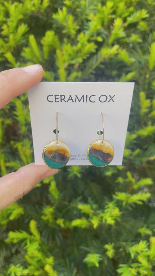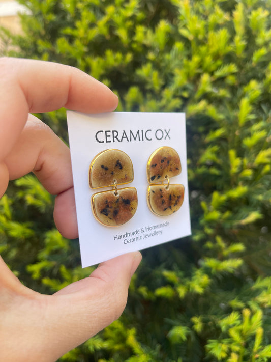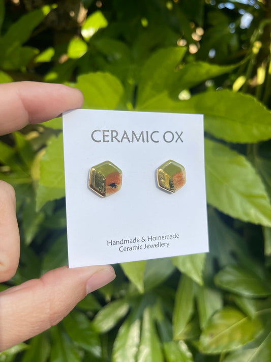 Handmade, homemade, ceramic earrings. Glazed high fire earthenware ceramic earrings fired at over 1050C with 24k gold lustre hand painted design. Stainless steel, hypoallergenic, non oxidising backs or gold plated hardware.