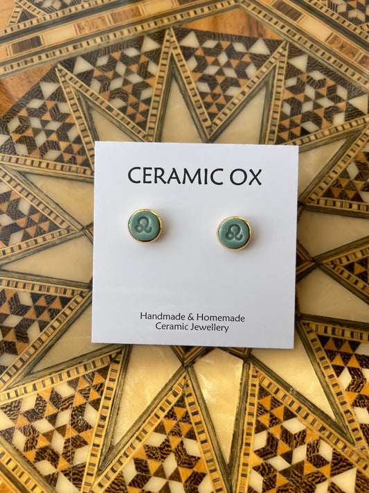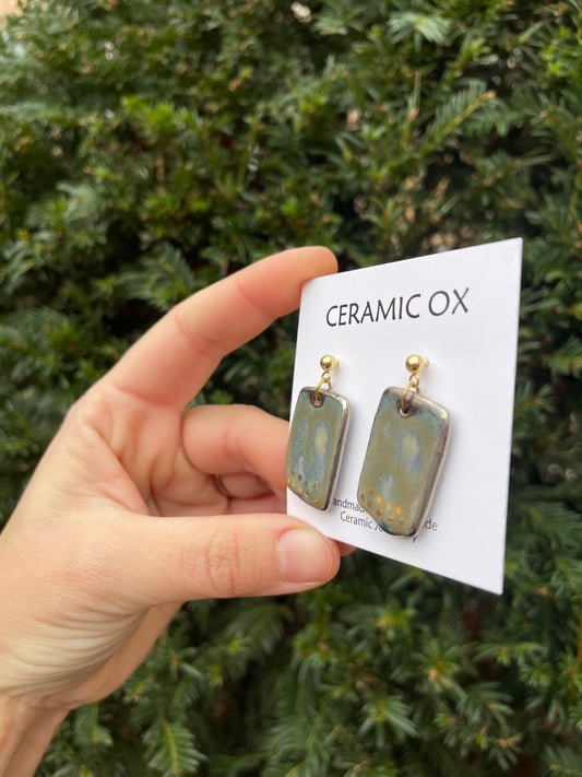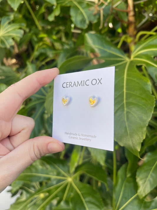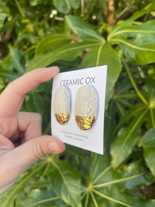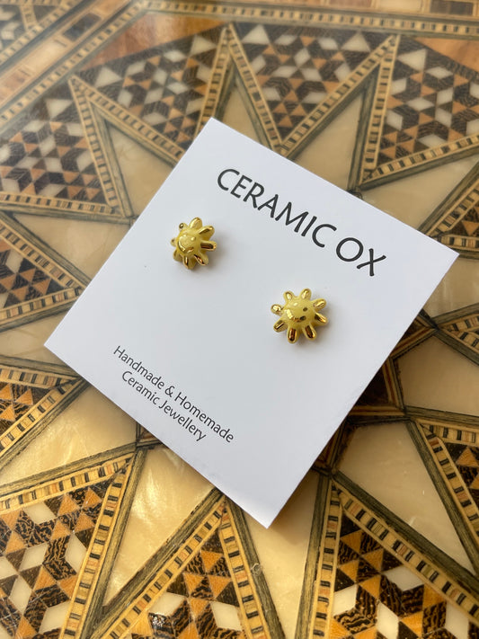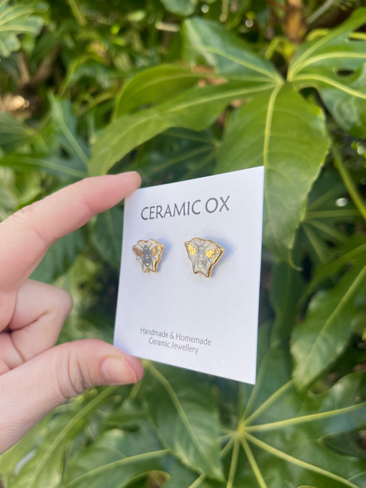 Handmade, homemade, ceramic earrings. Glazed high fire earthenware ceramic earrings fired at over 1050C with 24k gold lustre hand painted design. Stainless steel, hypoallergenic, non oxidising backs or gold plated hardware.