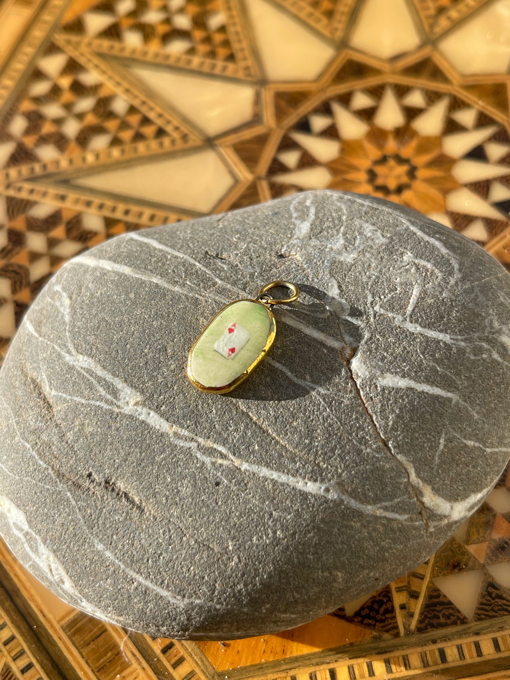 Hand painted ceramic pendant charm. Double sided, glazed high fire earthenware ceramics fired at over 1050C with 24k gold lustre design.