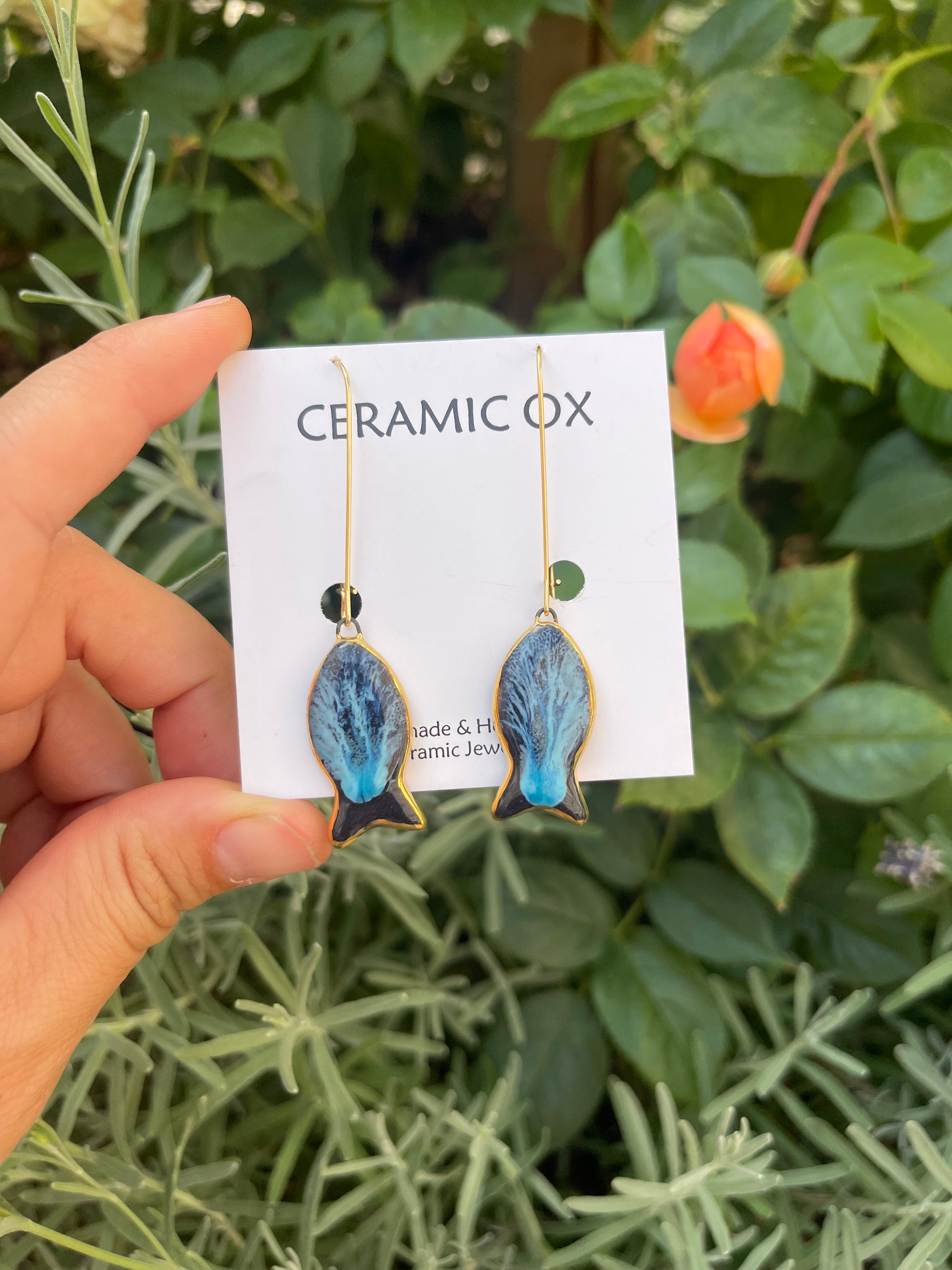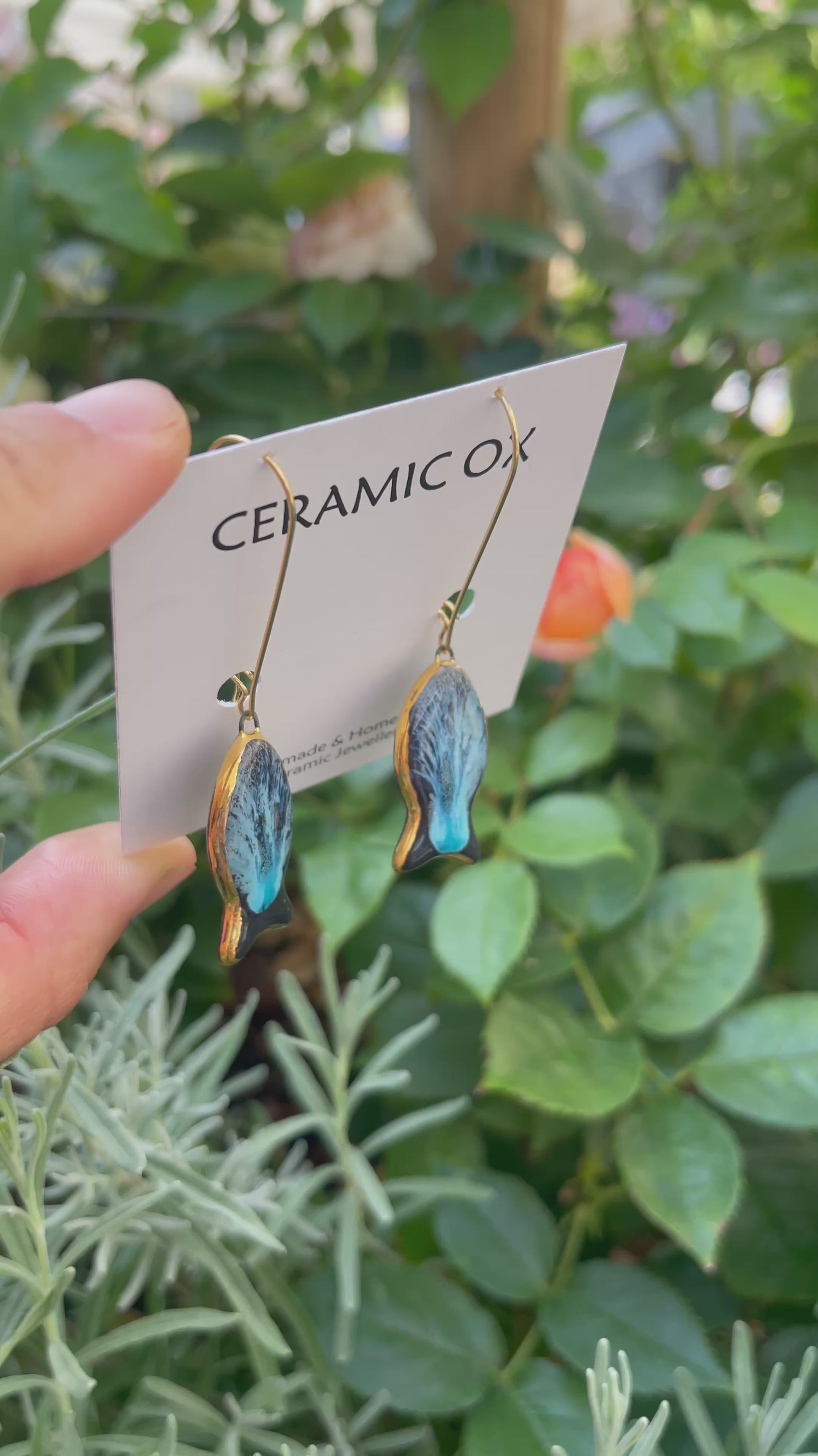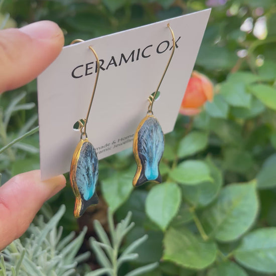Handmade, homemade, ceramic earrings. Glazed high fire earthenware ceramic earrings fired at over 1050C with 24k gold lustre design.