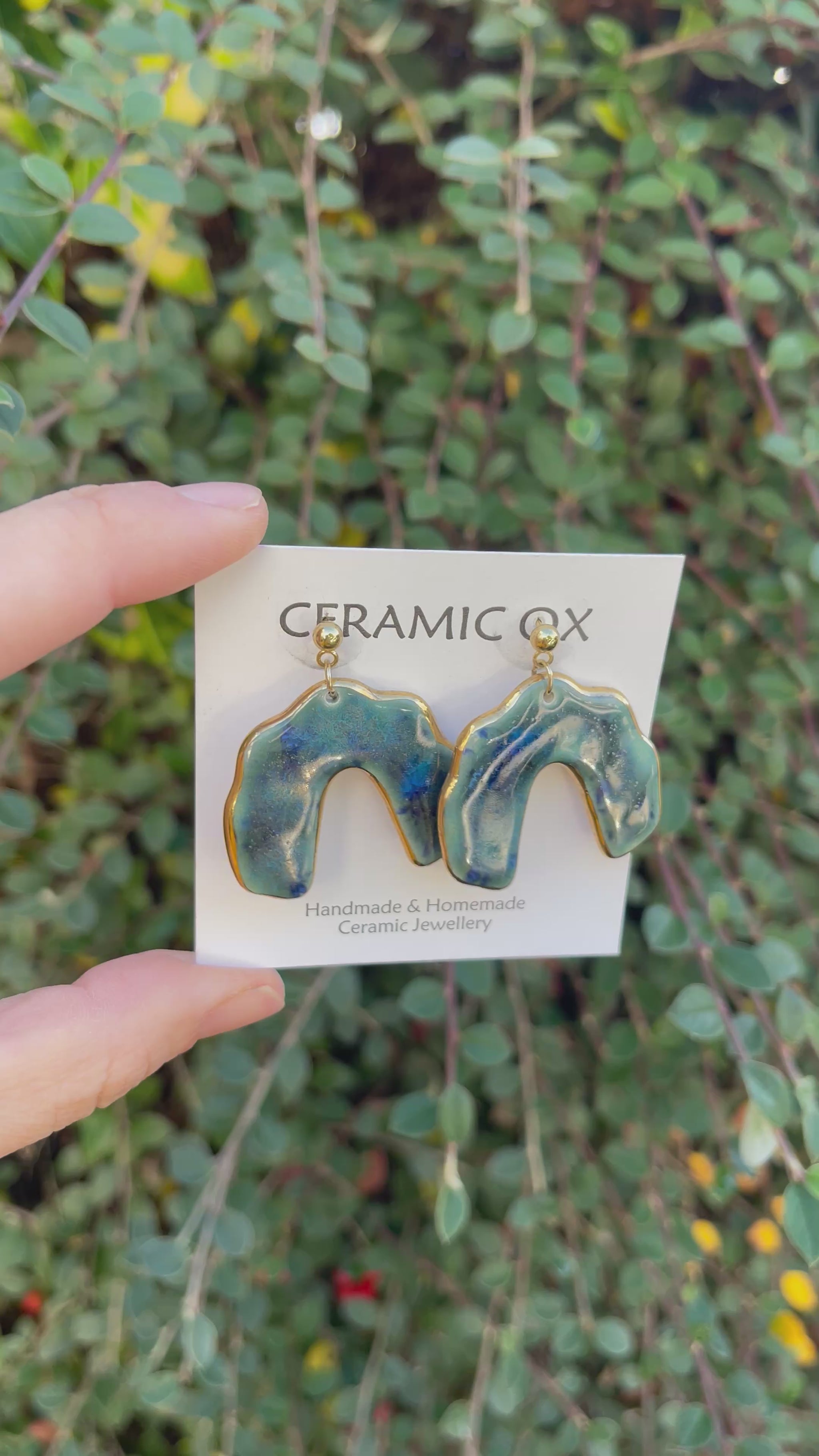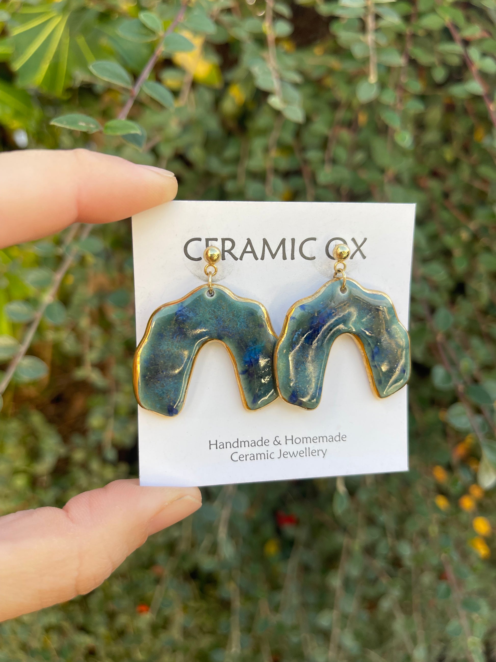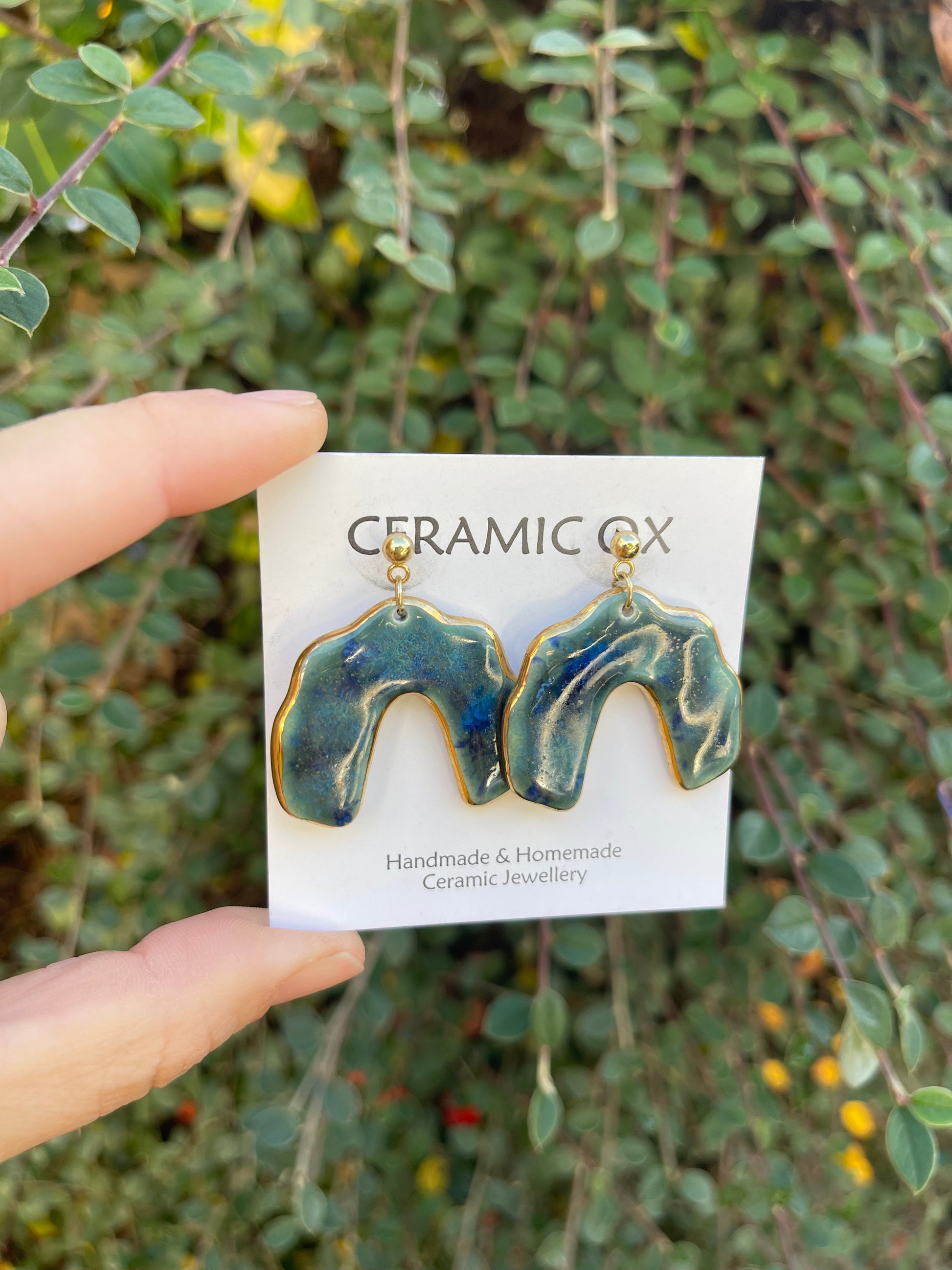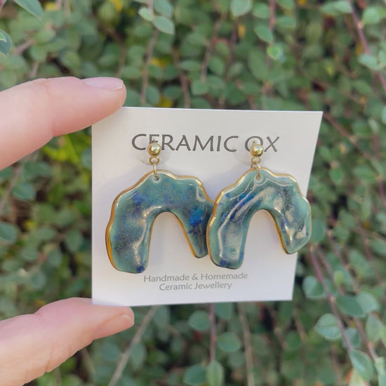 Handmade, homemade, ceramic earrings. Glazed high fire earthenware ceramic earrings fired at over 1050C with 24k gold lustre design.
