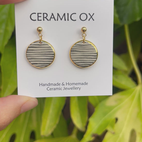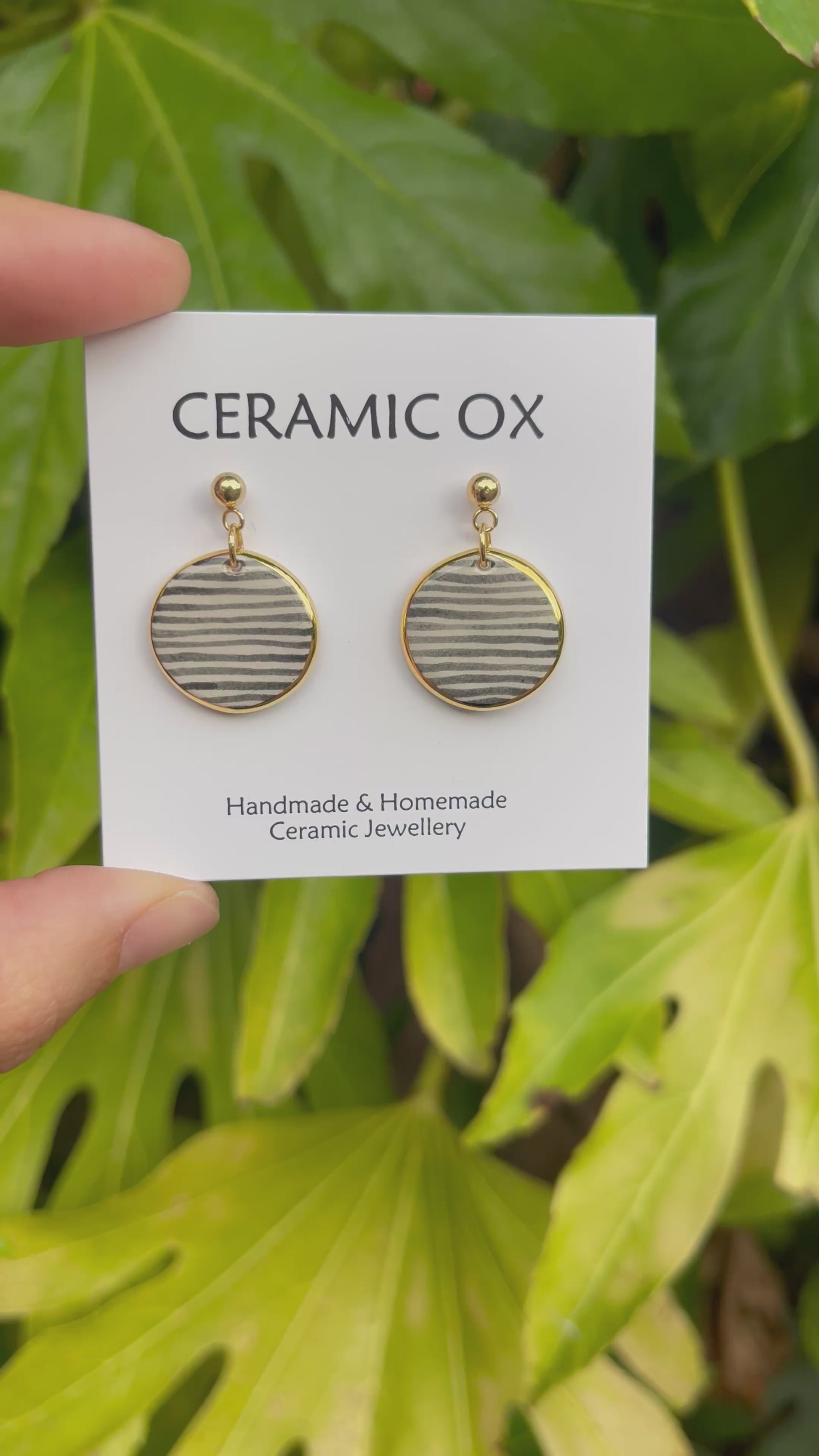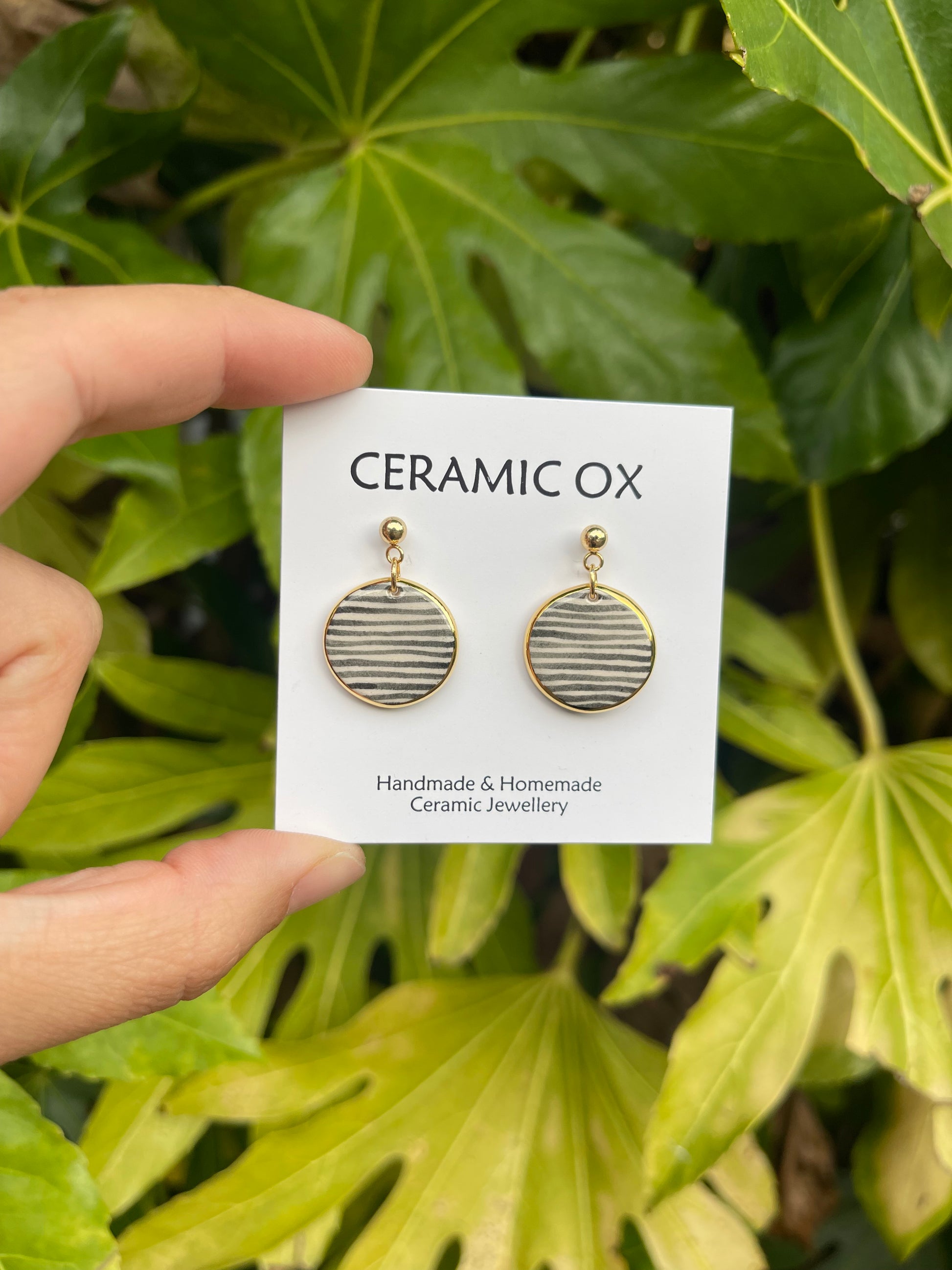 Handmade, homemade, ceramic earrings. Glazed high fire earthenware ceramic earrings fired at over 1050C with hand painted 24k gold lustre design.