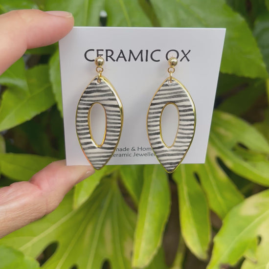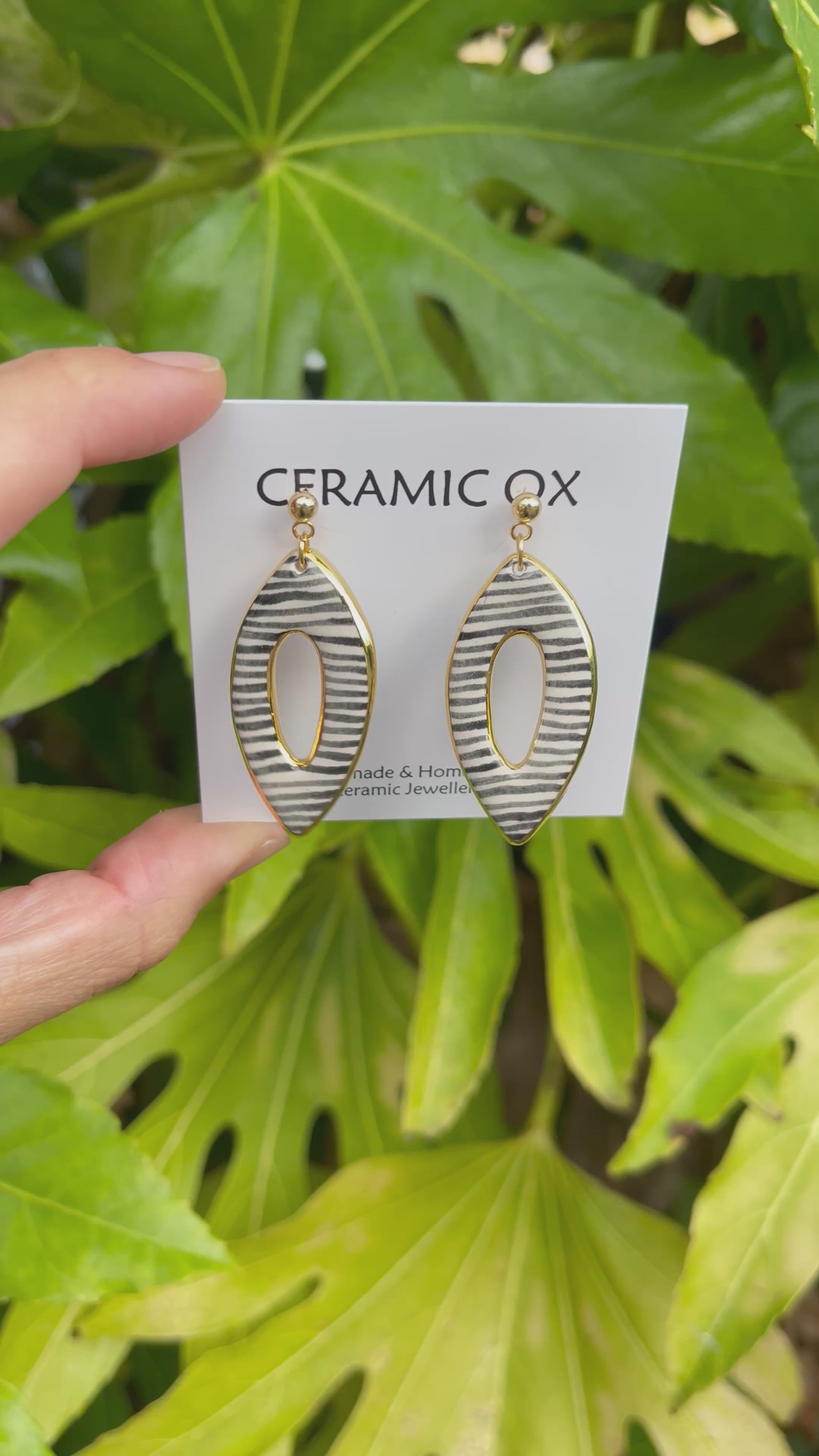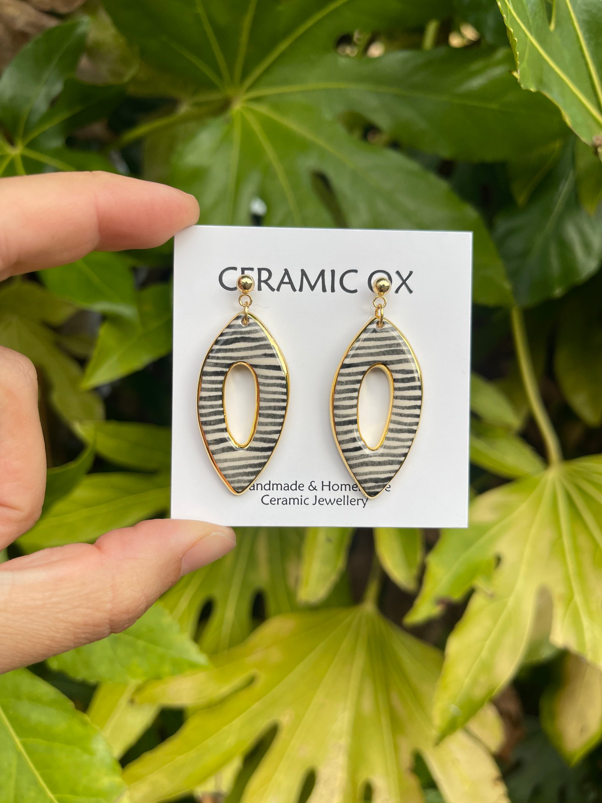 Handmade, homemade, ceramic earrings. Glazed high fire earthenware ceramic earrings fired at over 1100 Celsius with hand painted 24k gold lustre design.