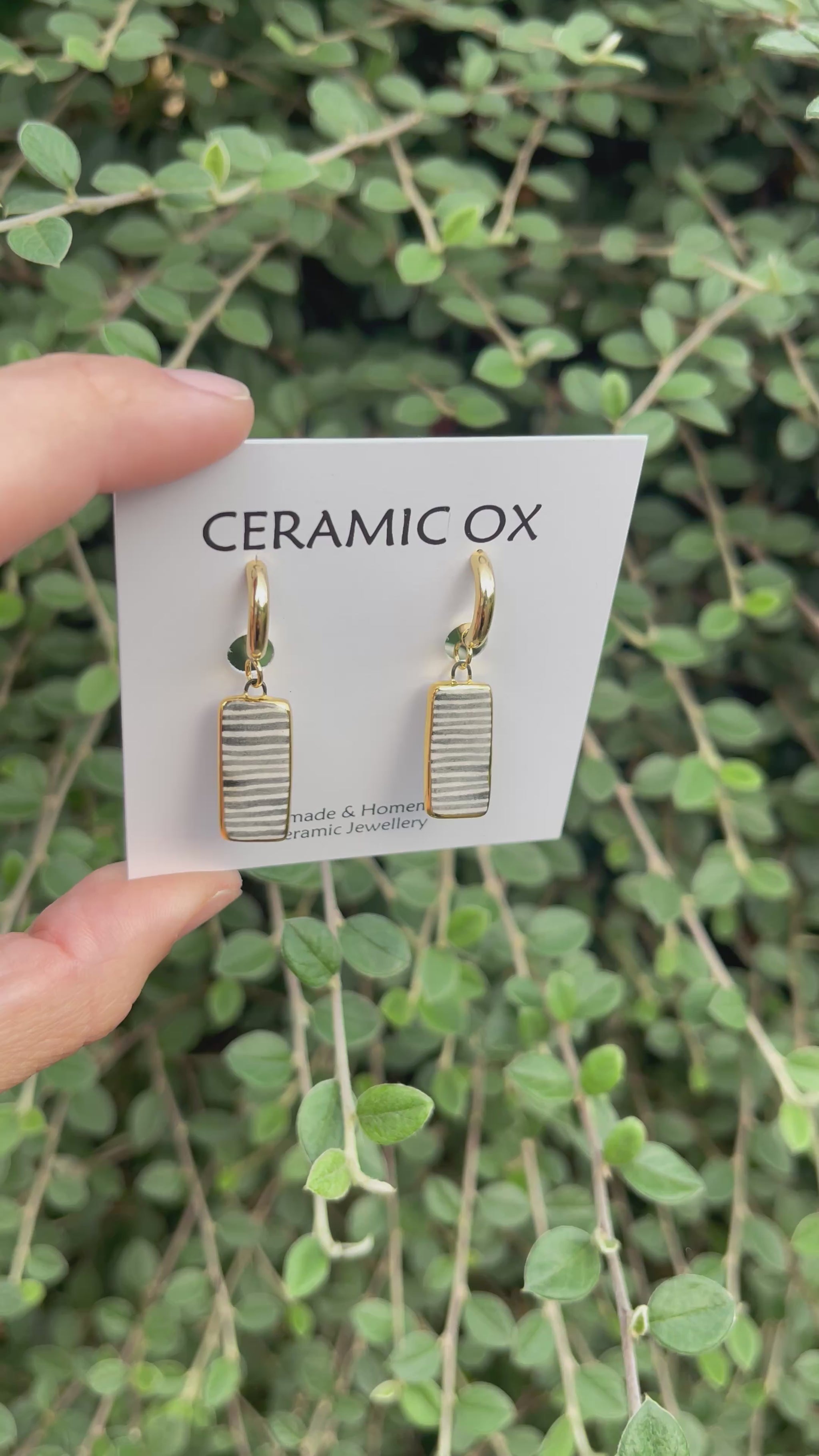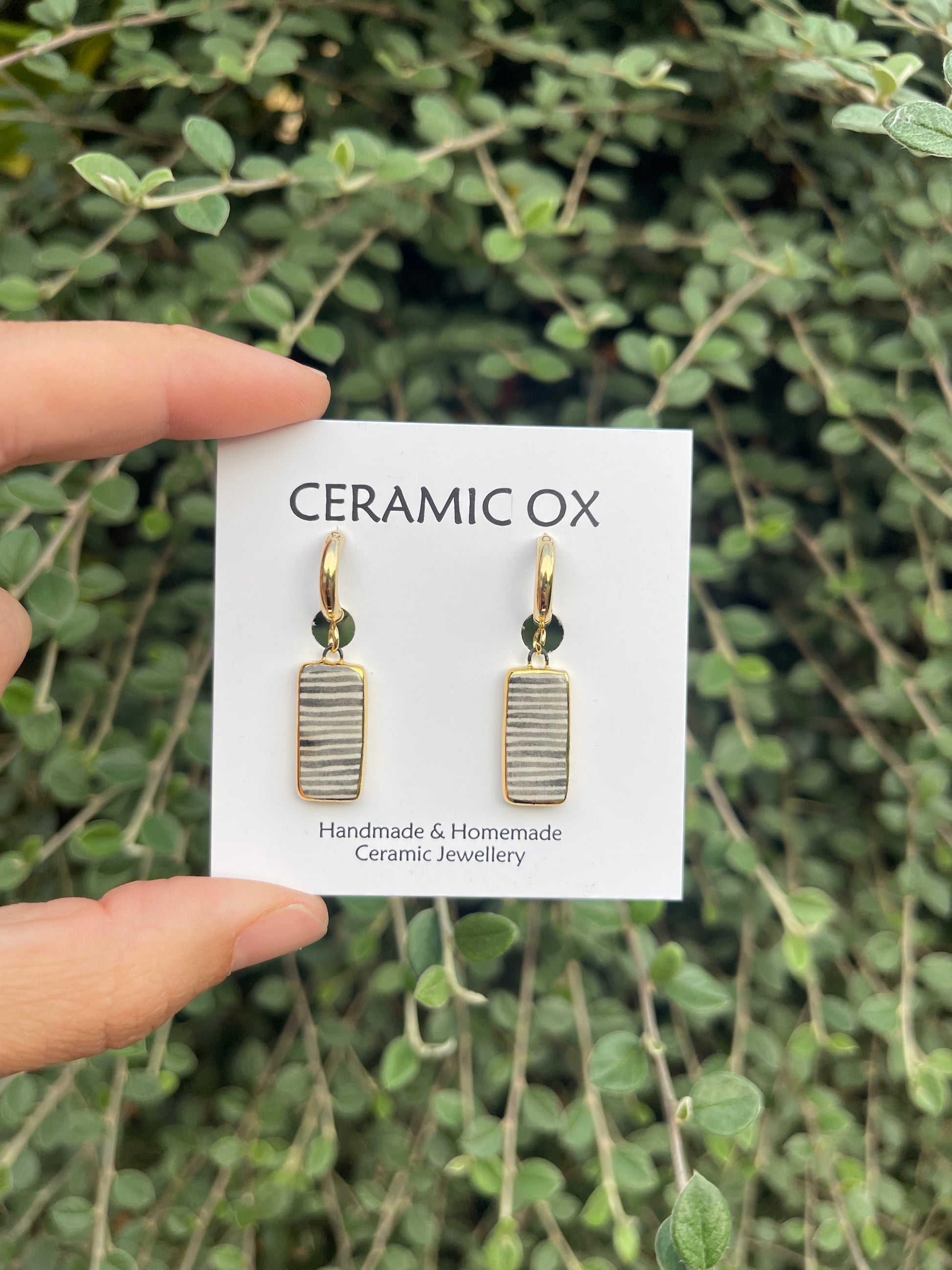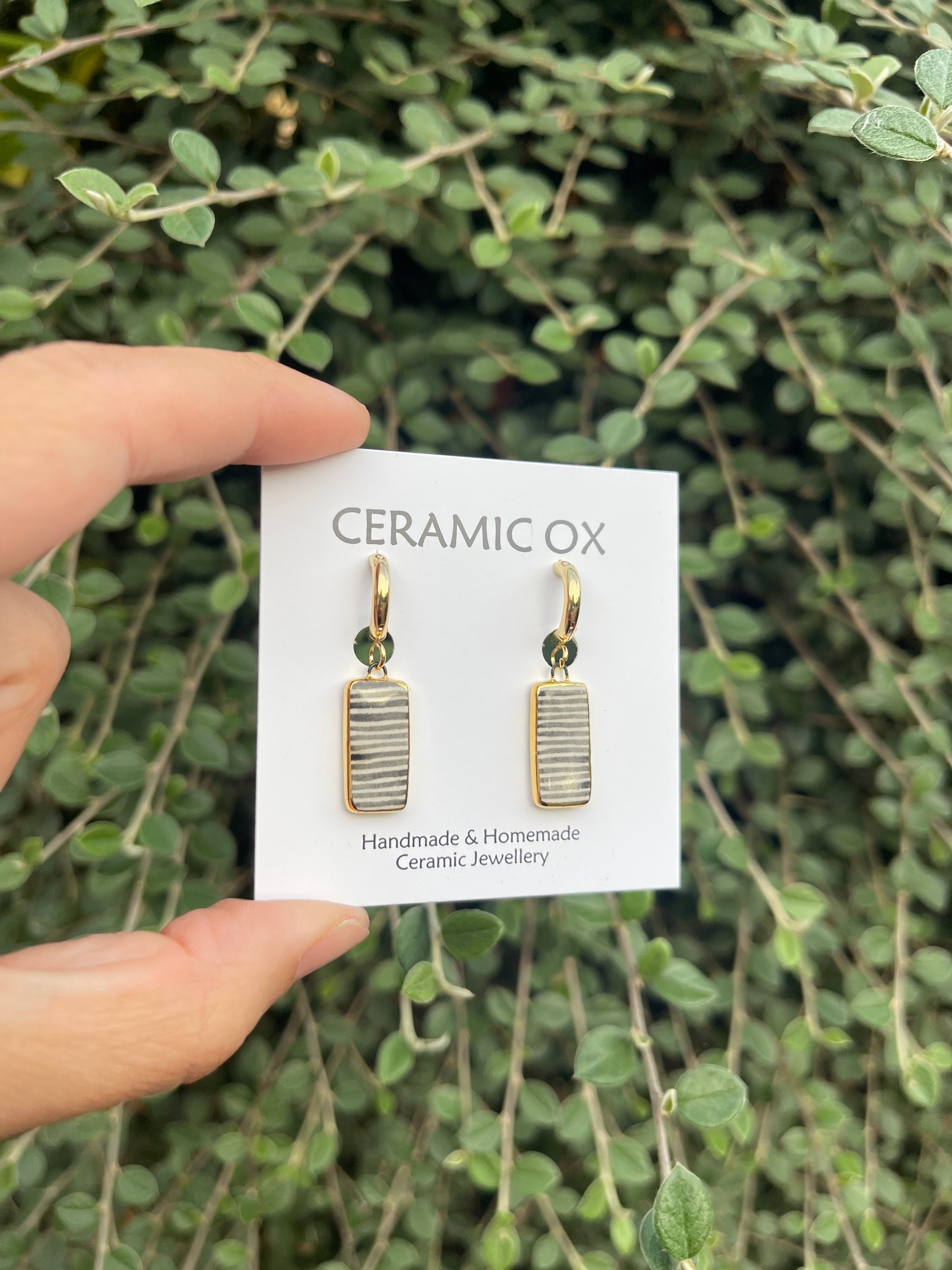 Handmade, homemade, ceramic earrings. Glazed high fire earthenware ceramic earrings fired at over 1050C with hand painted 24k gold lustre design.