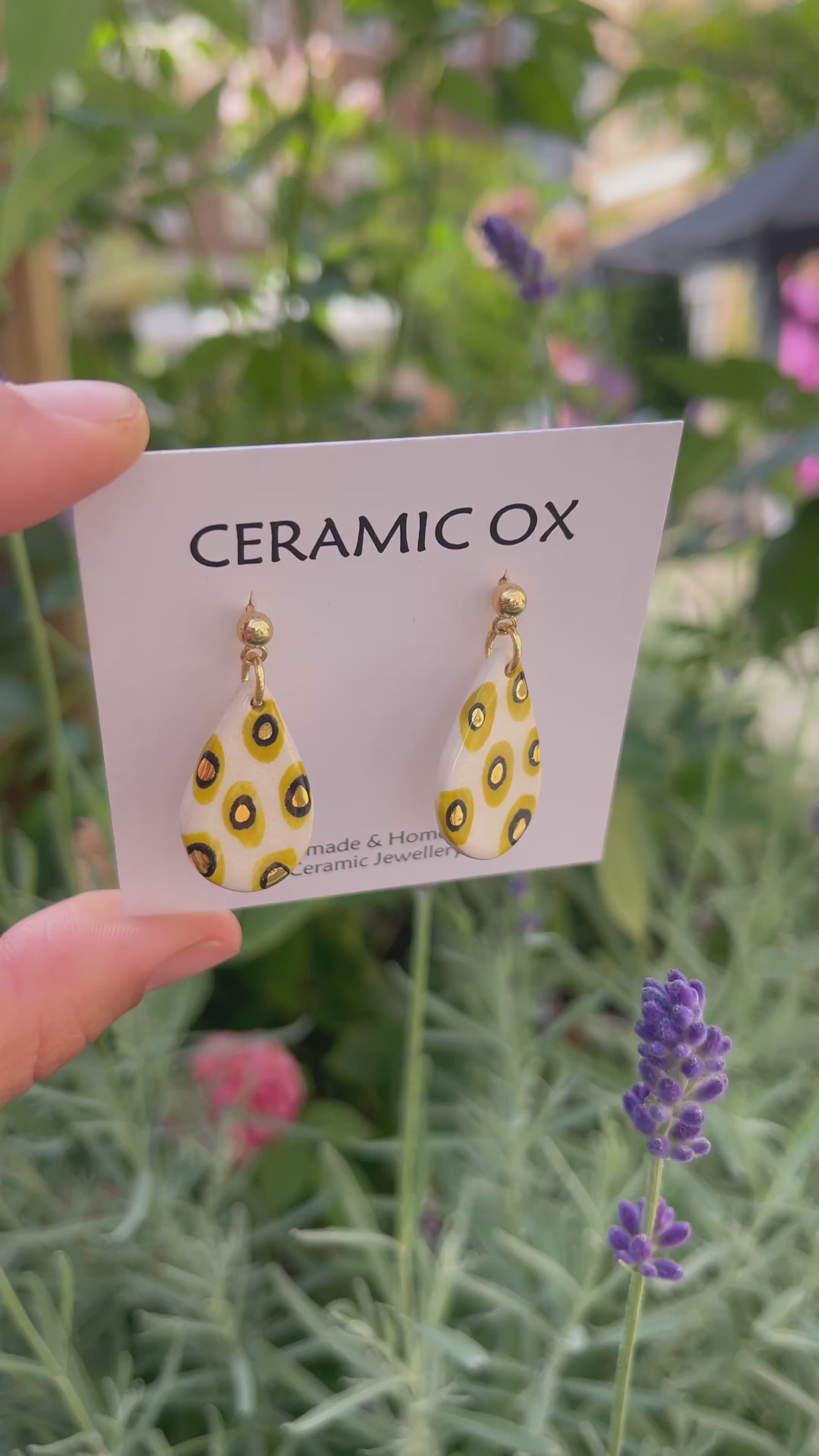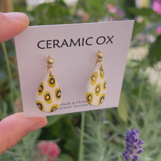 Handmade, homemade, ceramic earrings. Glazed high fire earthenware ceramic earrings fired at over 1050C with 24k gold lustre design.