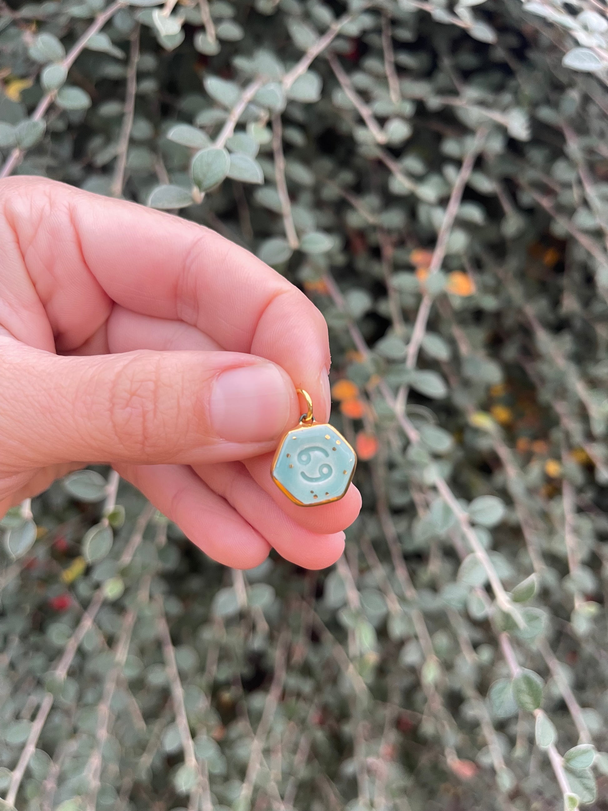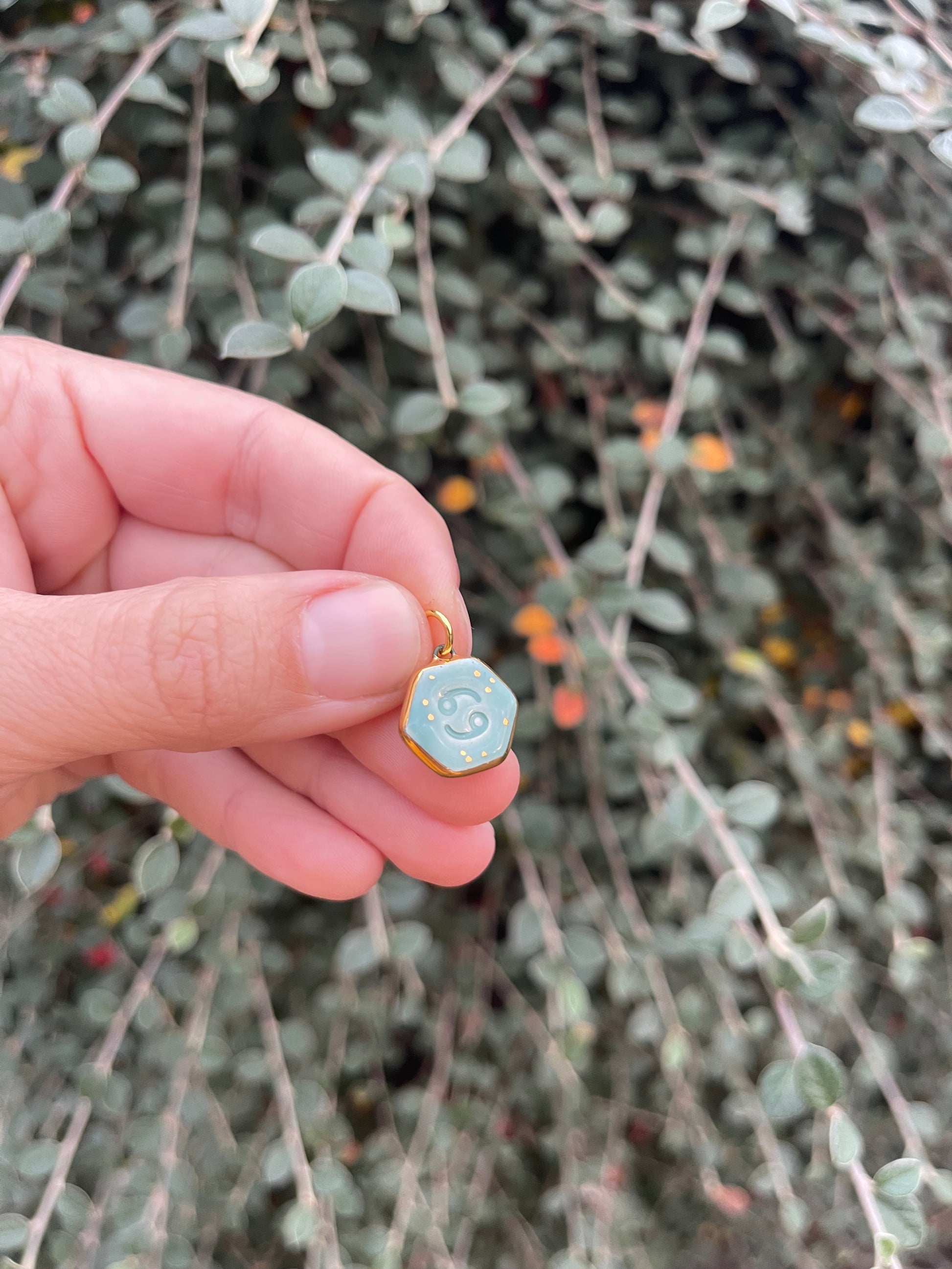 Cancer 22 June - 22 July. Hand painted ceramic pendant charm. Double sided, glazed high fire earthenware ceramics fired at over 1050C with 24k gold lustre design.