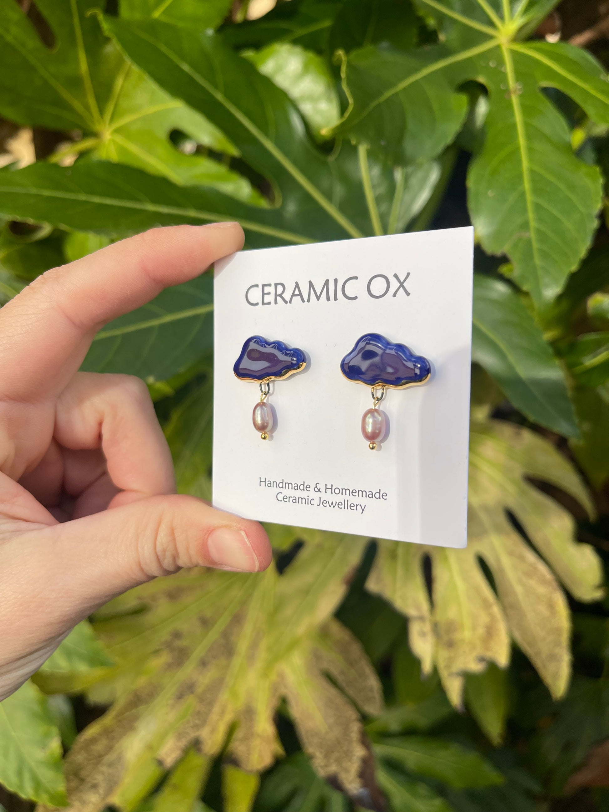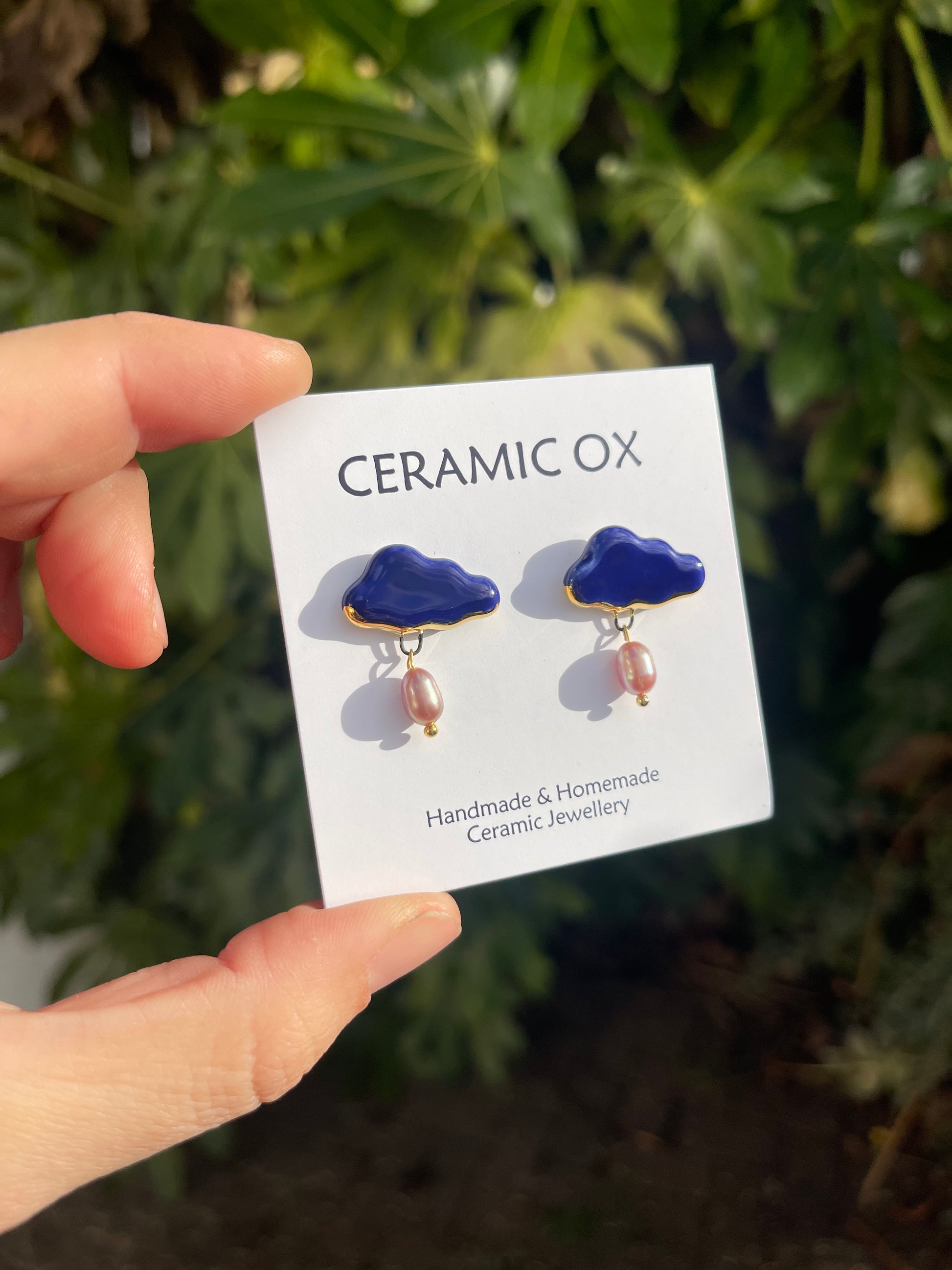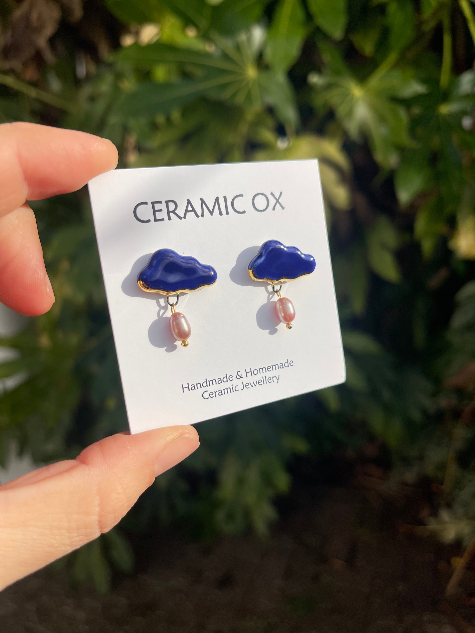 Handmade, homemade, ceramic earrings. Glazed high fire earthenware ceramic earrings fired at over 1100C with 24k gold lustre hand painted design.