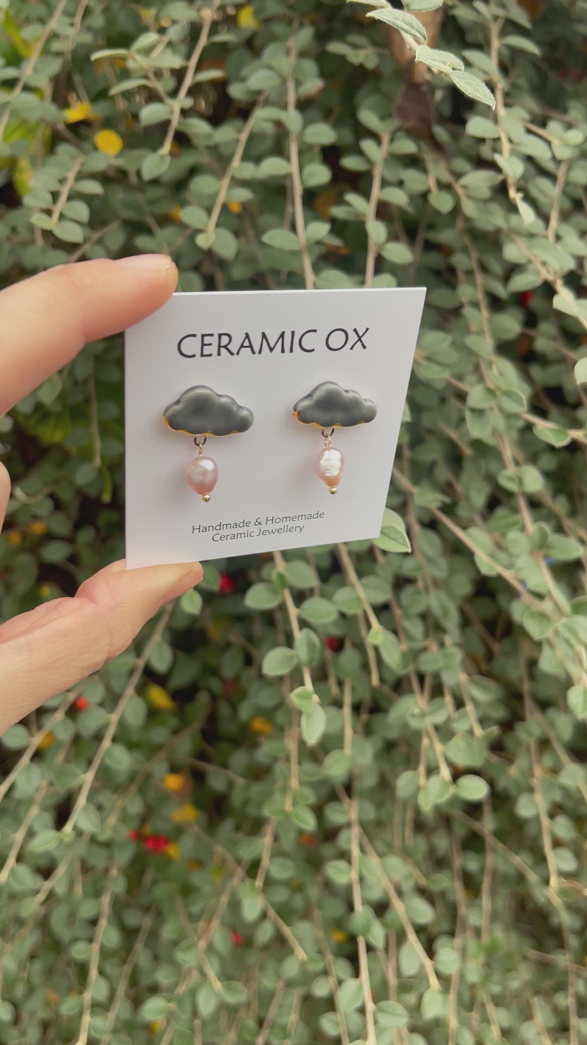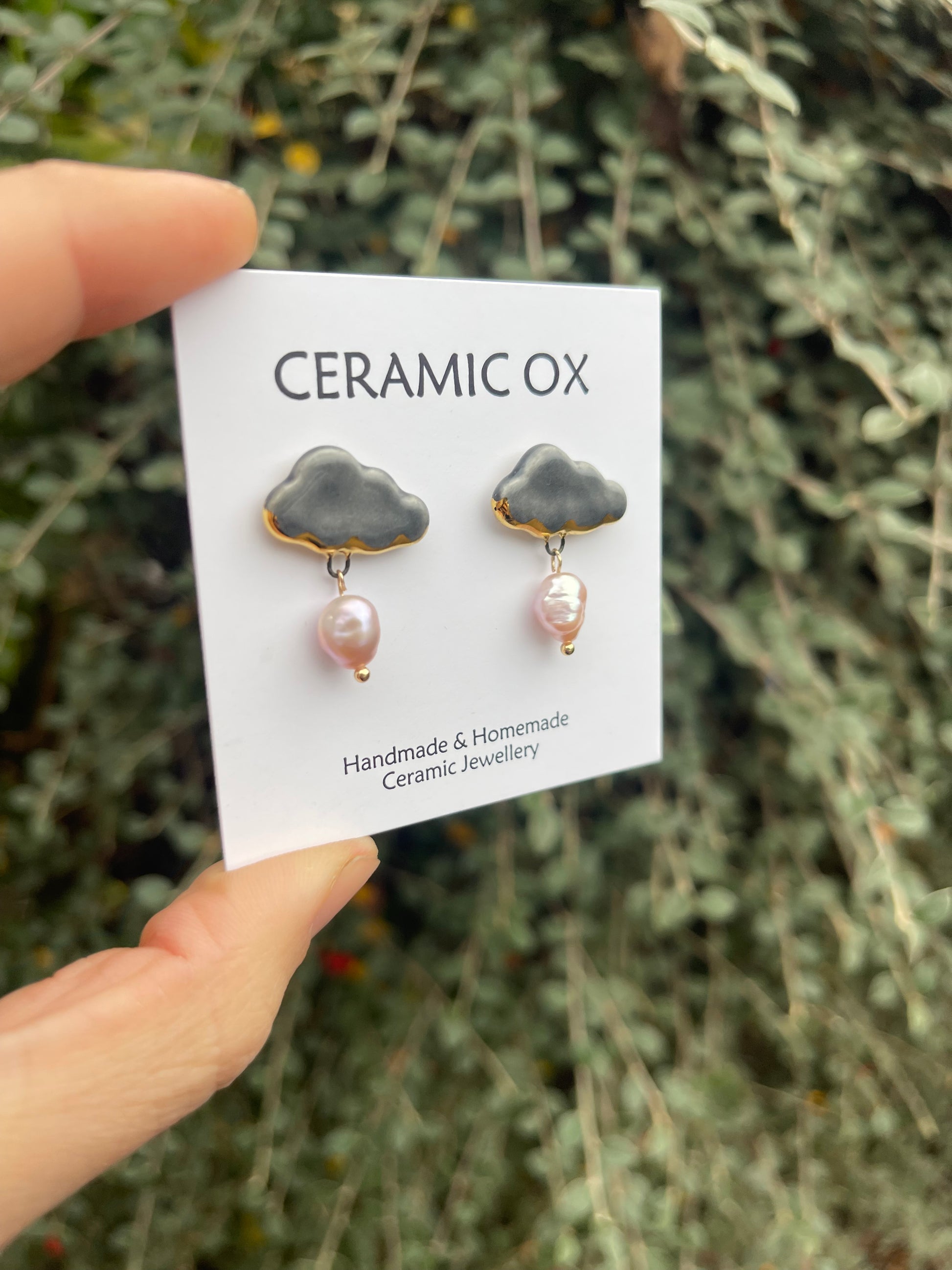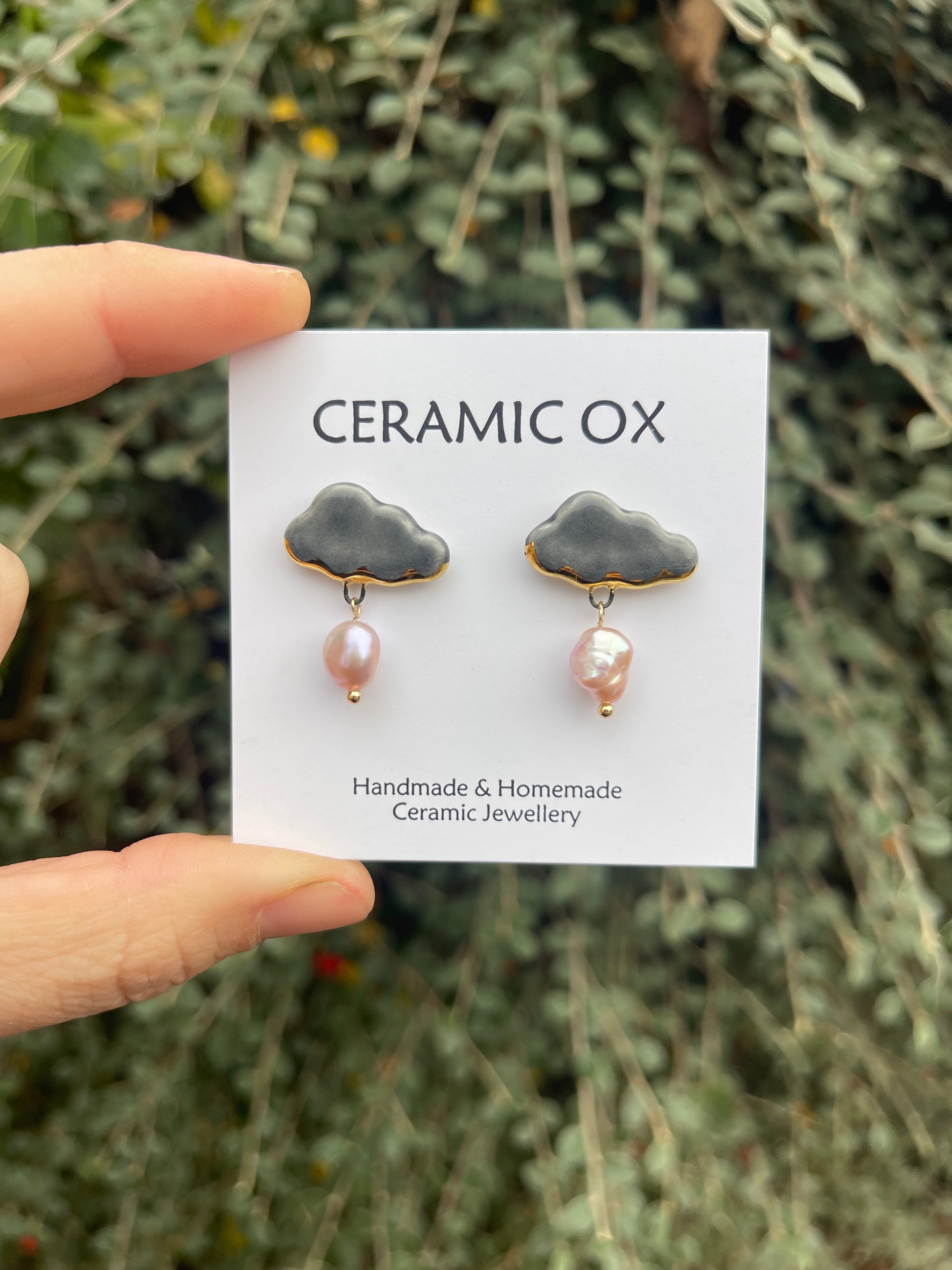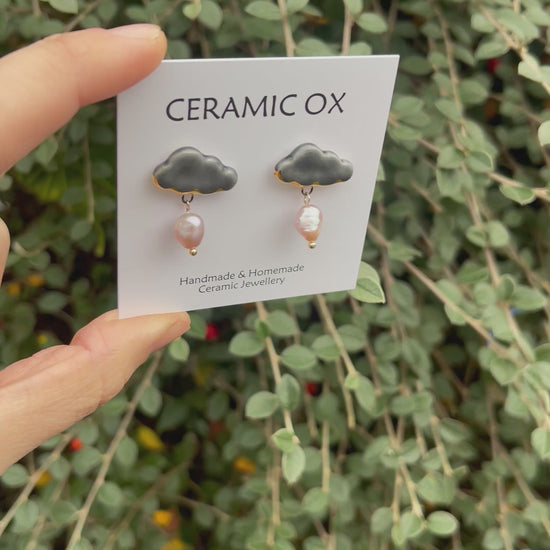 Handmade, homemade, ceramic earrings. Glazed high fire earthenware ceramic earrings fired at over 1100C with 24k Gold lustre design. This moody pair have pink freshwater pearls attached.