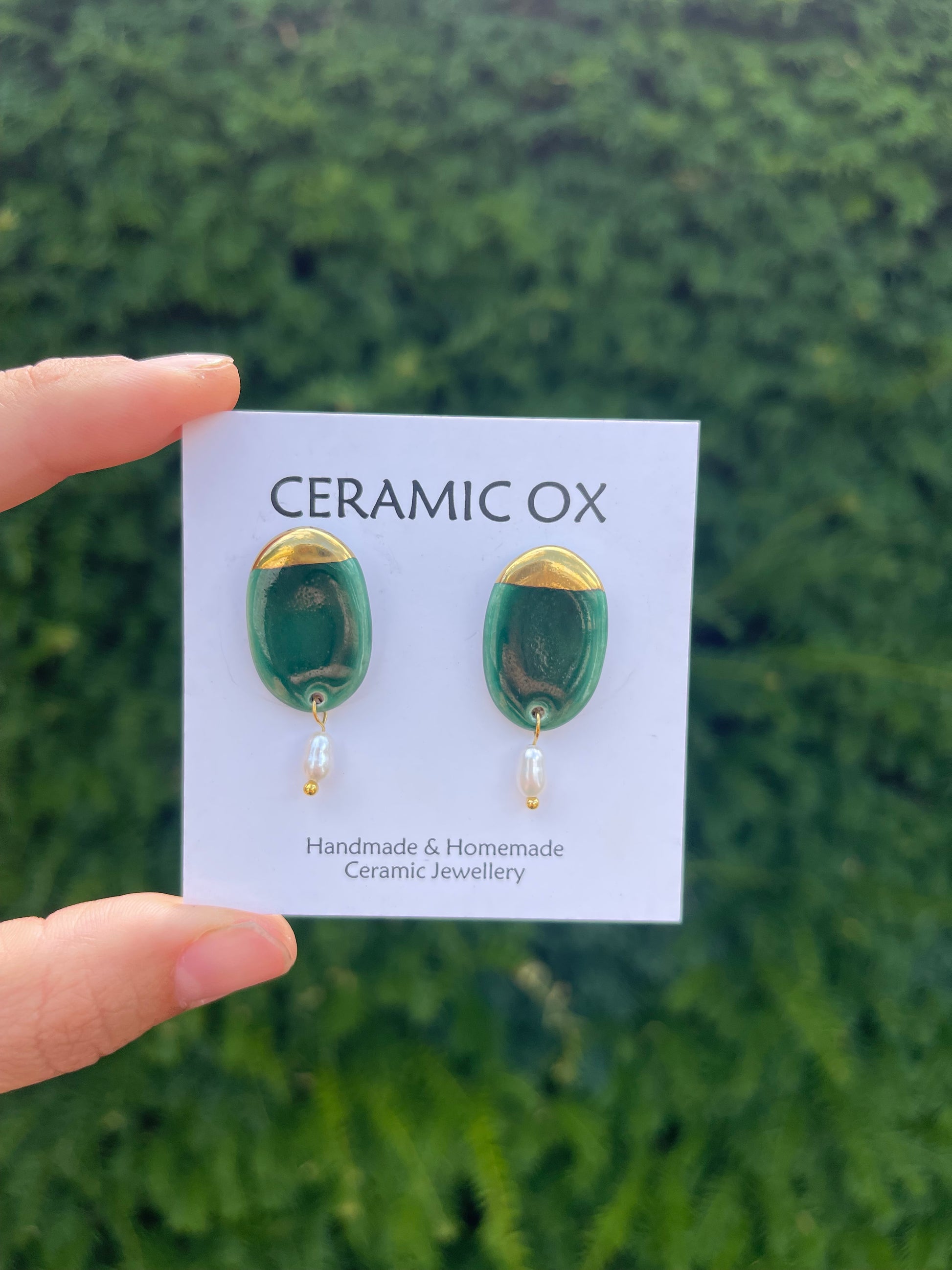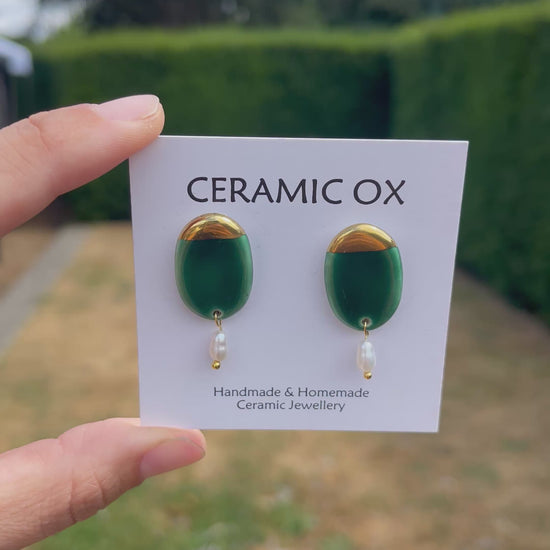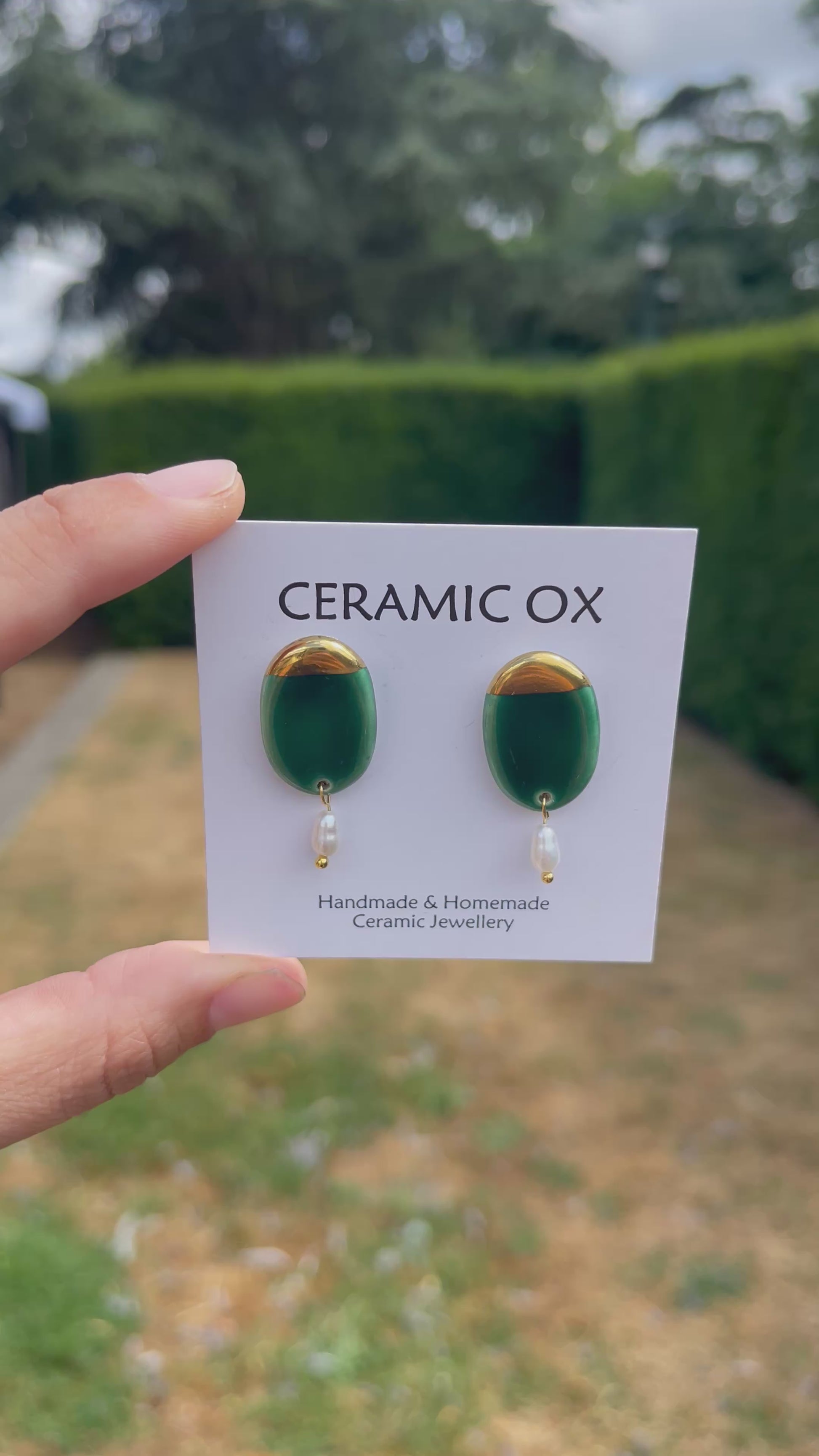 Handmade, homemade, ceramic earrings. Glazed high fire earthenware ceramic earrings fired at over 1100 with 24k gold lustre design.