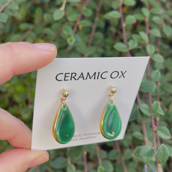 Handmade, homemade, ceramic earrings. Glazed high fire earthenware ceramic earrings fired at over 1050C with 24k gold lustre design.