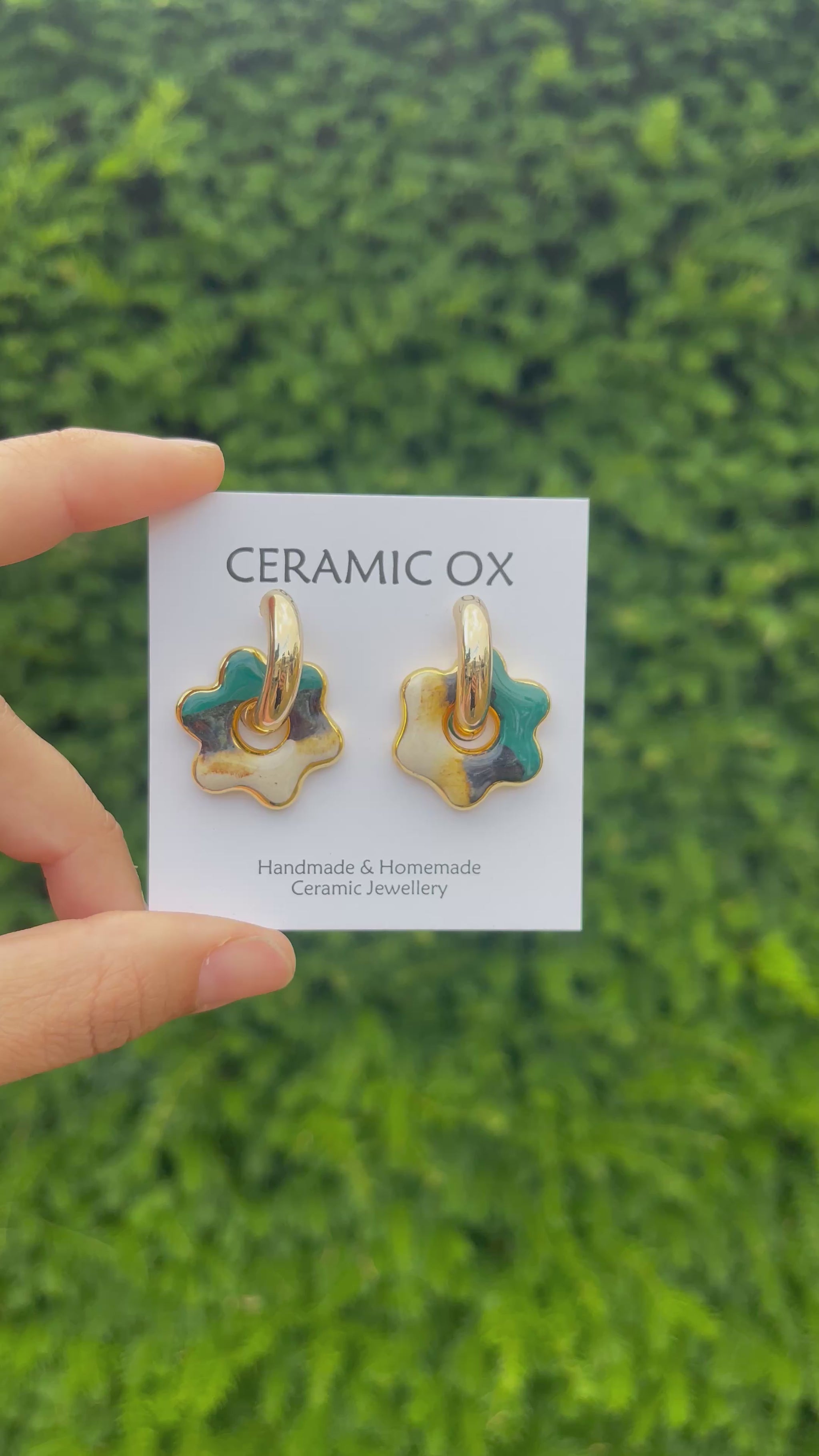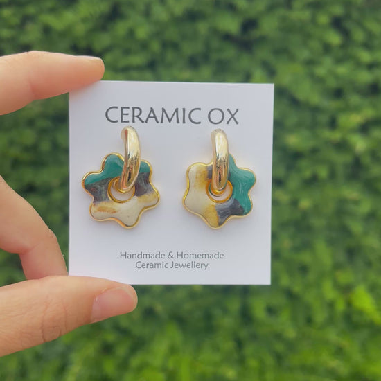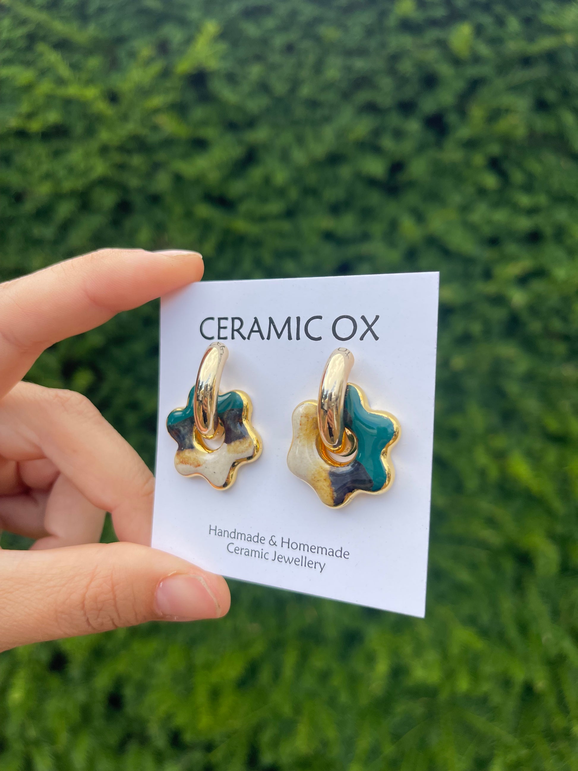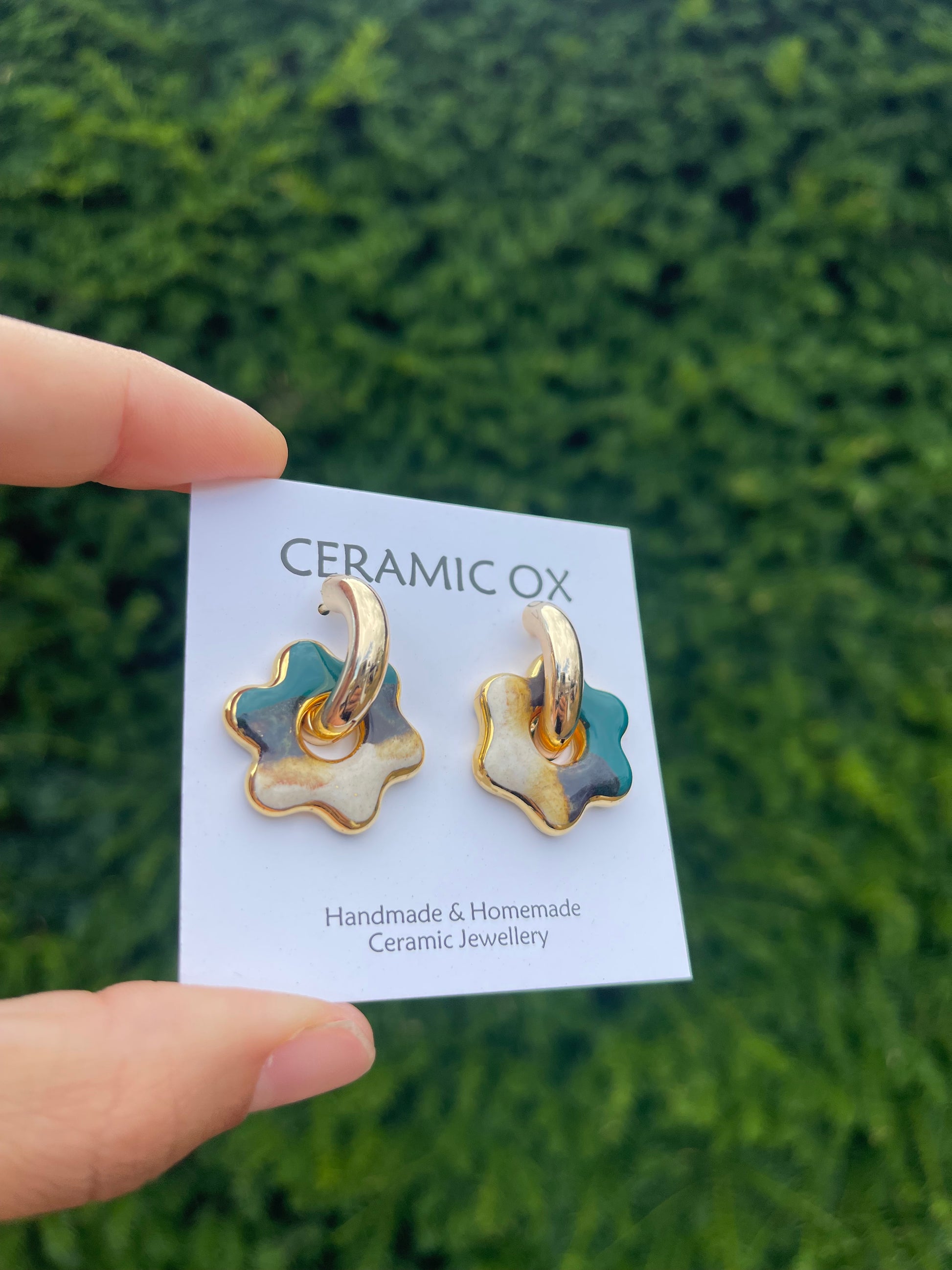 Handmade, homemade, ceramic earrings. Glazed high fire earthenware ceramic earrings fired at over 1050C with 24k gold lustre design.