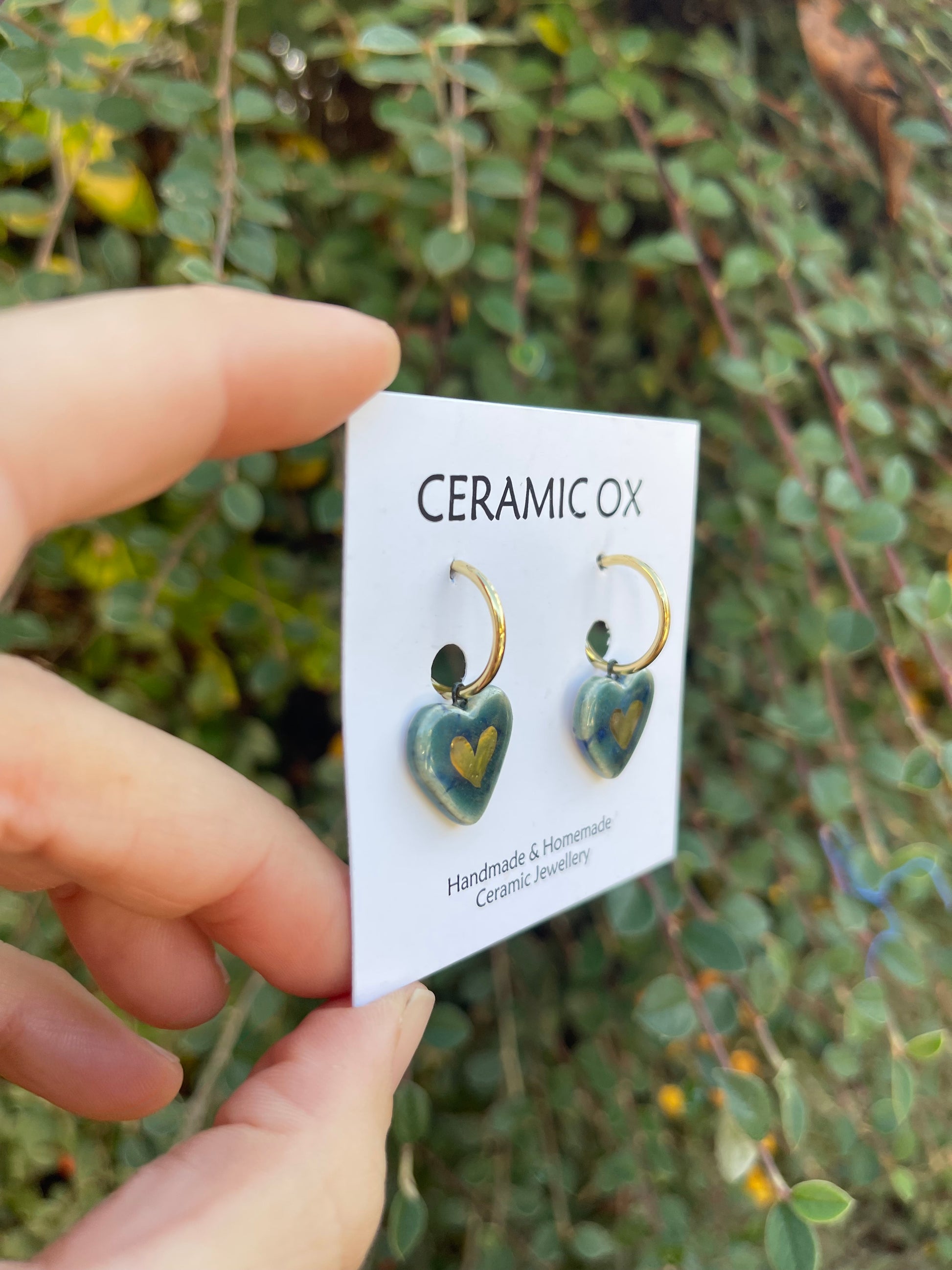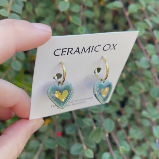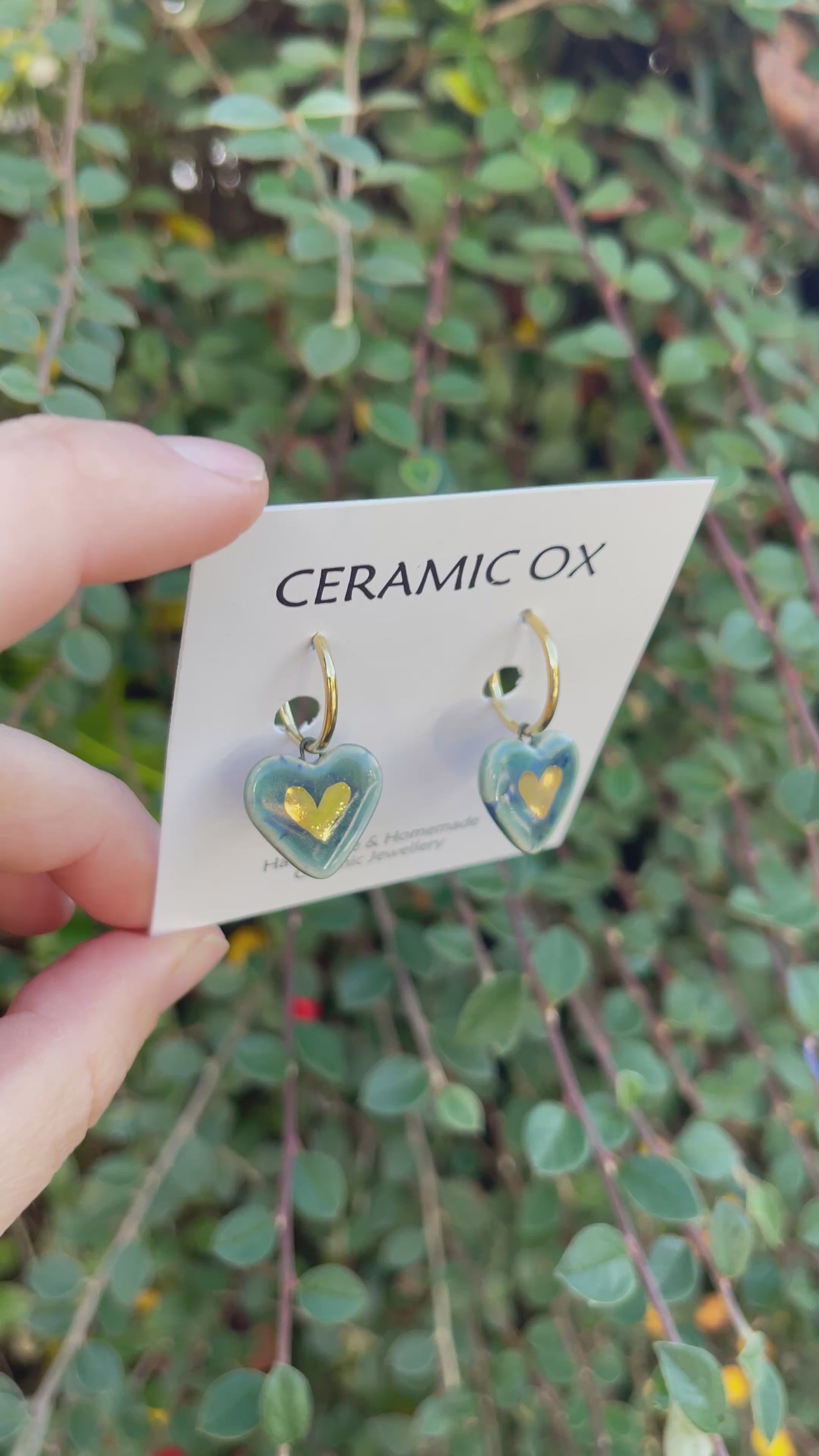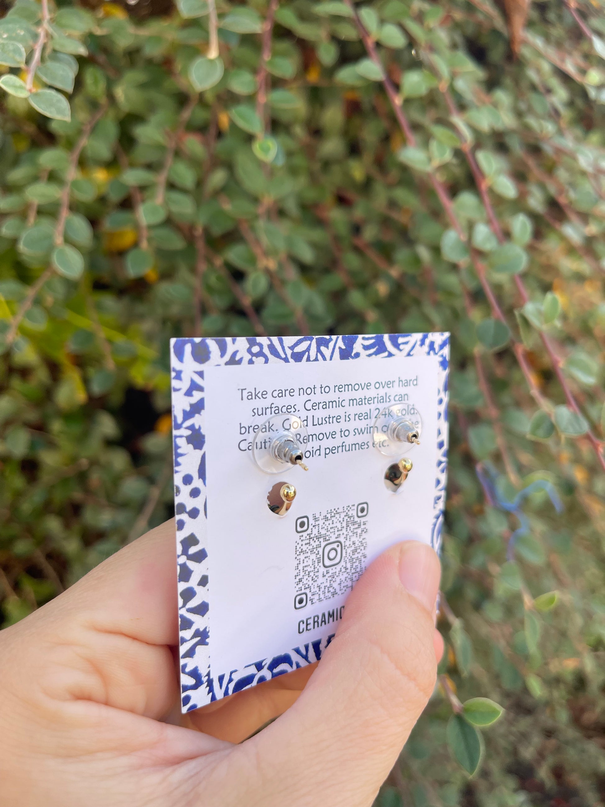 Handmade, homemade, ceramic earrings. Glazed high fire earthenware ceramic earrings fired at over 1050C with 24k gold lustre design.
