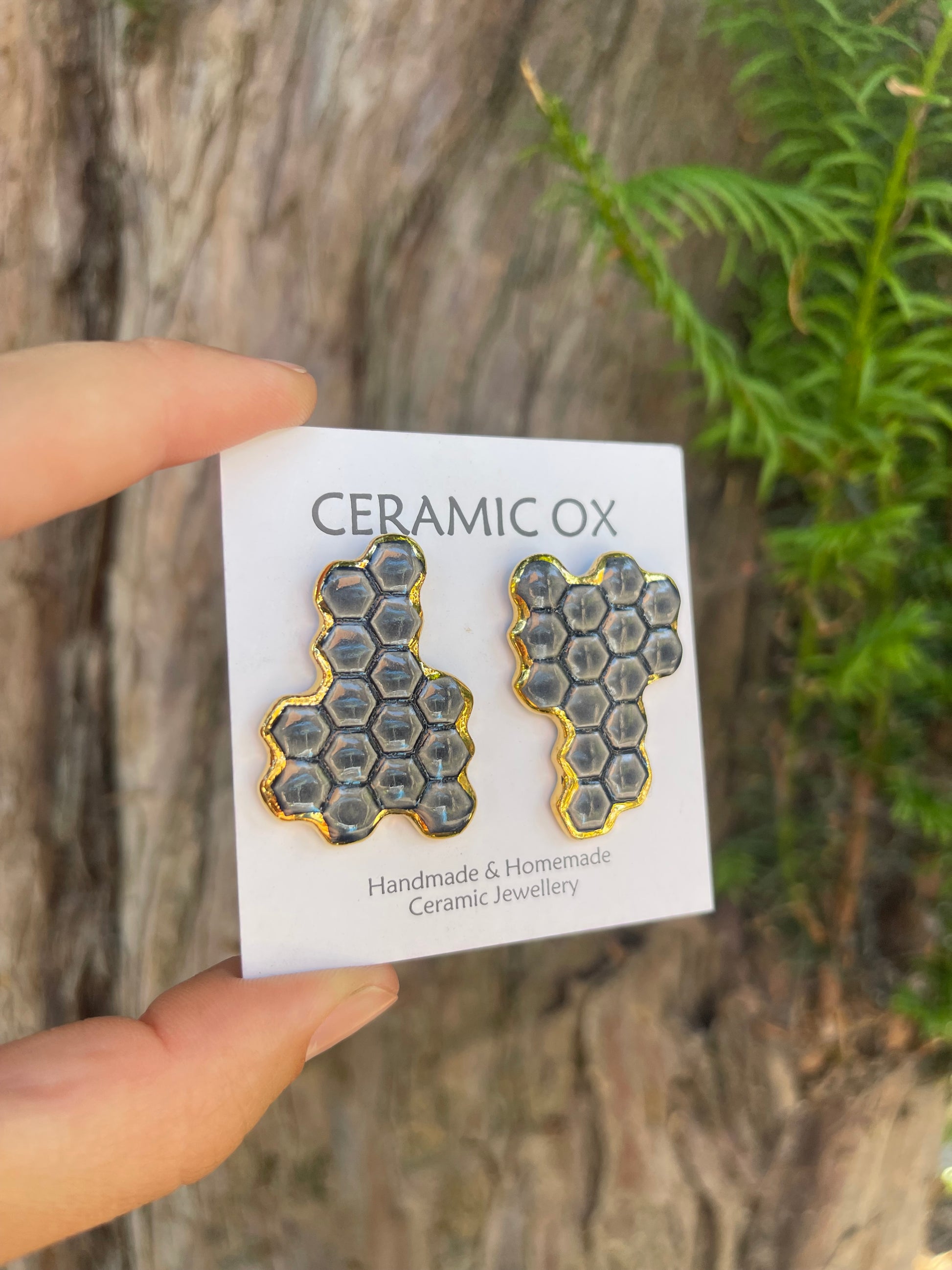 Handmade, homemade, ceramic earrings. Glazed high fire earthenware ceramic earrings fired at over 1050C with 24k gold lustre design.