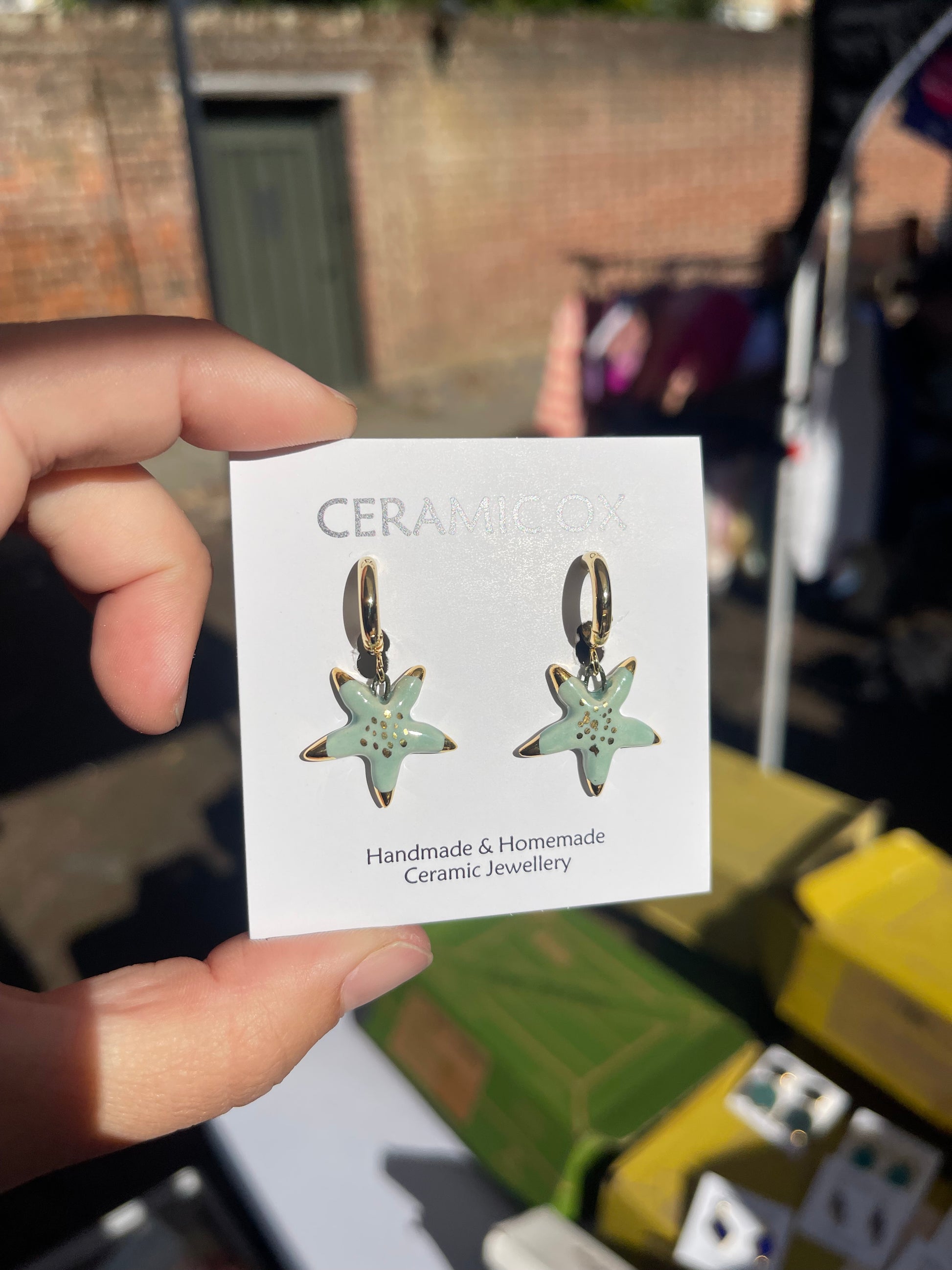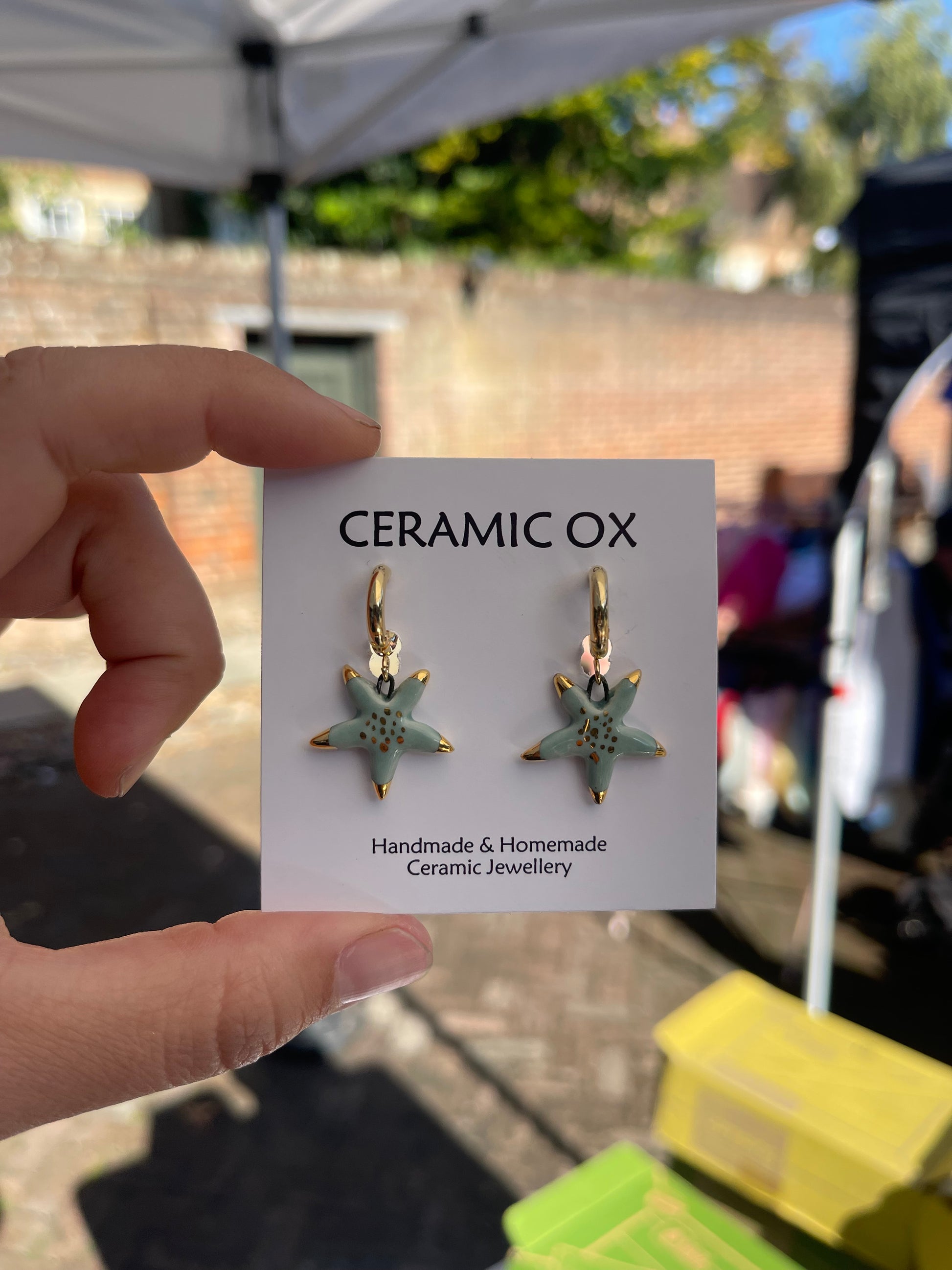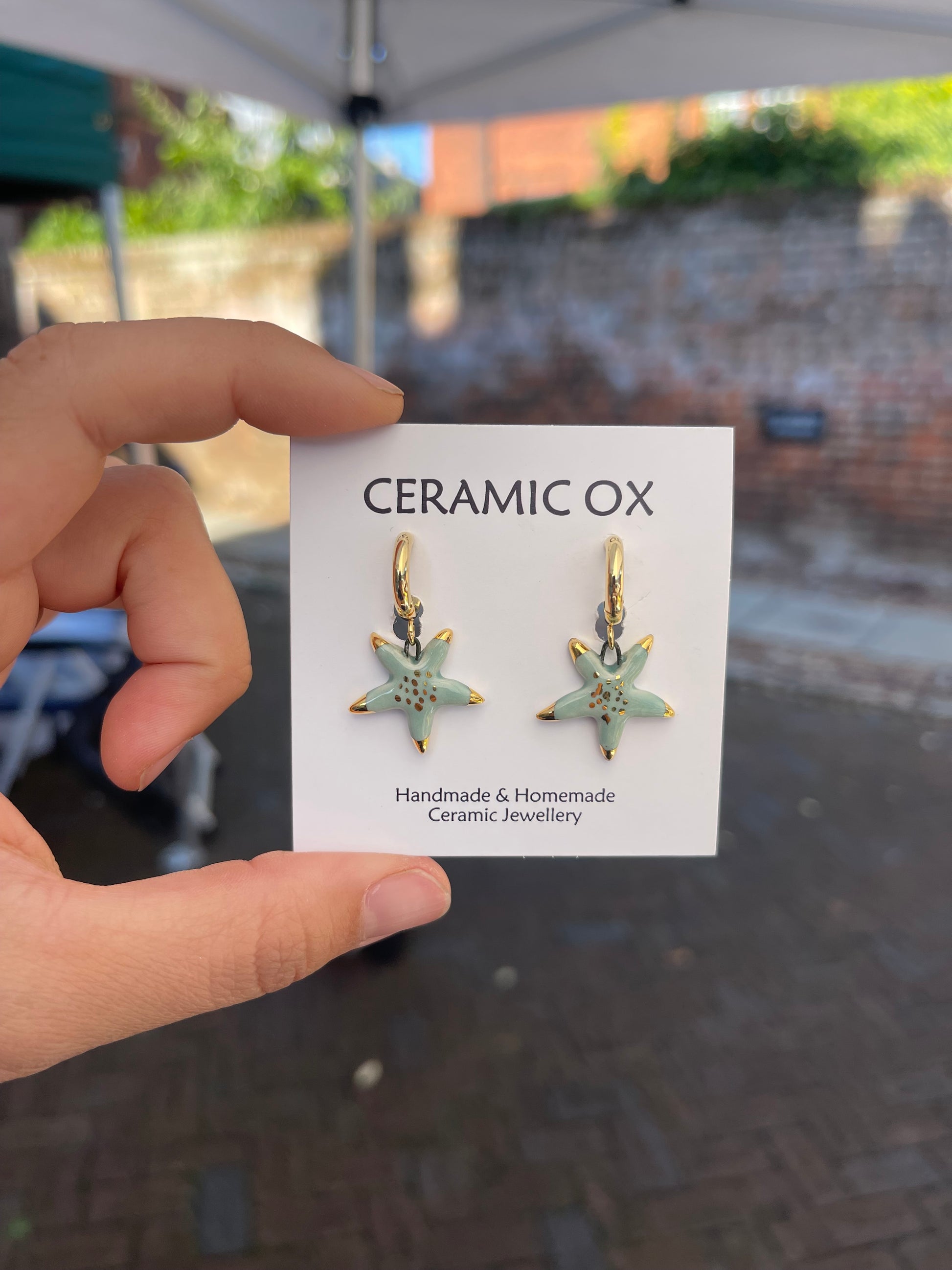 Handmade, homemade, ceramic earrings. Glazed high fire earthenware ceramic earrings fired at over 1050C with 24k gold lustre design.