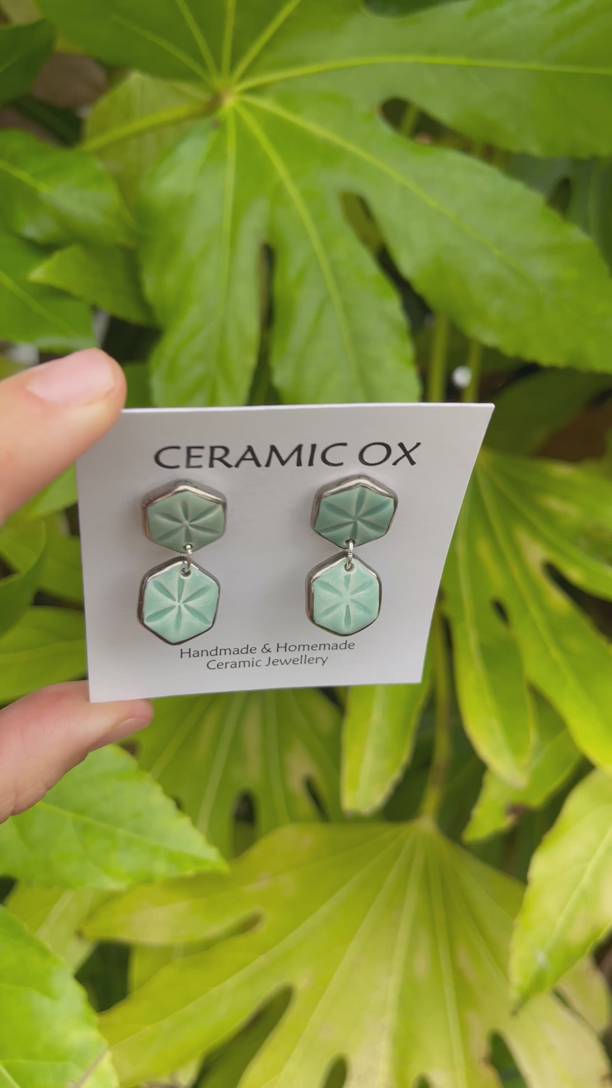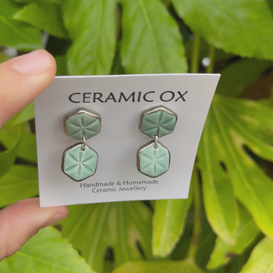 Handmade, homemade, ceramic earrings. Glazed high fire earthenware ceramic earrings fired at over 1100 Celsius with Platinum silver lustre design.