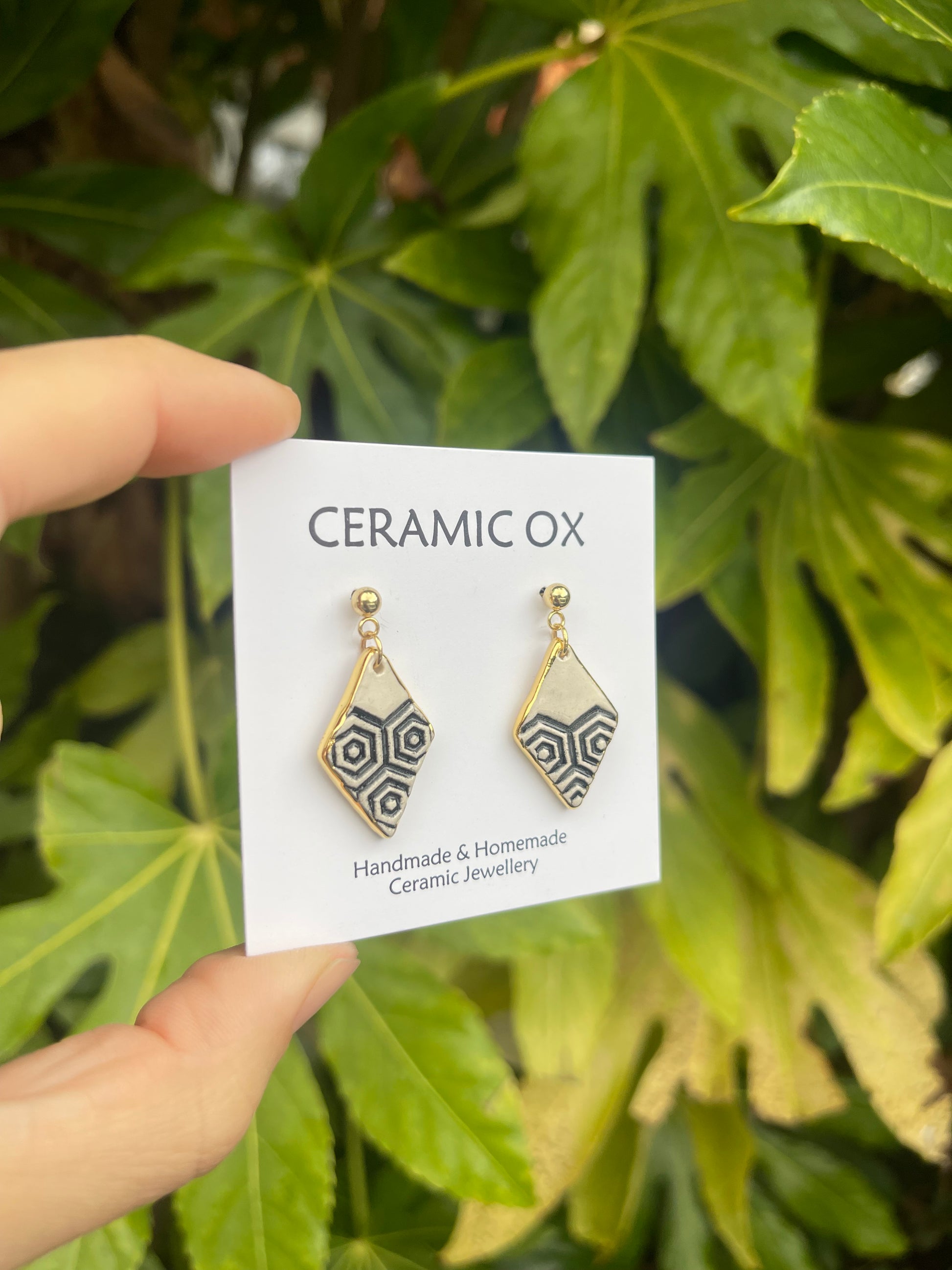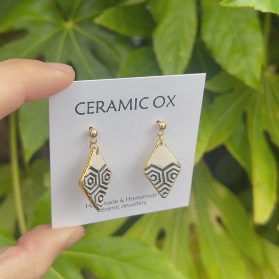 Handmade, homemade, ceramic earrings. Glazed high fire earthenware ceramic earrings fired at over 1050C with 24k gold lustre design.
