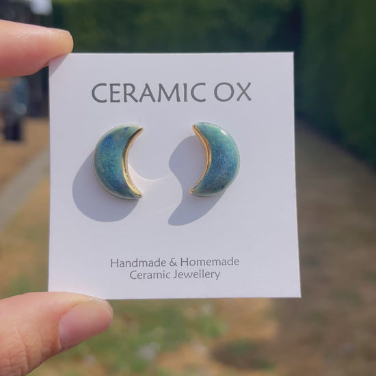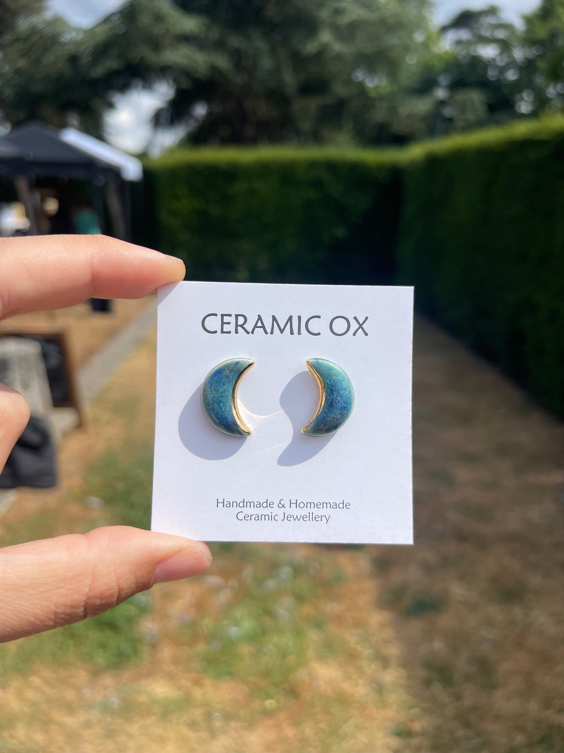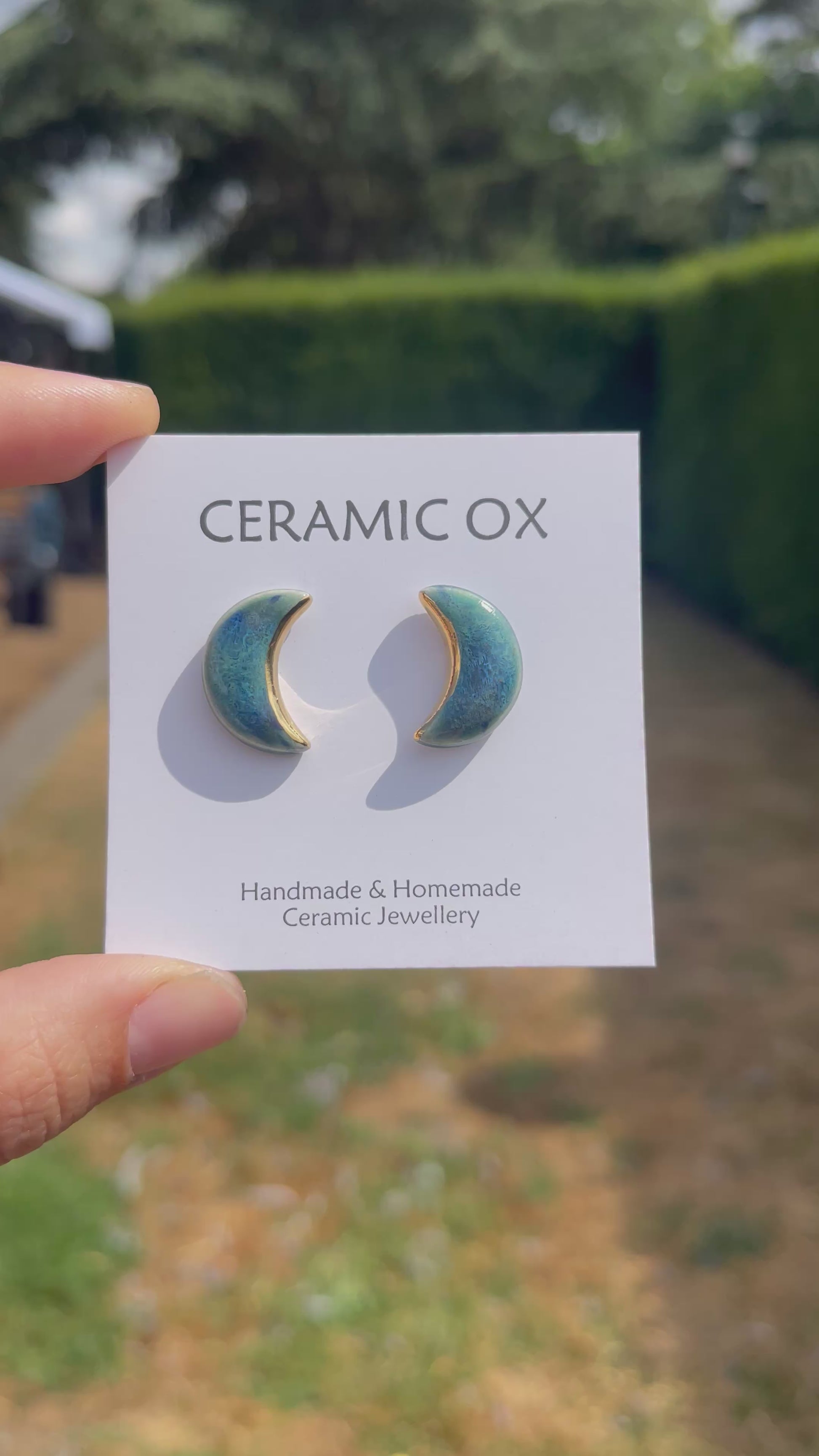 Handmade, homemade, ceramic earrings. Glazed high fire earthenware ceramic earrings fired at over 1100 with 24k gold lustre design.