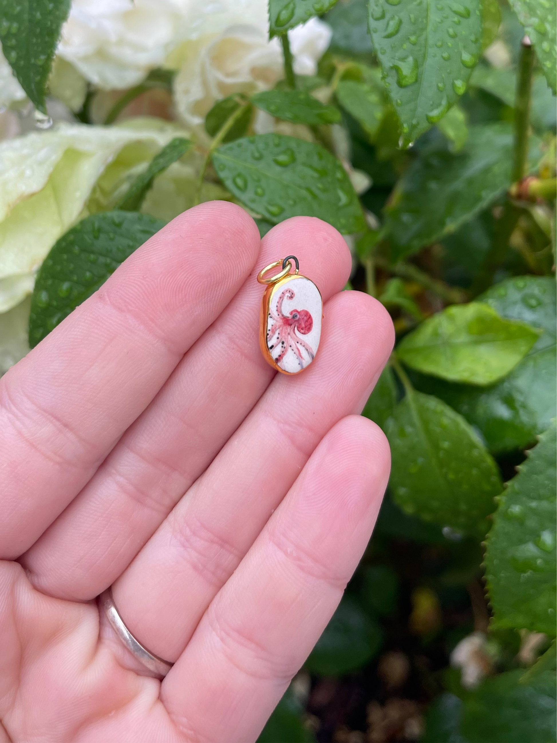 Hand painted ceramic charm. Glazed high fire earthenware ceramic charm fired at over 1100 with 24k gold lustre design.