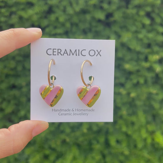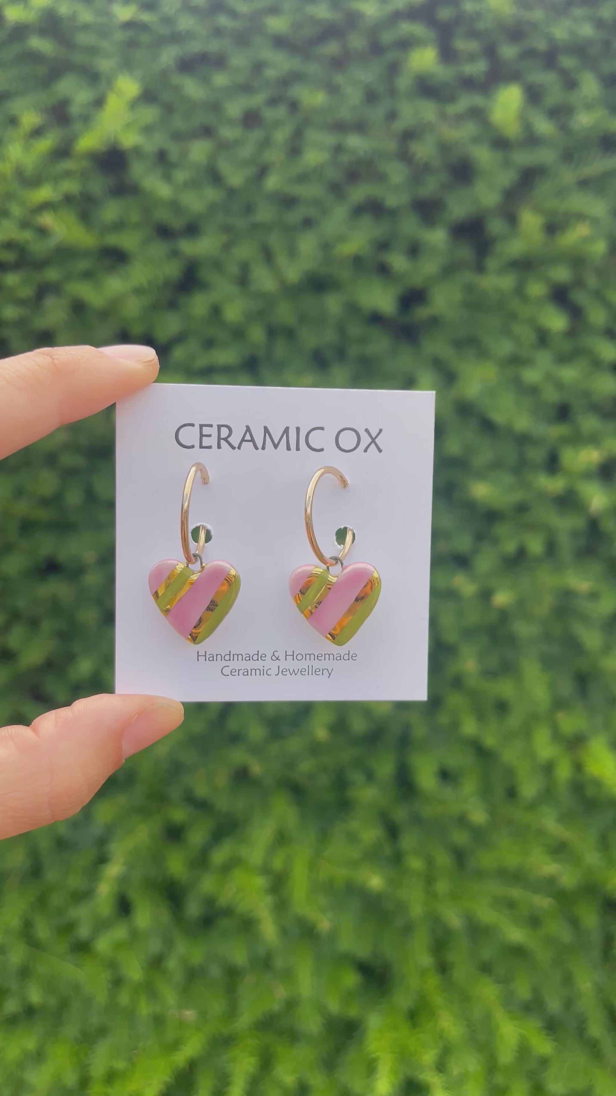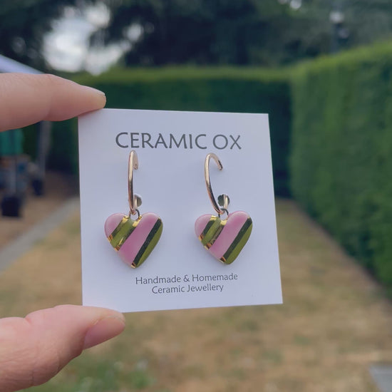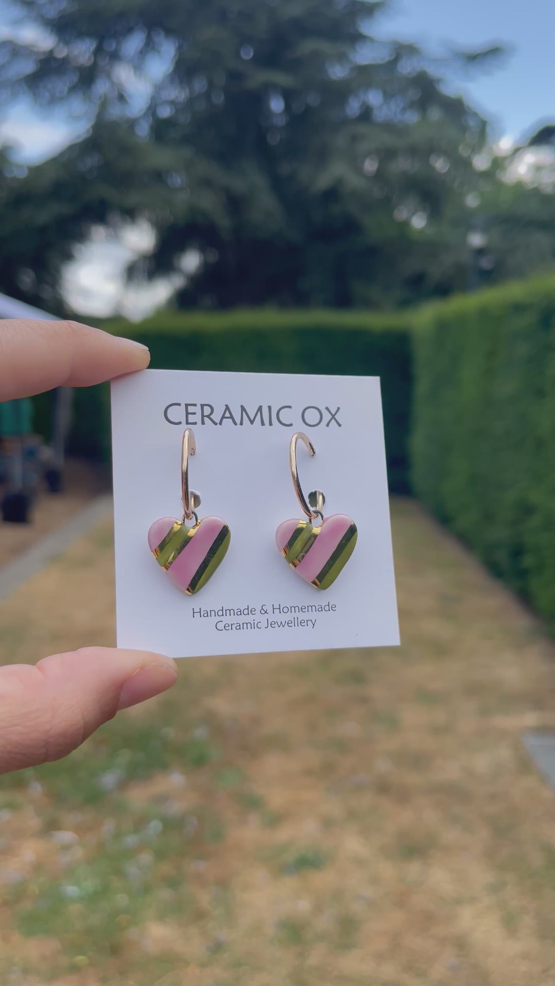Handmade, homemade, ceramic earrings. Glazed high fire earthenware ceramic earrings fired at over 1050C with 24k gold lustre design.