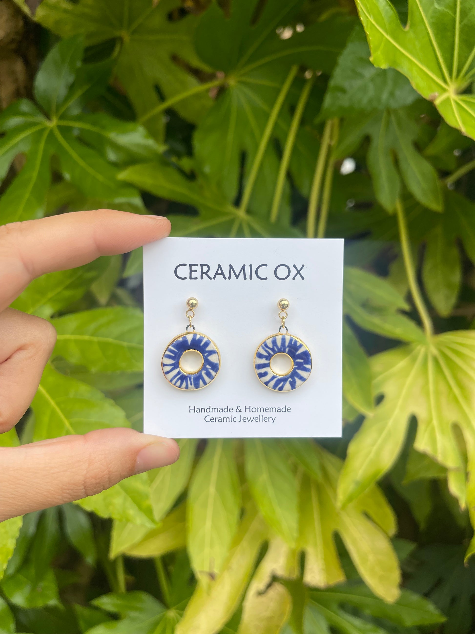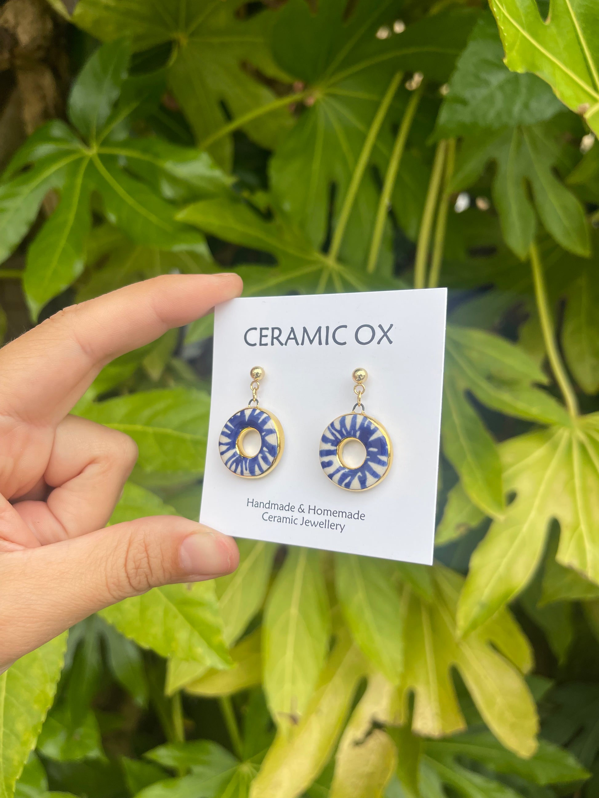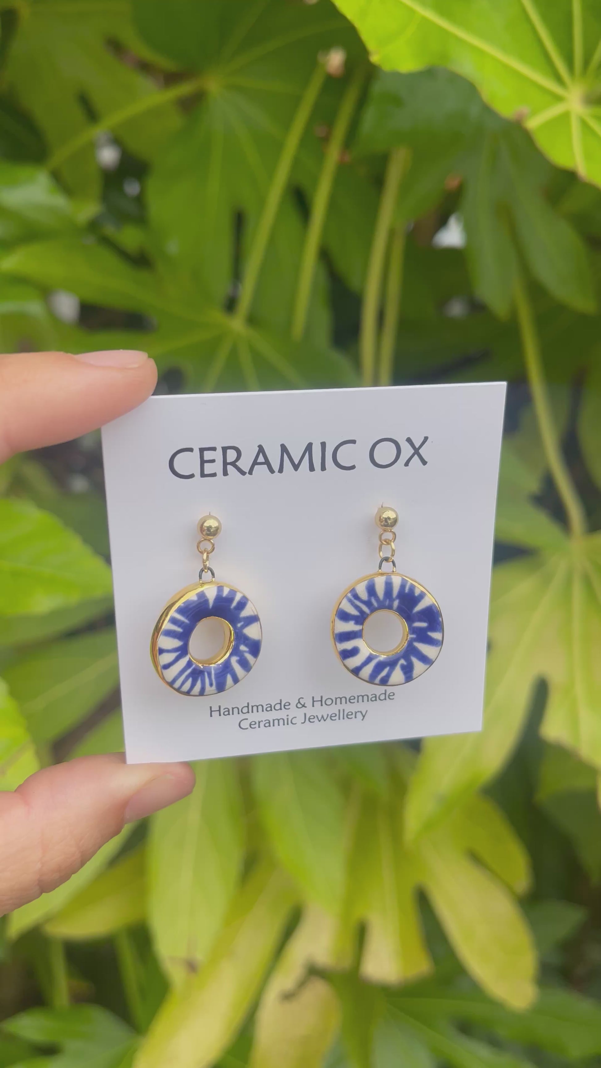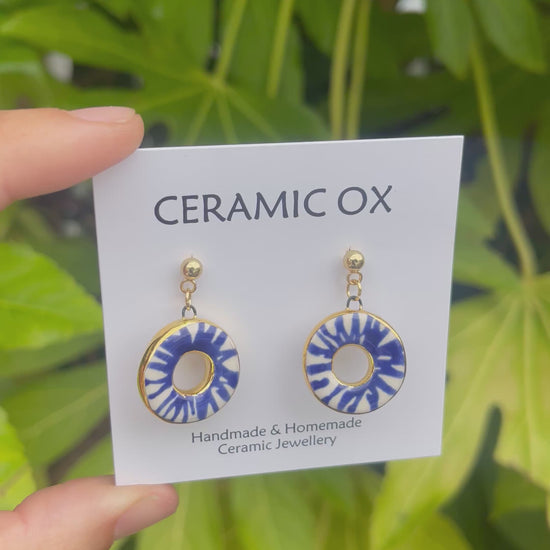 Handmade, homemade, ceramic earrings. Glazed high fire earthenware ceramic earrings fired at over 1100 with 24k gold lustre design.