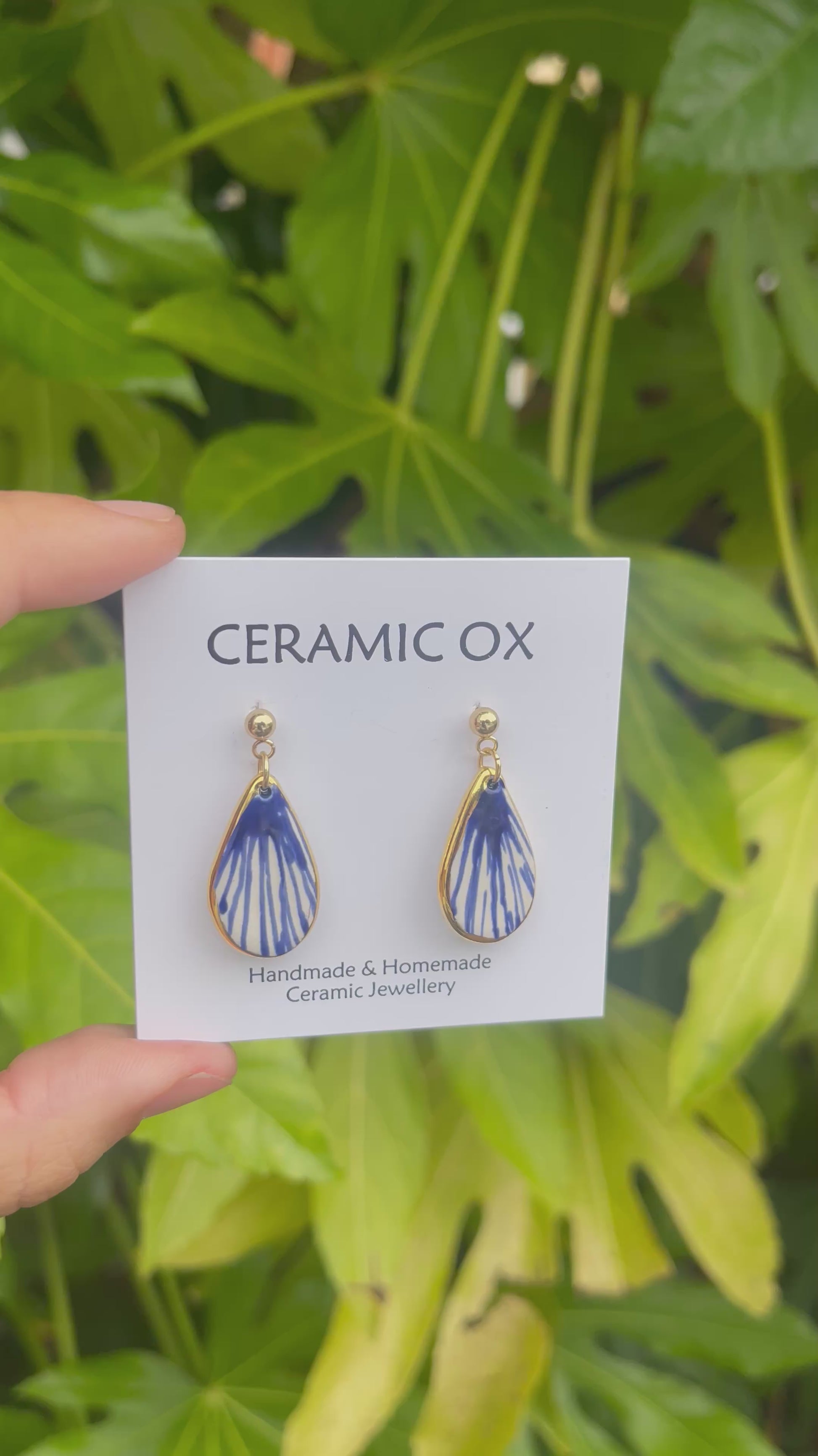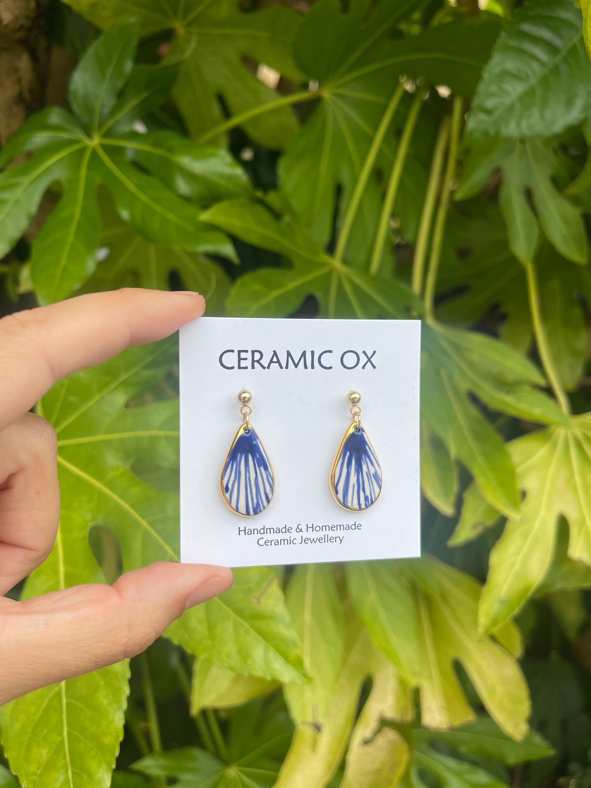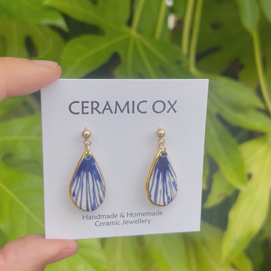 Handmade, homemade, ceramic earrings. Glazed high fire earthenware ceramic earrings fired at over 1100 with 24k gold lustre design.