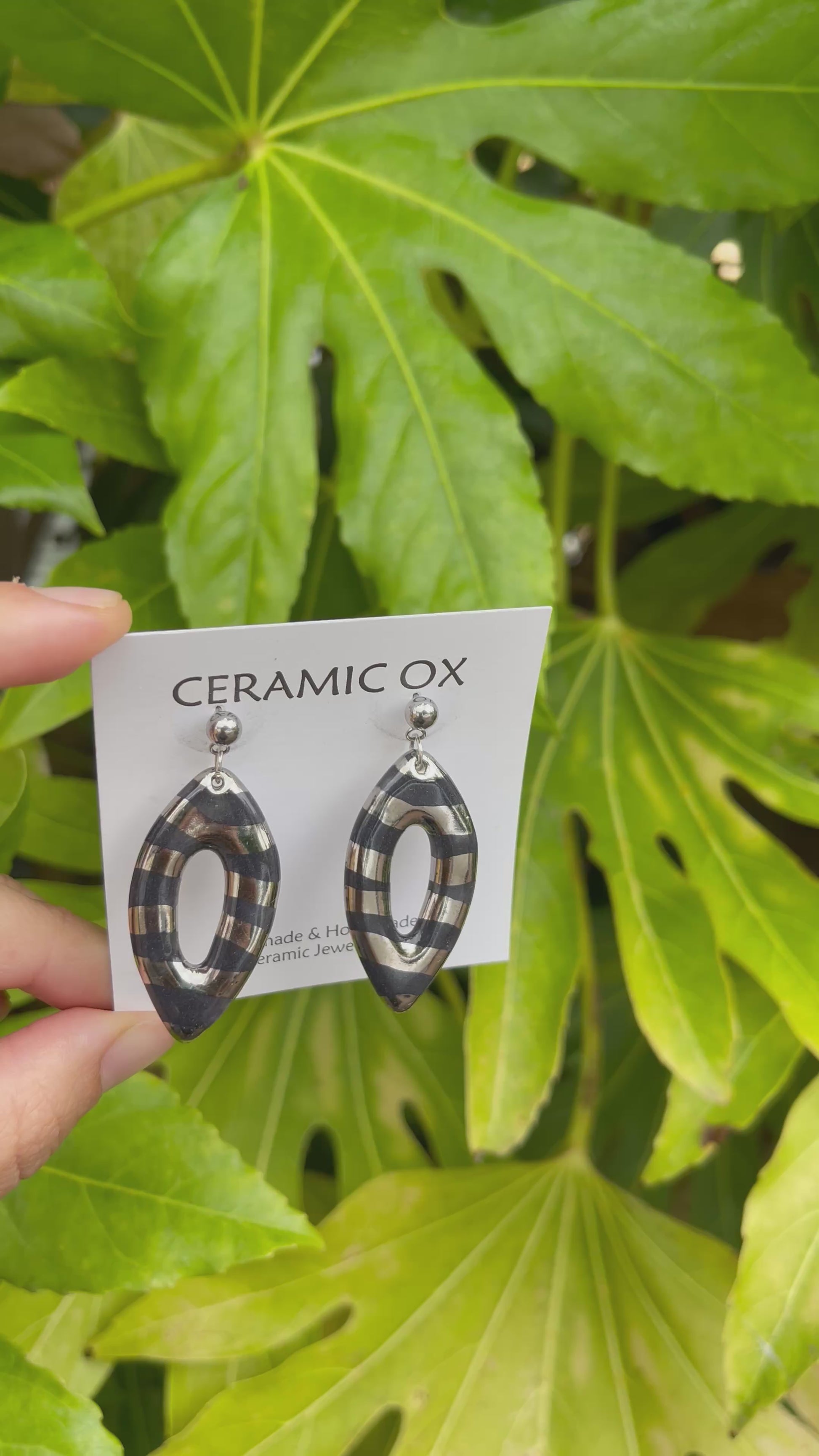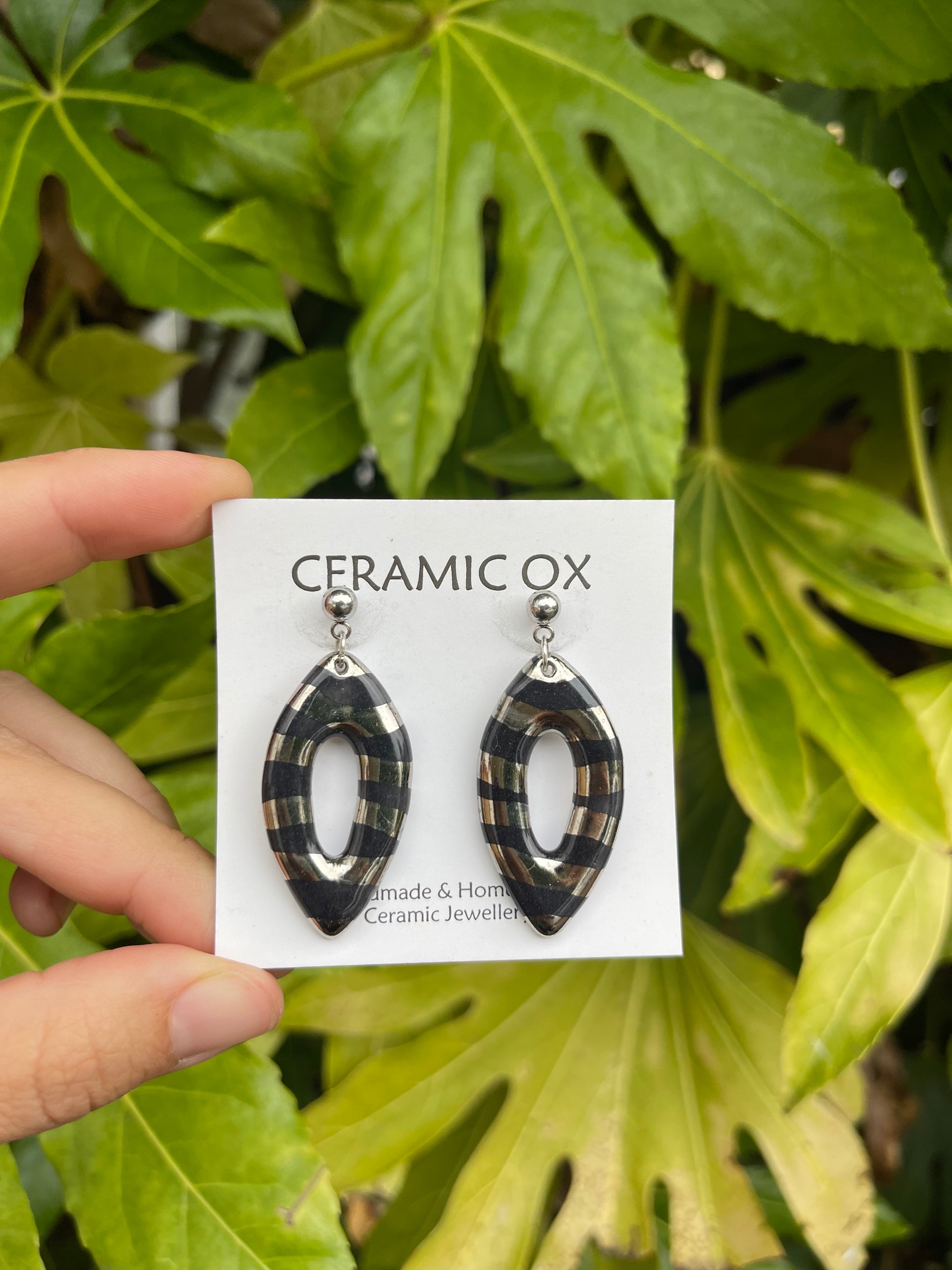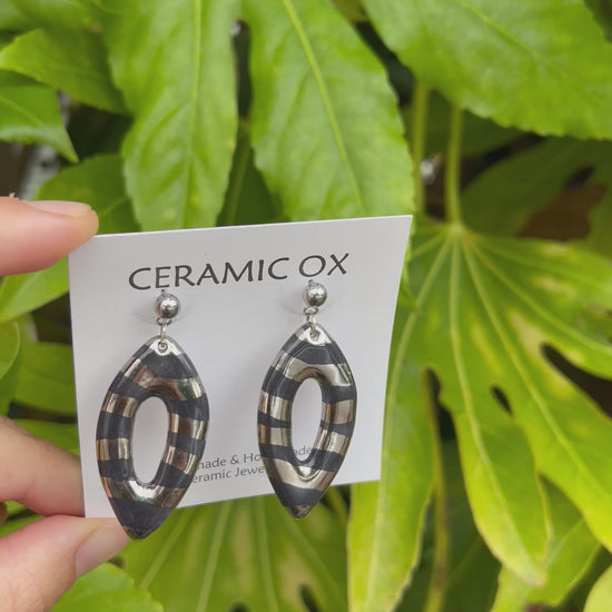 Handmade, homemade, ceramic earrings. Glazed high fire earthenware ceramic earrings fired at over 1100 Celsius with Platinum silver lustre design.