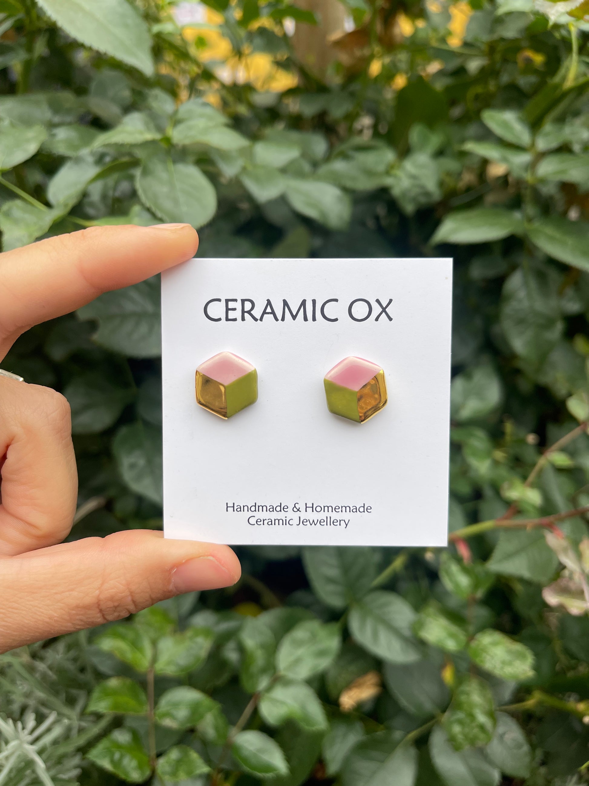 Small hexagon cube studs in Olive/ pink