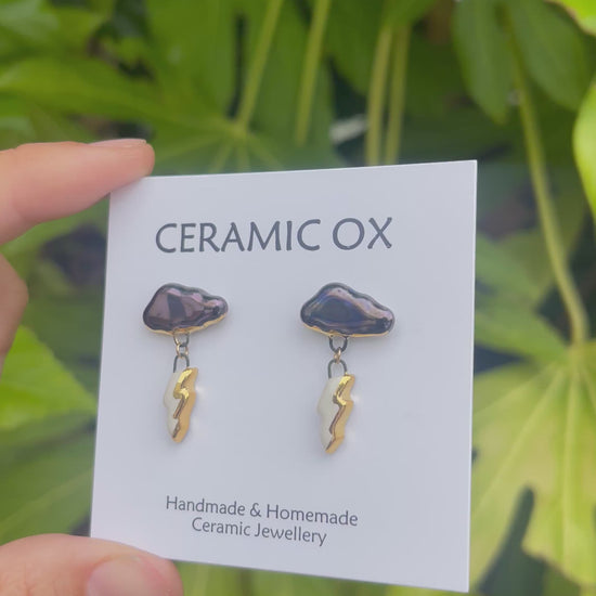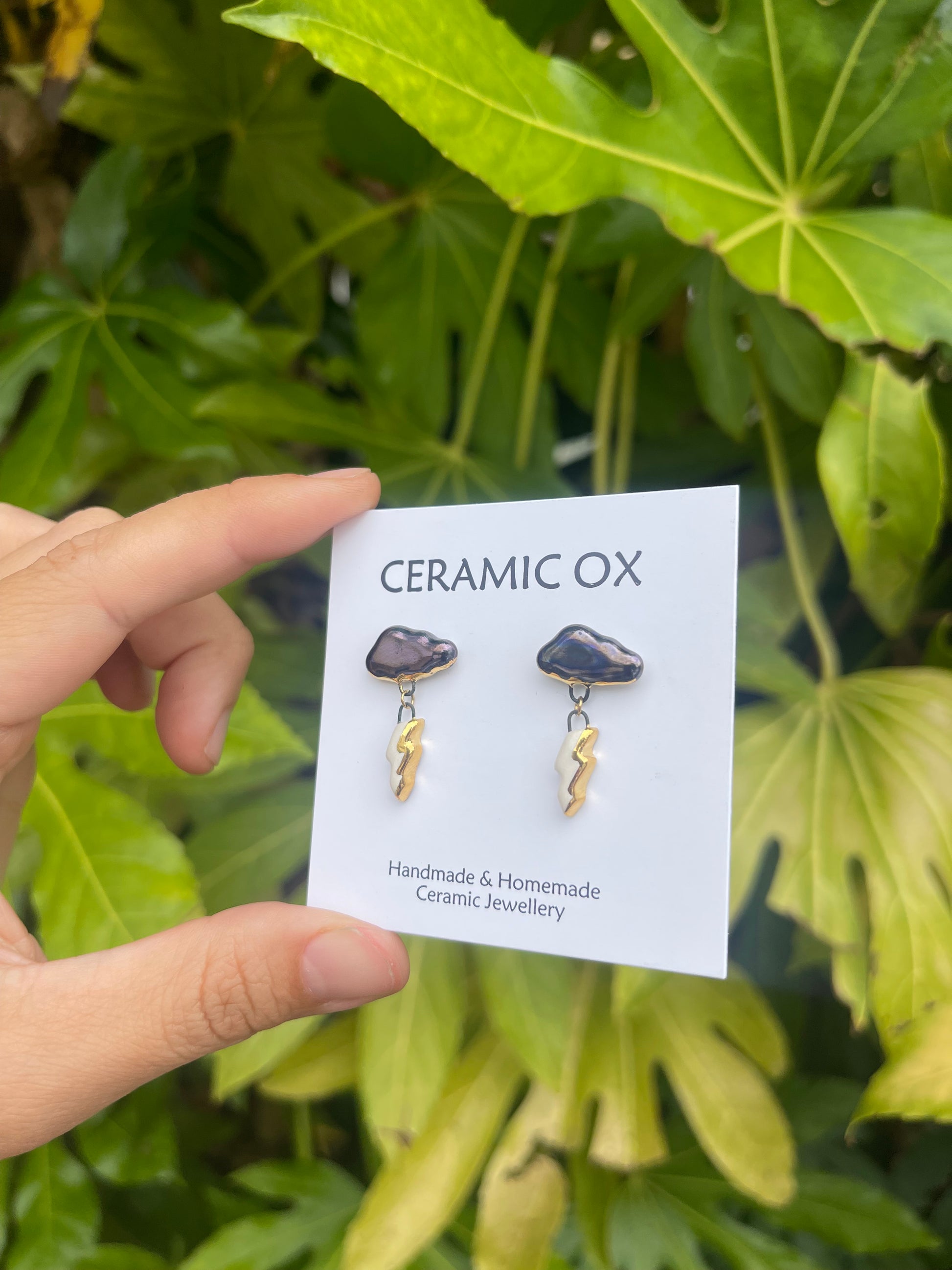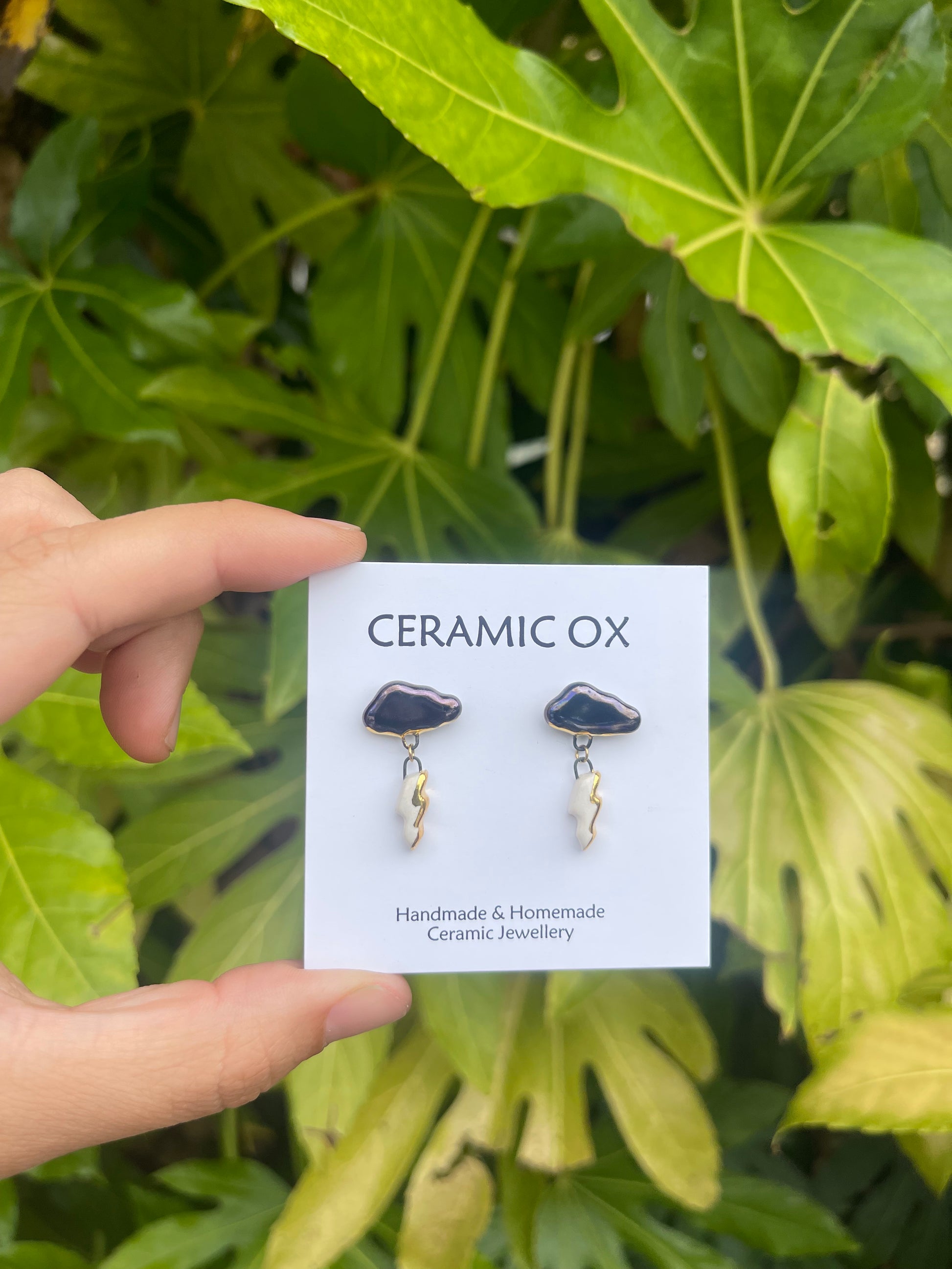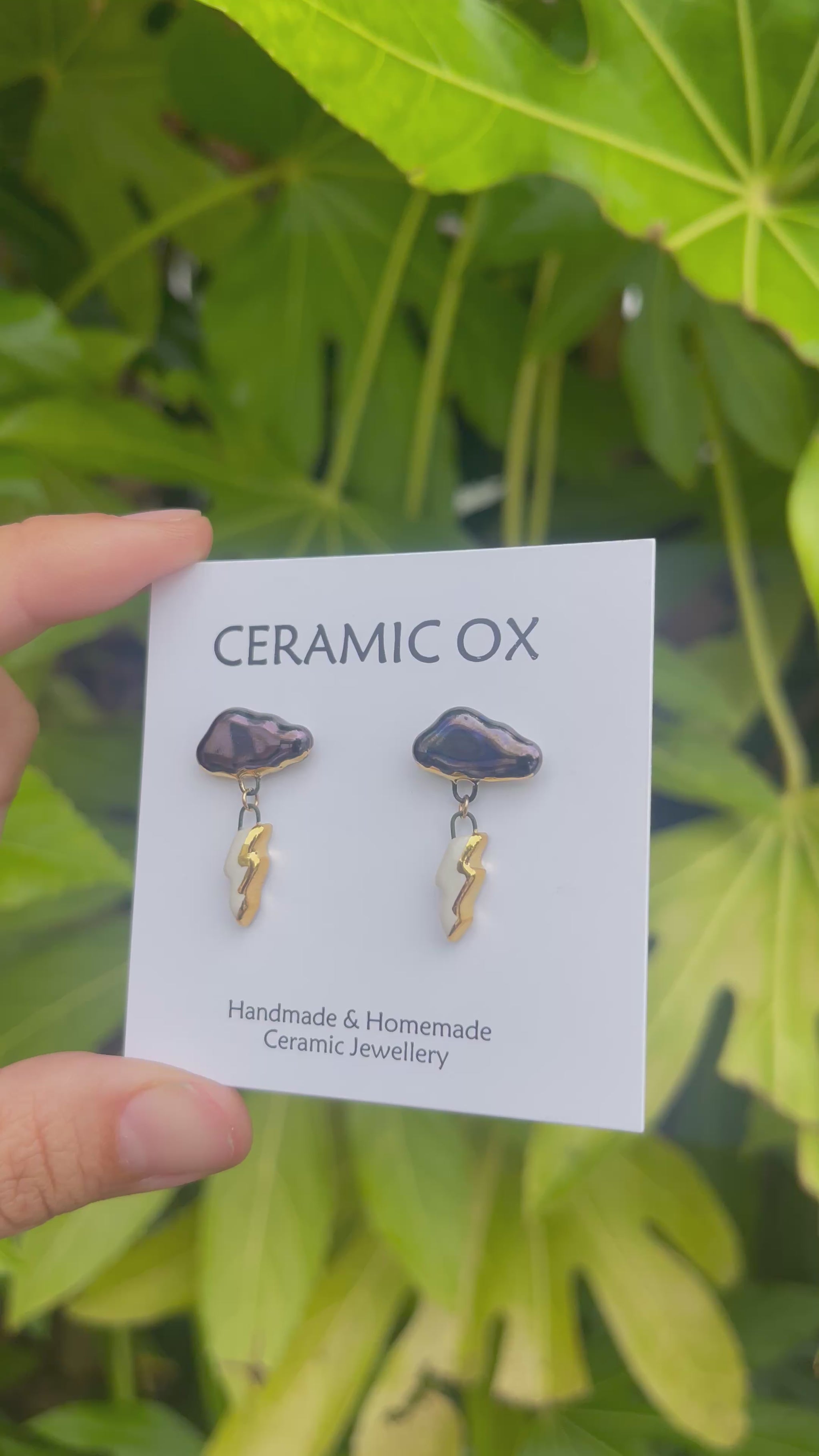 Handmade, homemade, ceramic earrings. Glazed high fire earthenware ceramic earrings fired at over 1100 with 24k gold lustre design.