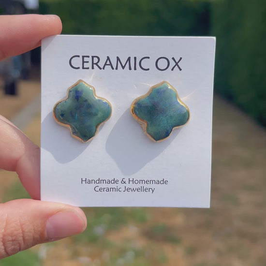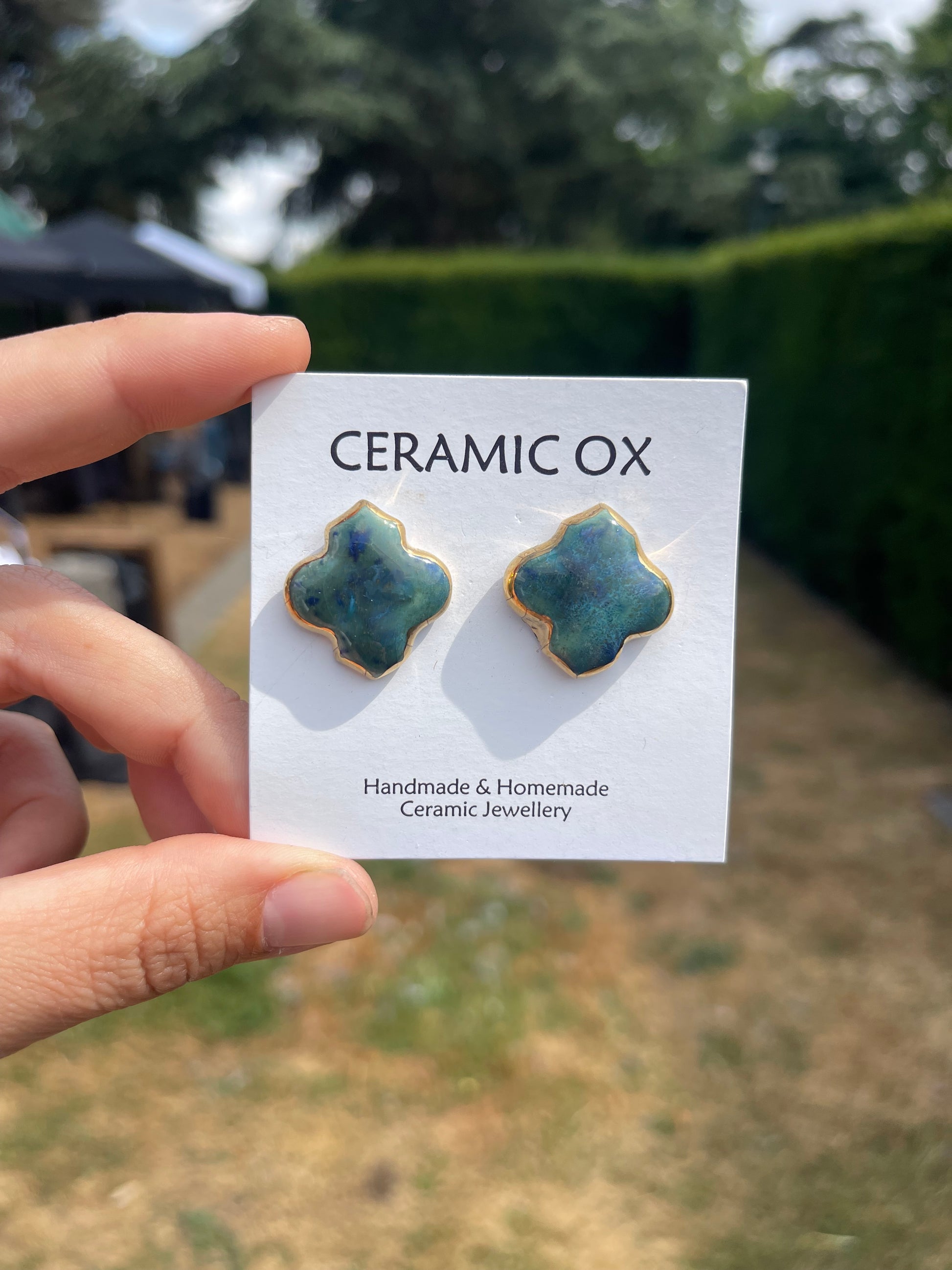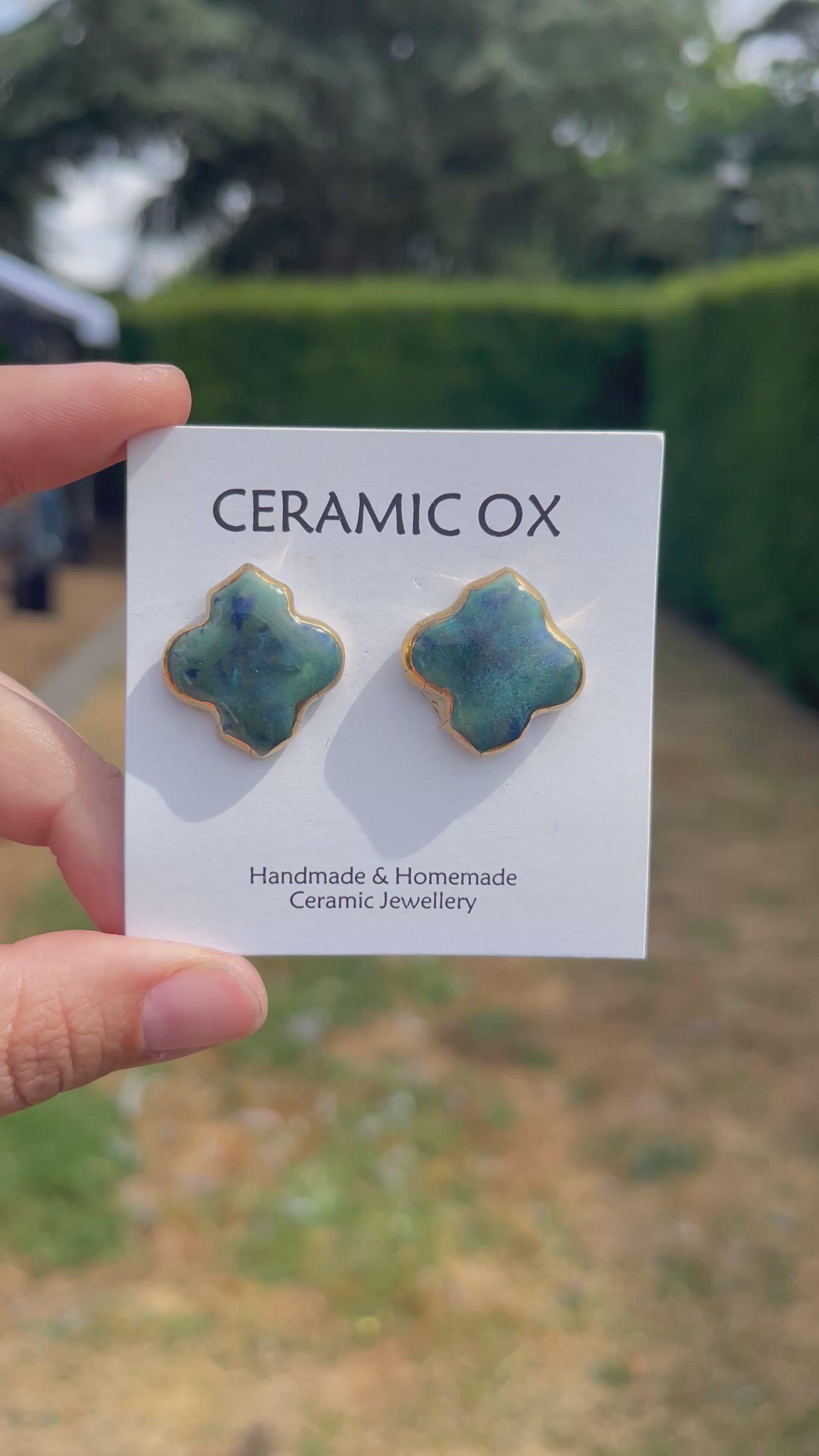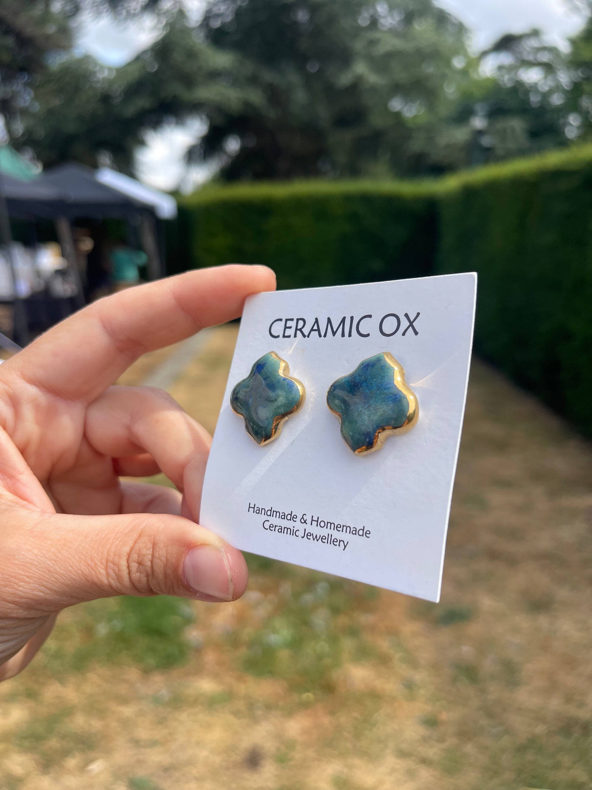 Handmade, homemade, ceramic earrings. Glazed high fire earthenware ceramic earrings fired at over 1100 with 24k gold lustre design.
