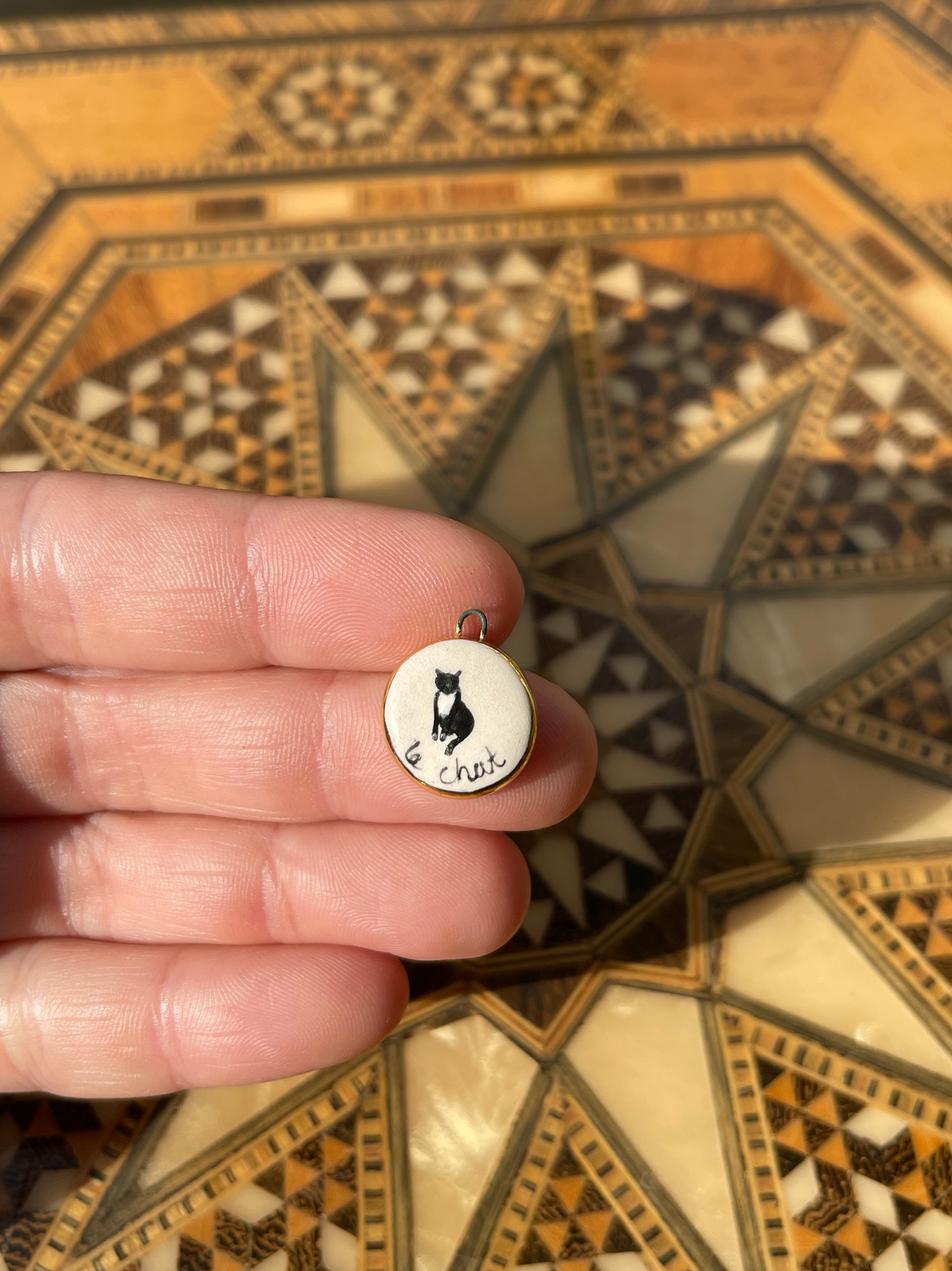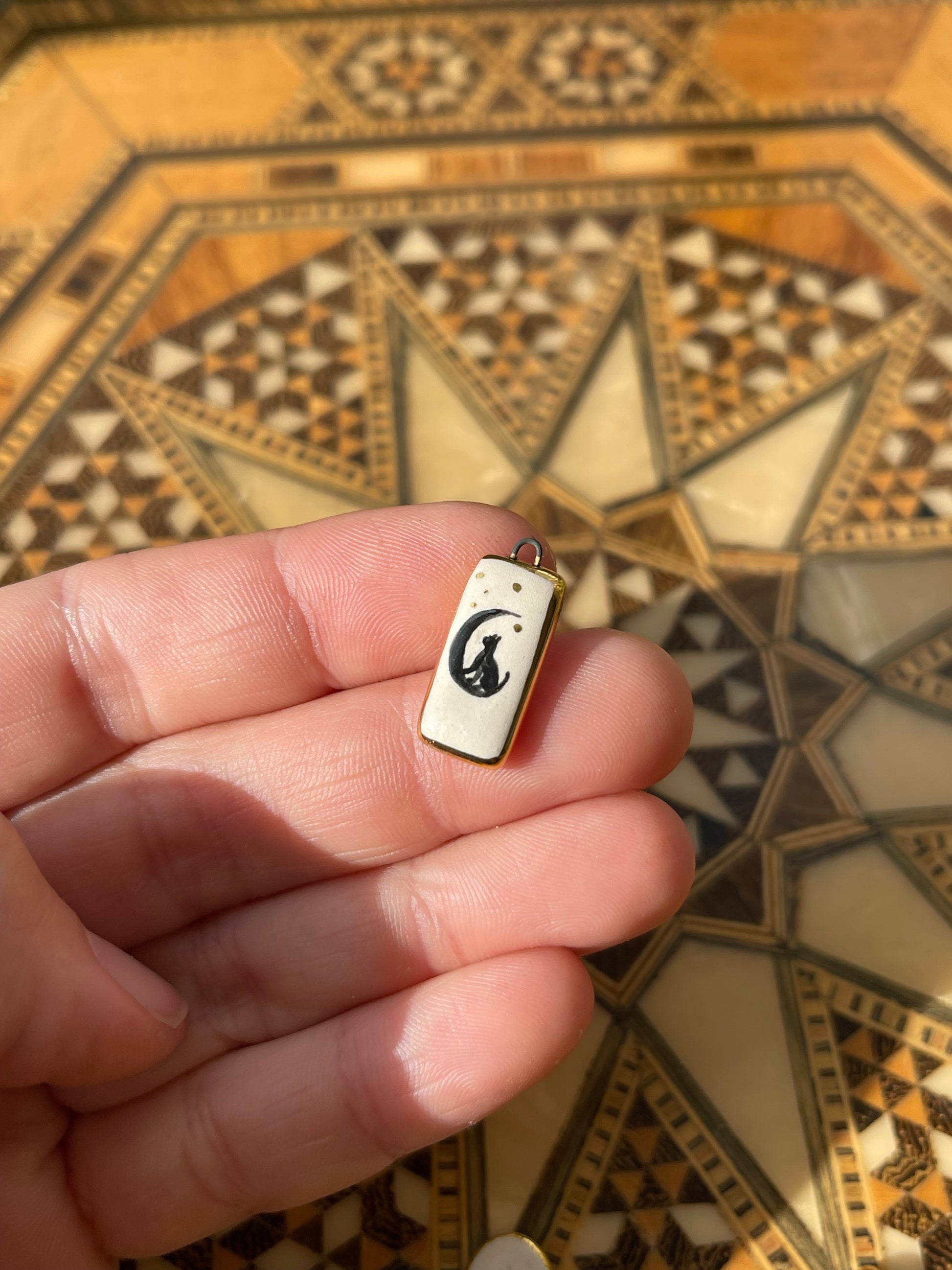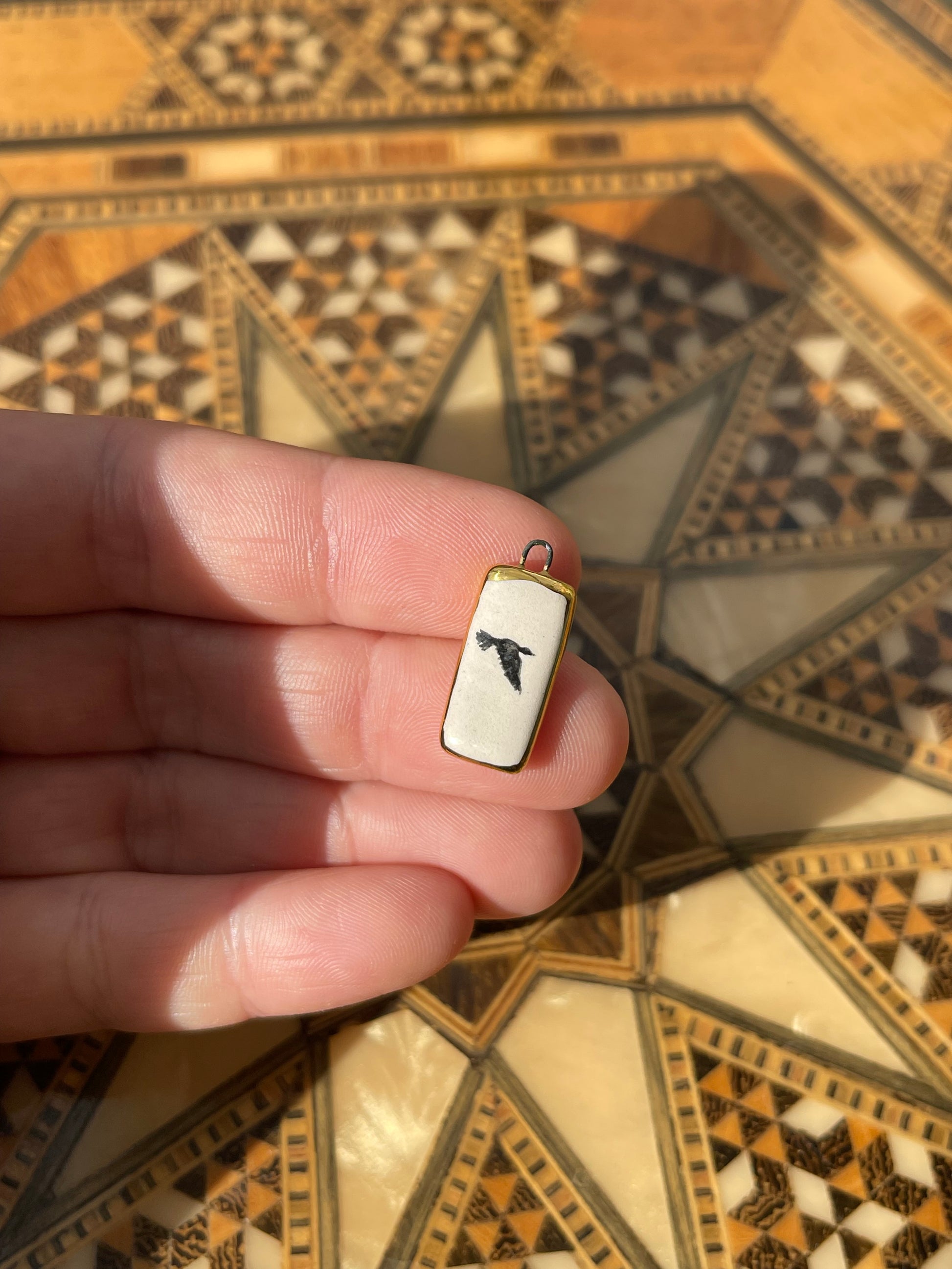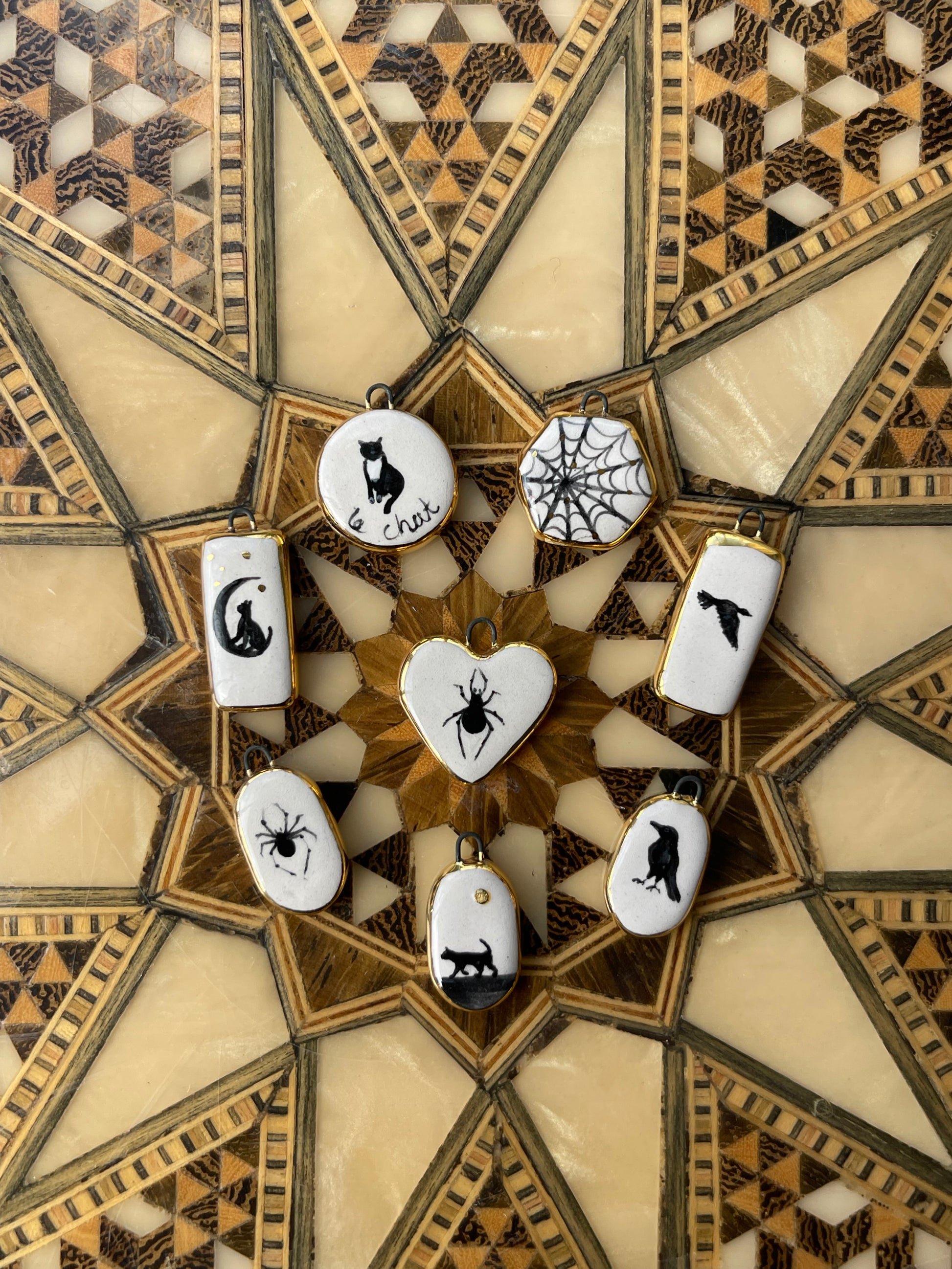 Hand painted ceramic pendant charm. Double sided, glazed high fire earthenware ceramics fired at over 1050C with 24k gold lustre design.