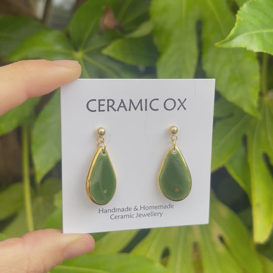 Handmade, homemade, ceramic earrings. Glazed high fire earthenware ceramic earrings fired at over 1100C with 24k gold lustre design.