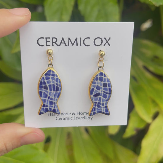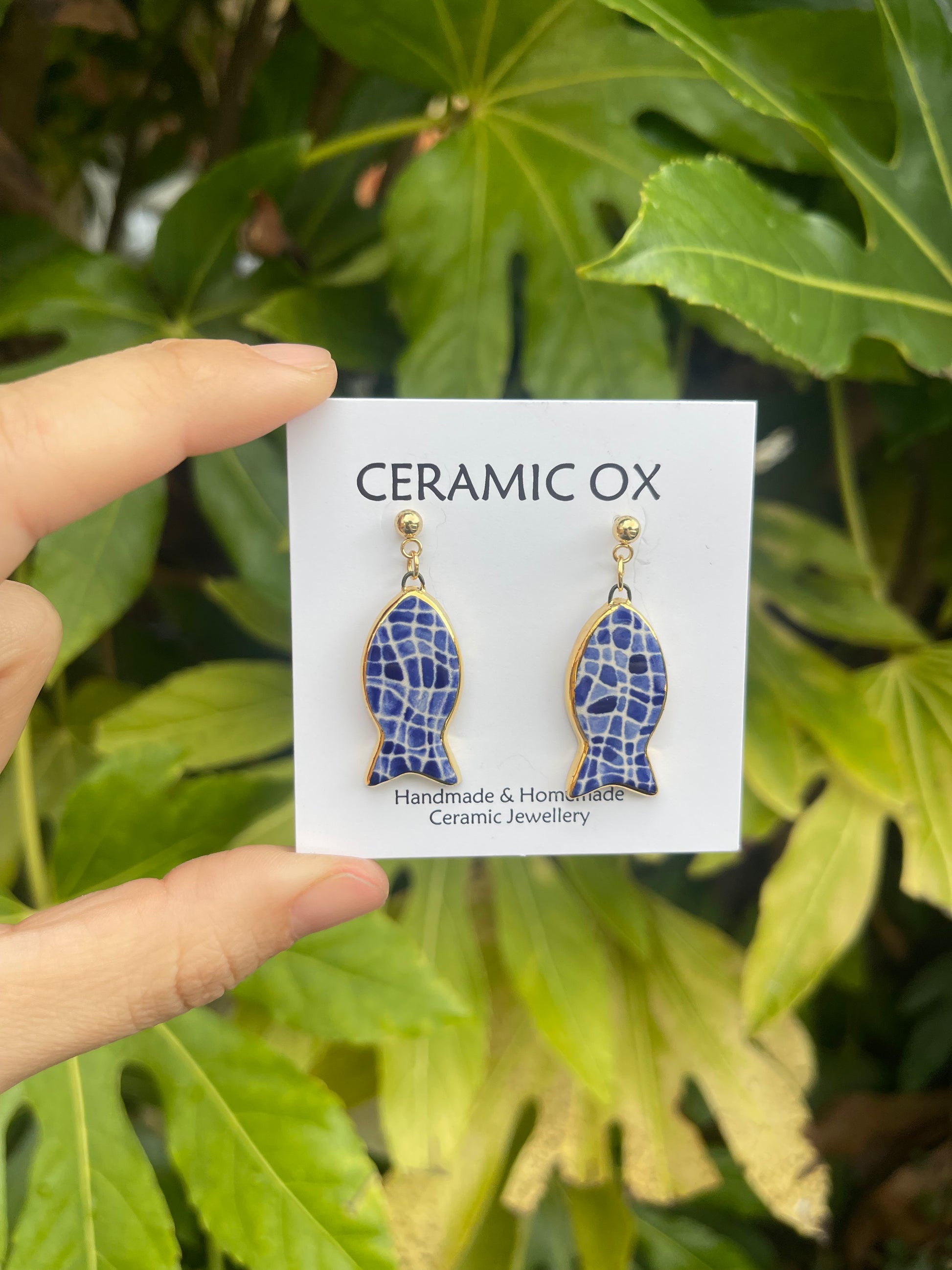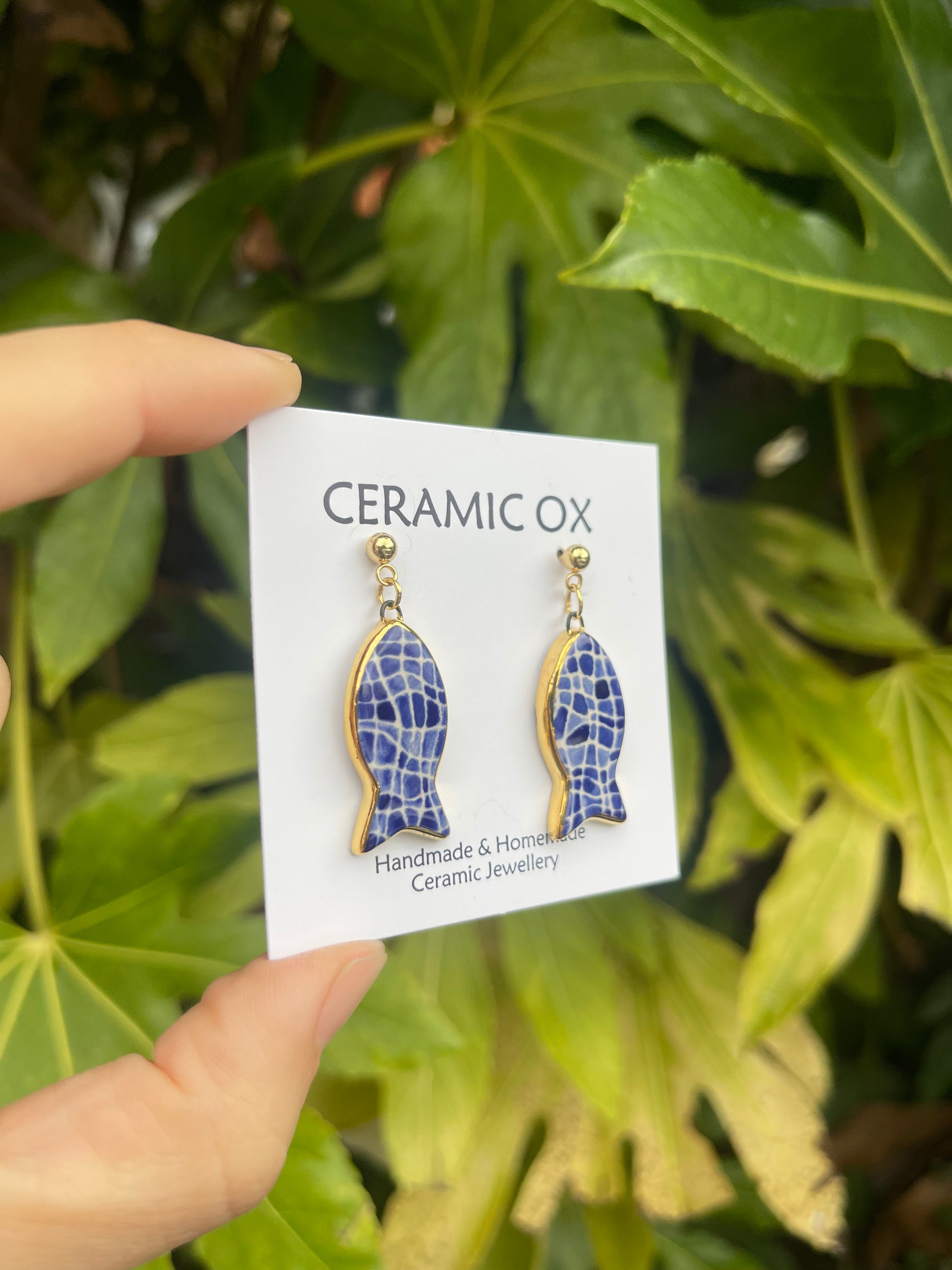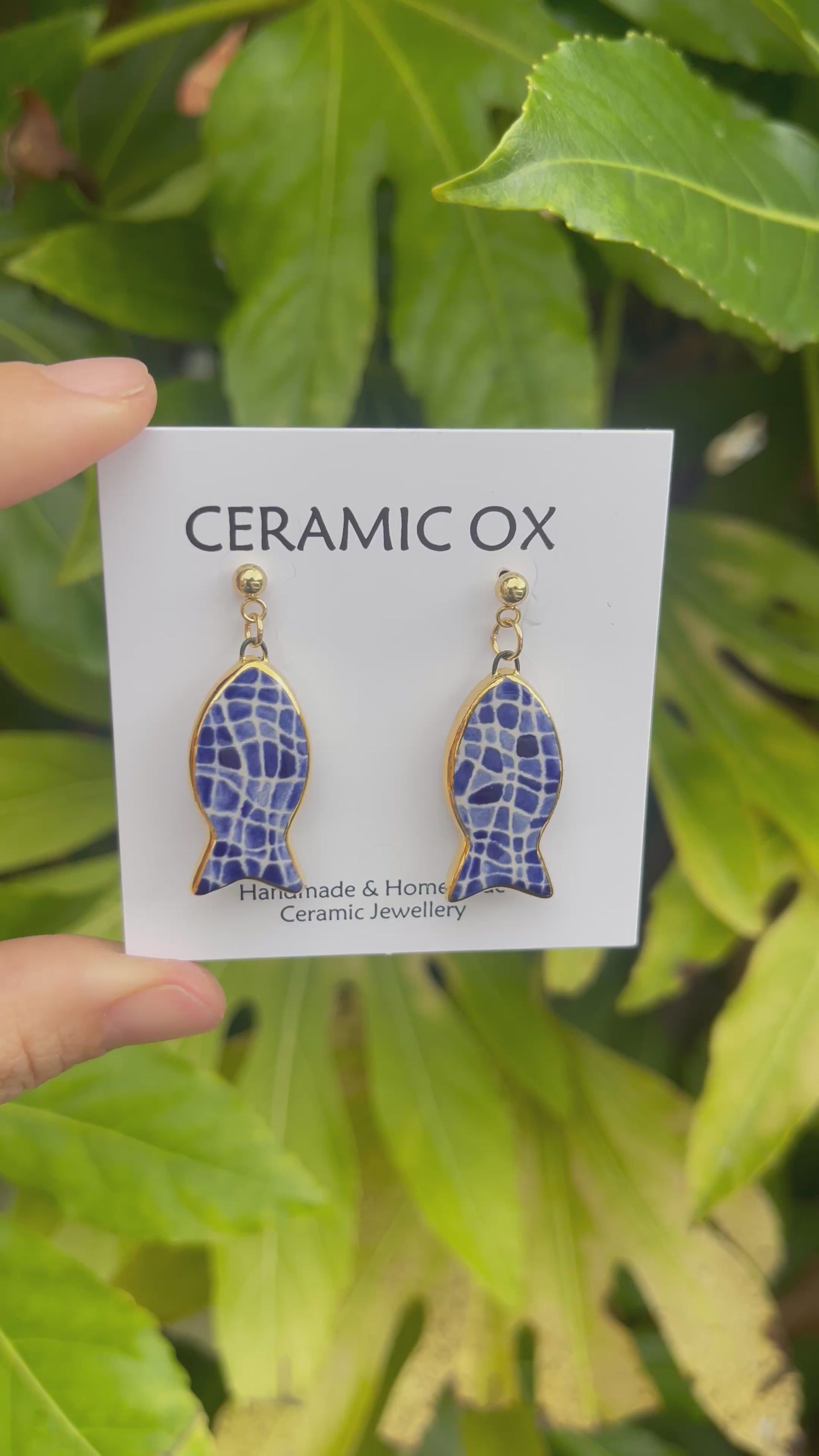 Handmade, homemade, ceramic earrings. Glazed high fire earthenware ceramic earrings fired at over 1050C with 24k gold lustre design.