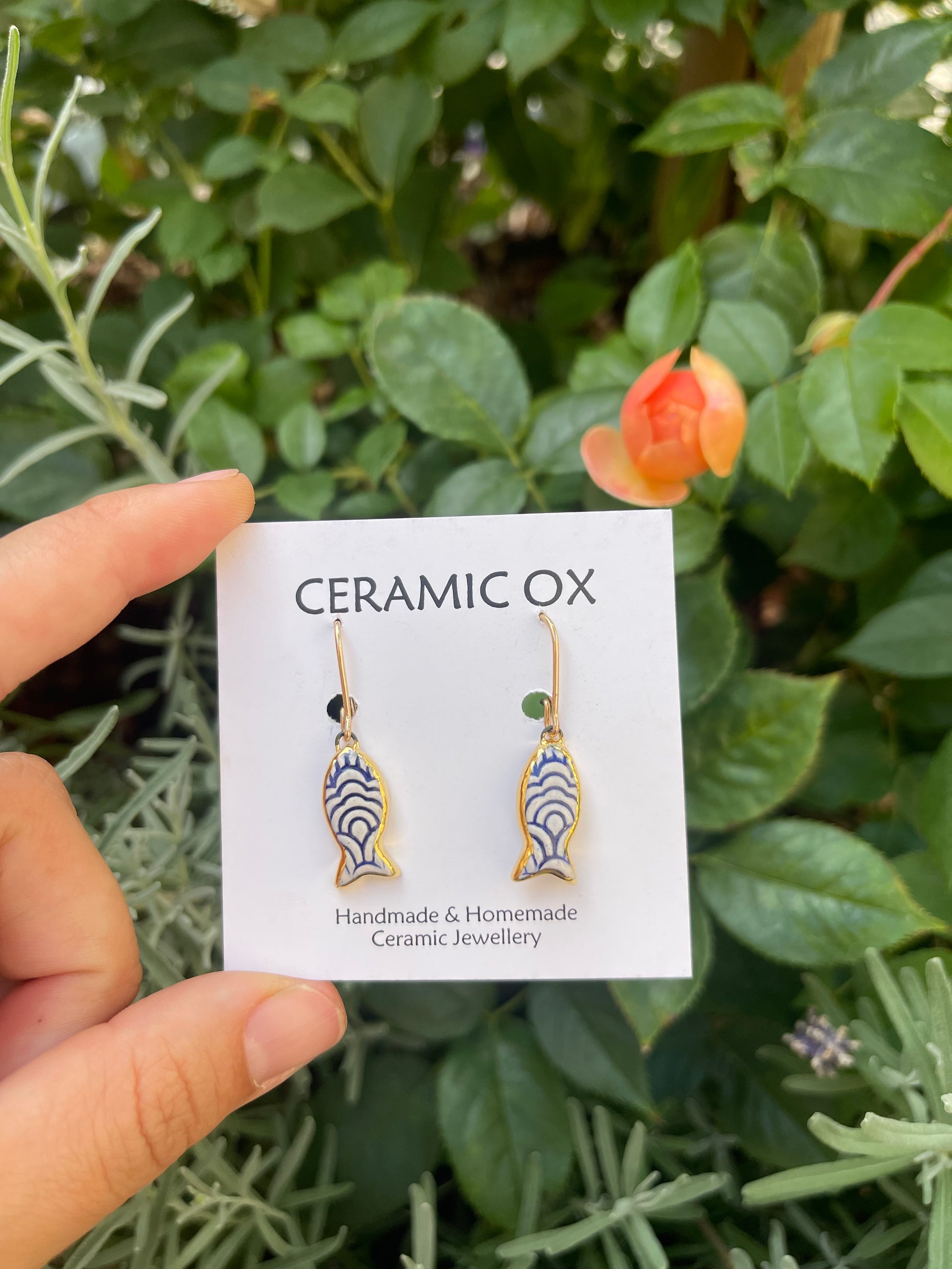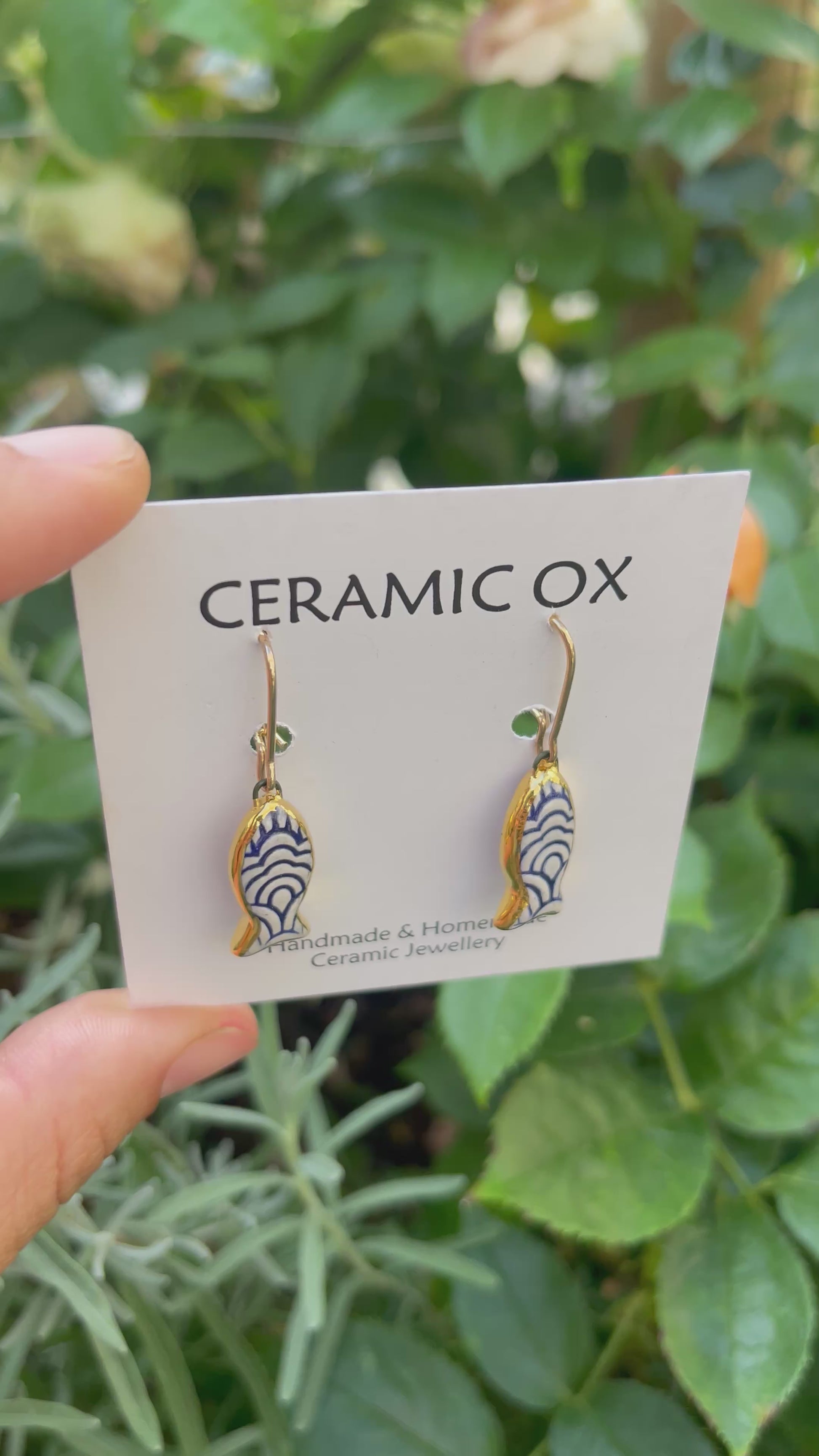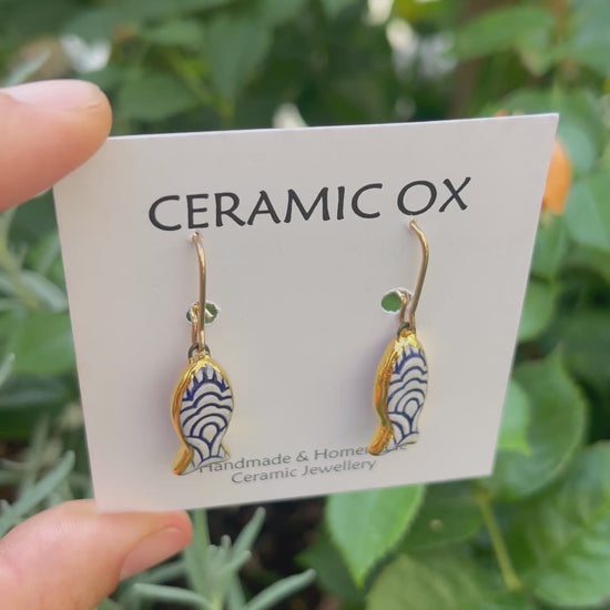Handmade, homemade, ceramic earrings. Glazed high fire earthenware ceramic earrings fired at over 1050C with 24k gold lustre design.